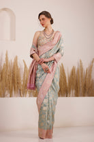A pistachio and blush pink jangla saree discovers its ideal complement in a high-quality brocade applique crepe blouse, infusing a dash of brilliance and extravagance into the ensemble.