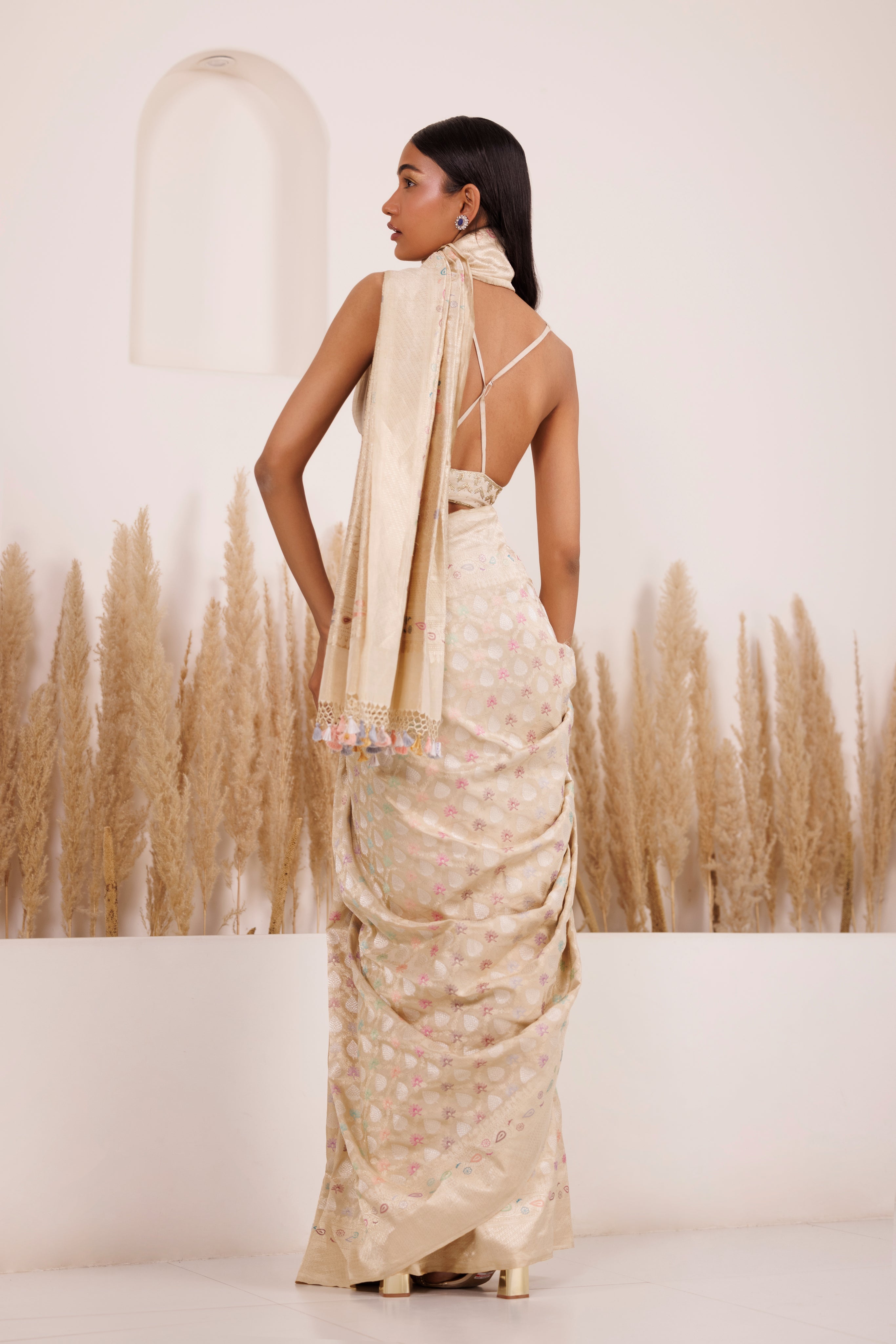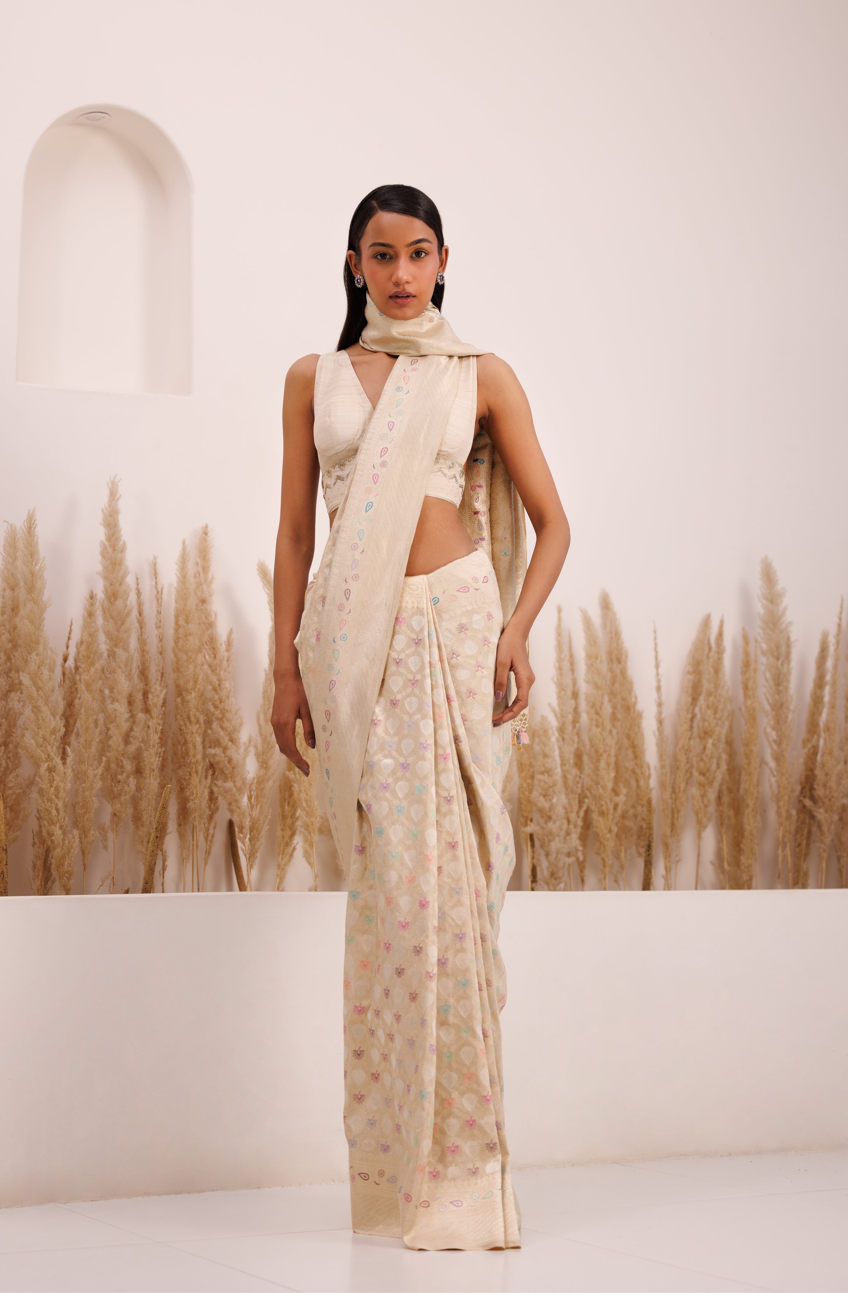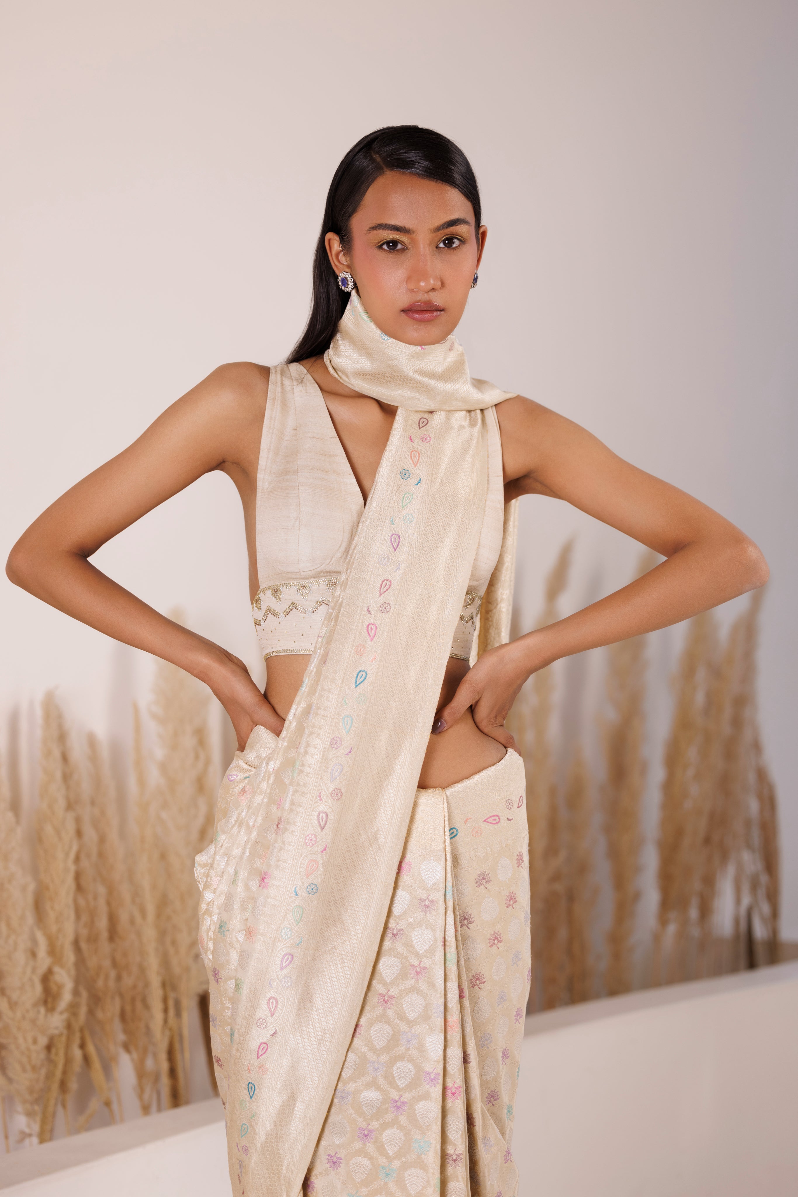 A multi-colour meena saree finds its perfect match in a premium quality crepe bralette, adorned with rhinestone that add a touch of brilliance and opulence to the ensemble.