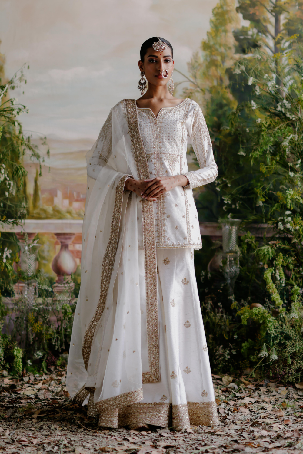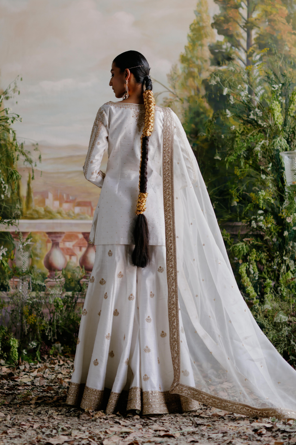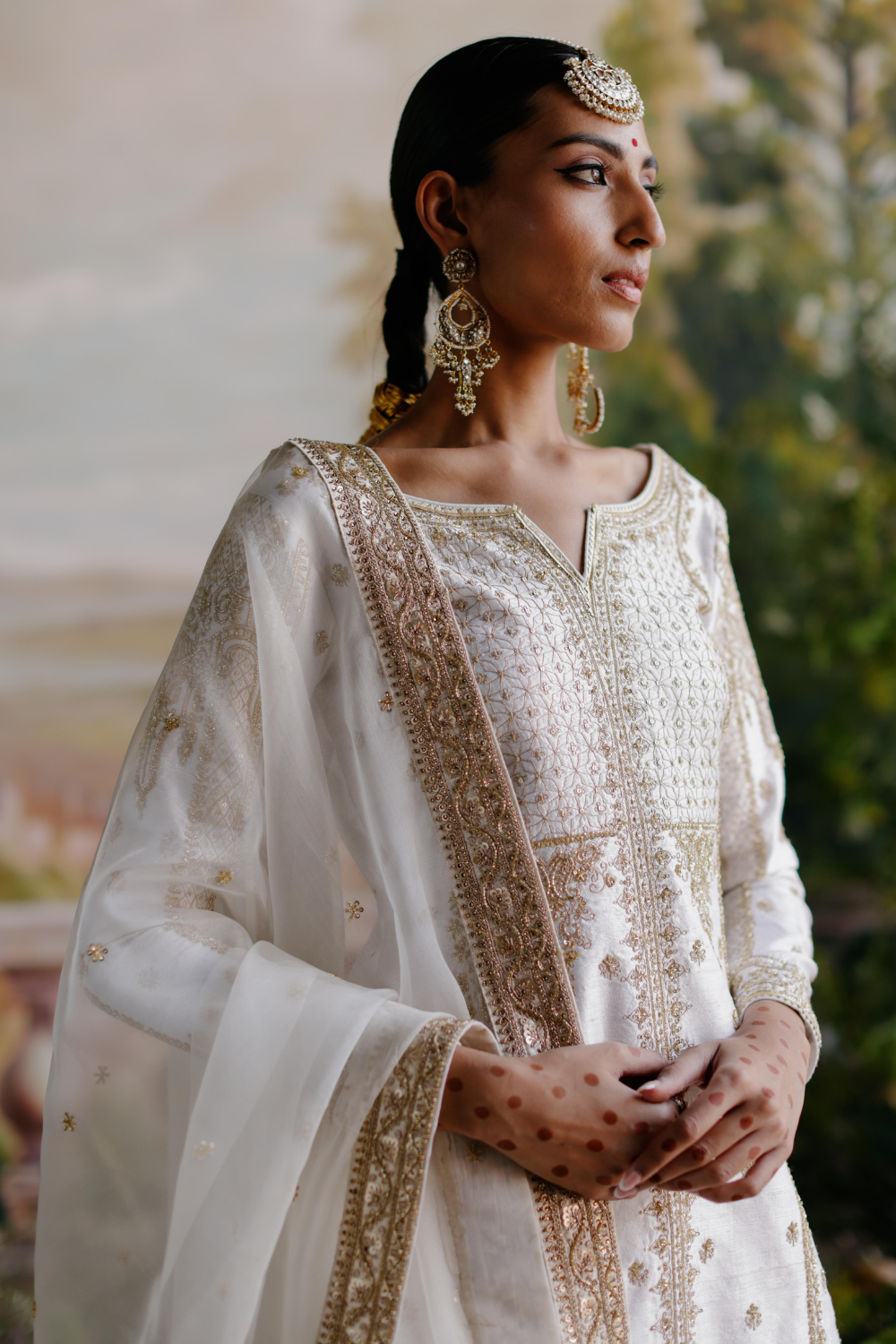 Featuring an ivory rawsilk kurta & sharara set paired with an organza base dupatta with antique gold dori and aari embroidery.