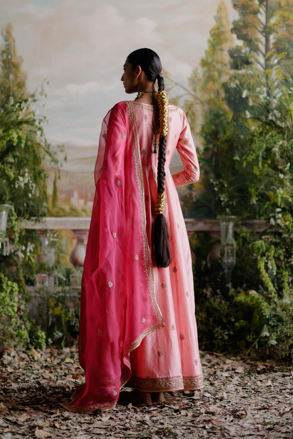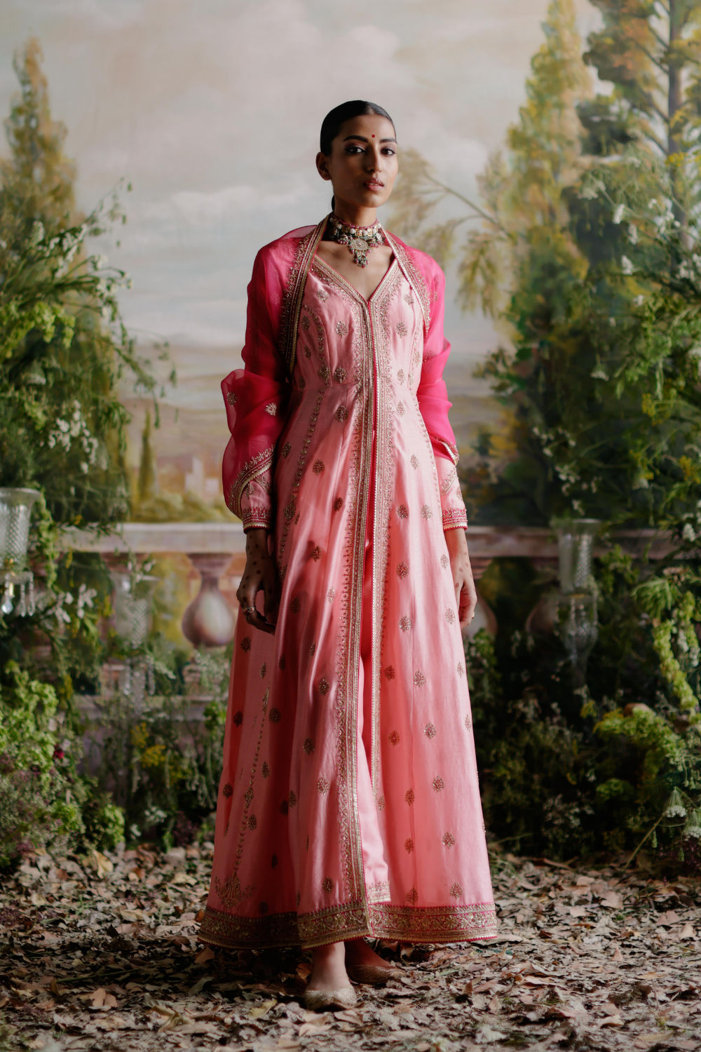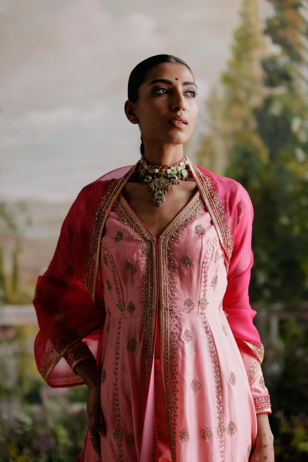Featuring a Candy pink chanderi jacket set paired with an organza base dupatta with antique gold dori and aari embroidery.