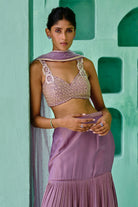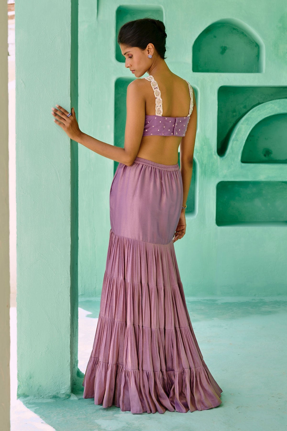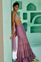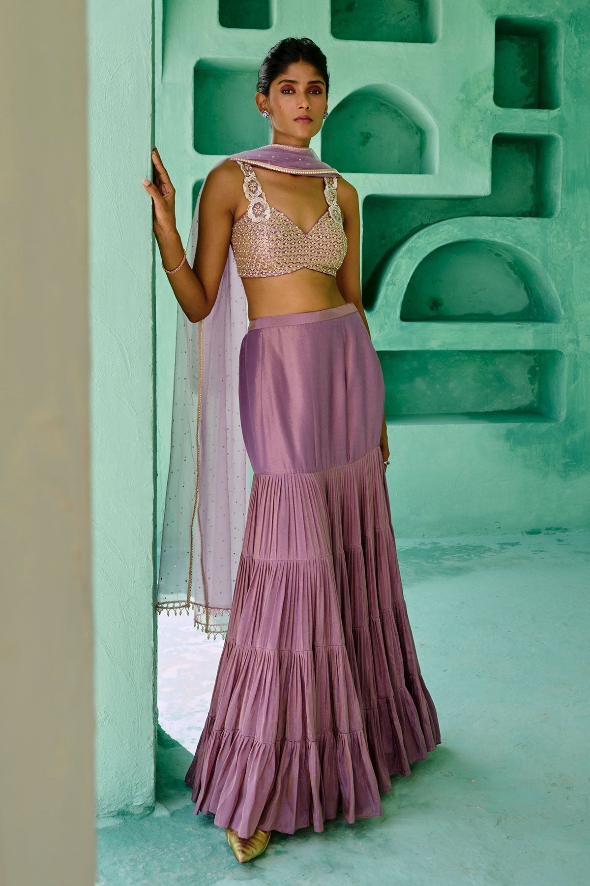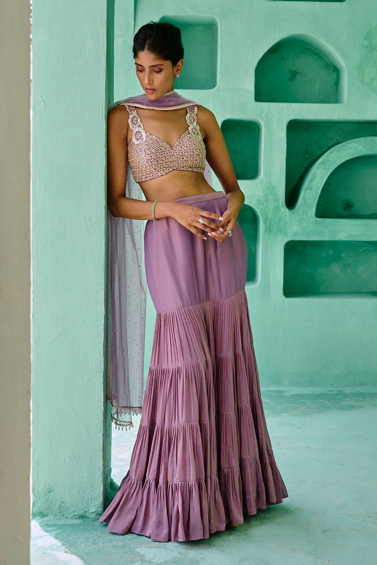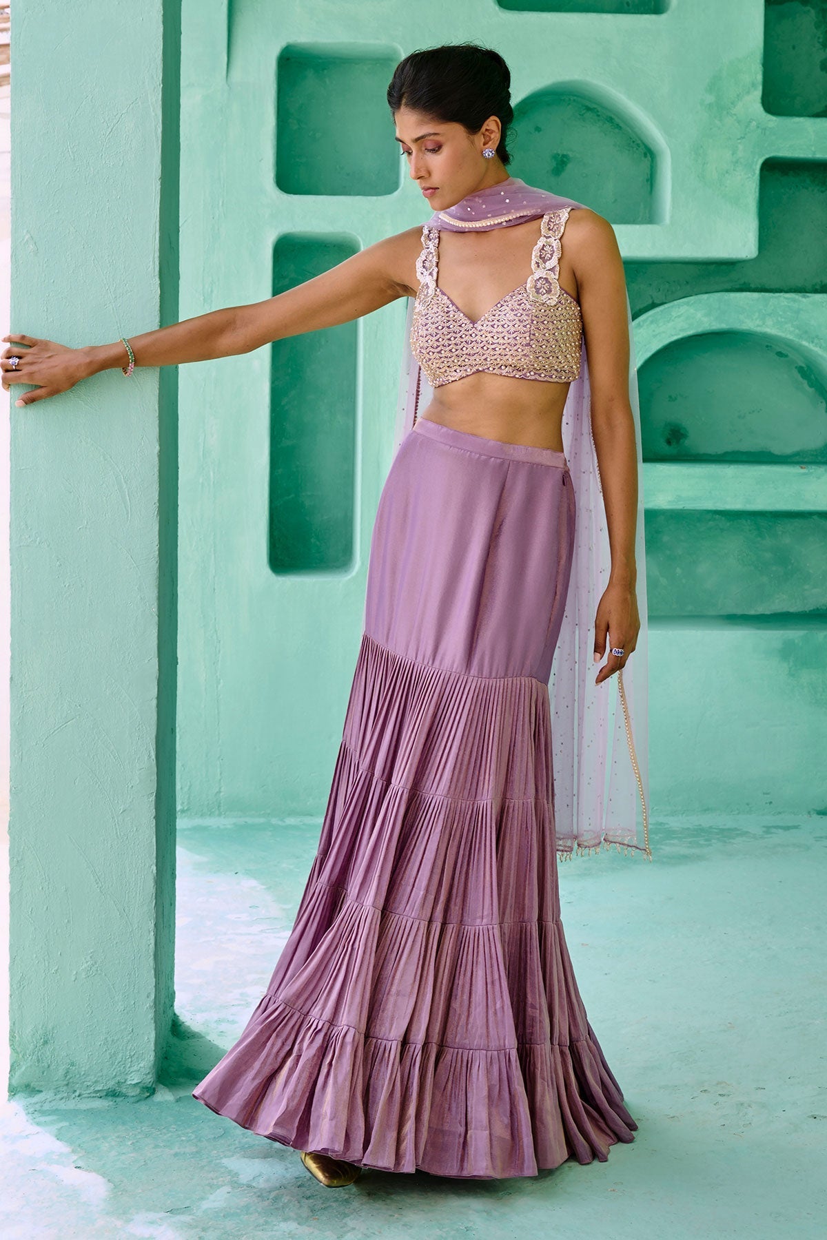 Tissue silk frill skirt paired with glassbeads and pearl embroidered raw silk blouse and tulle dupatta.