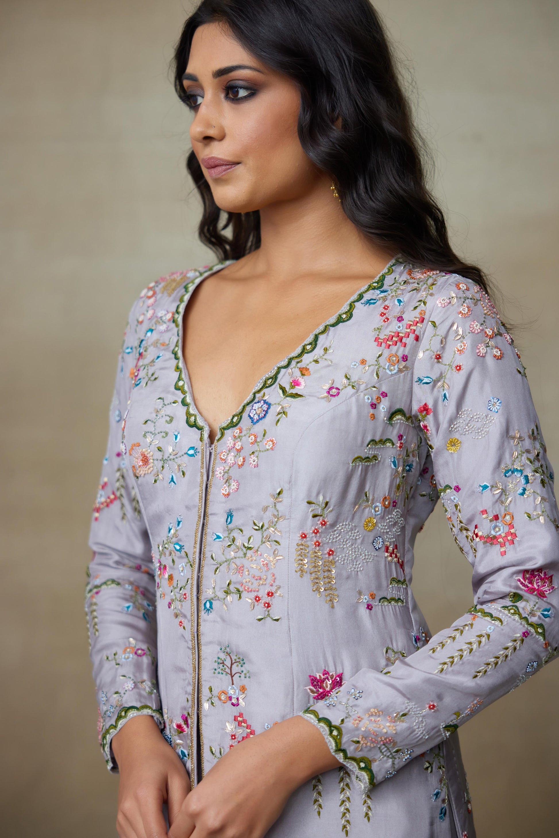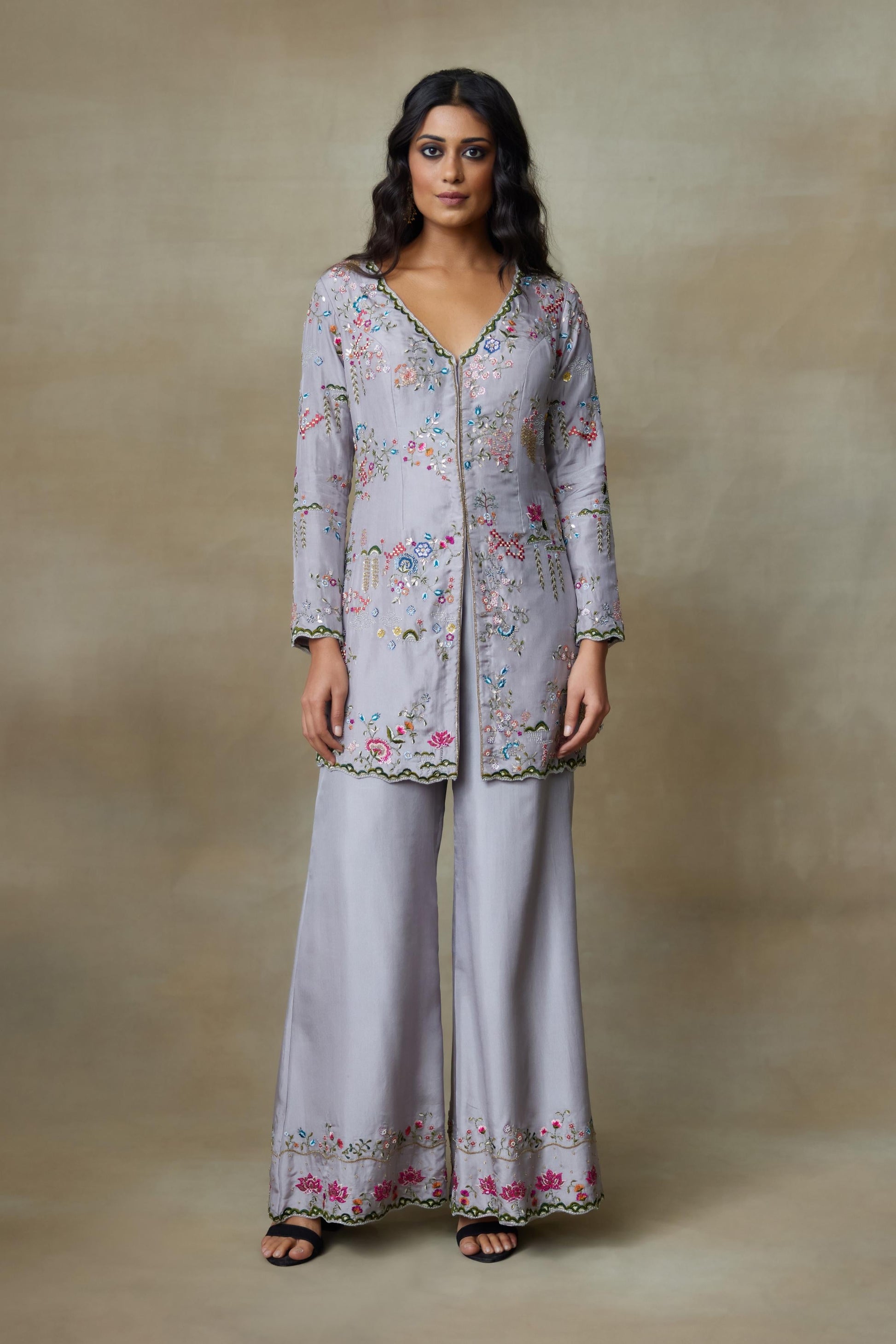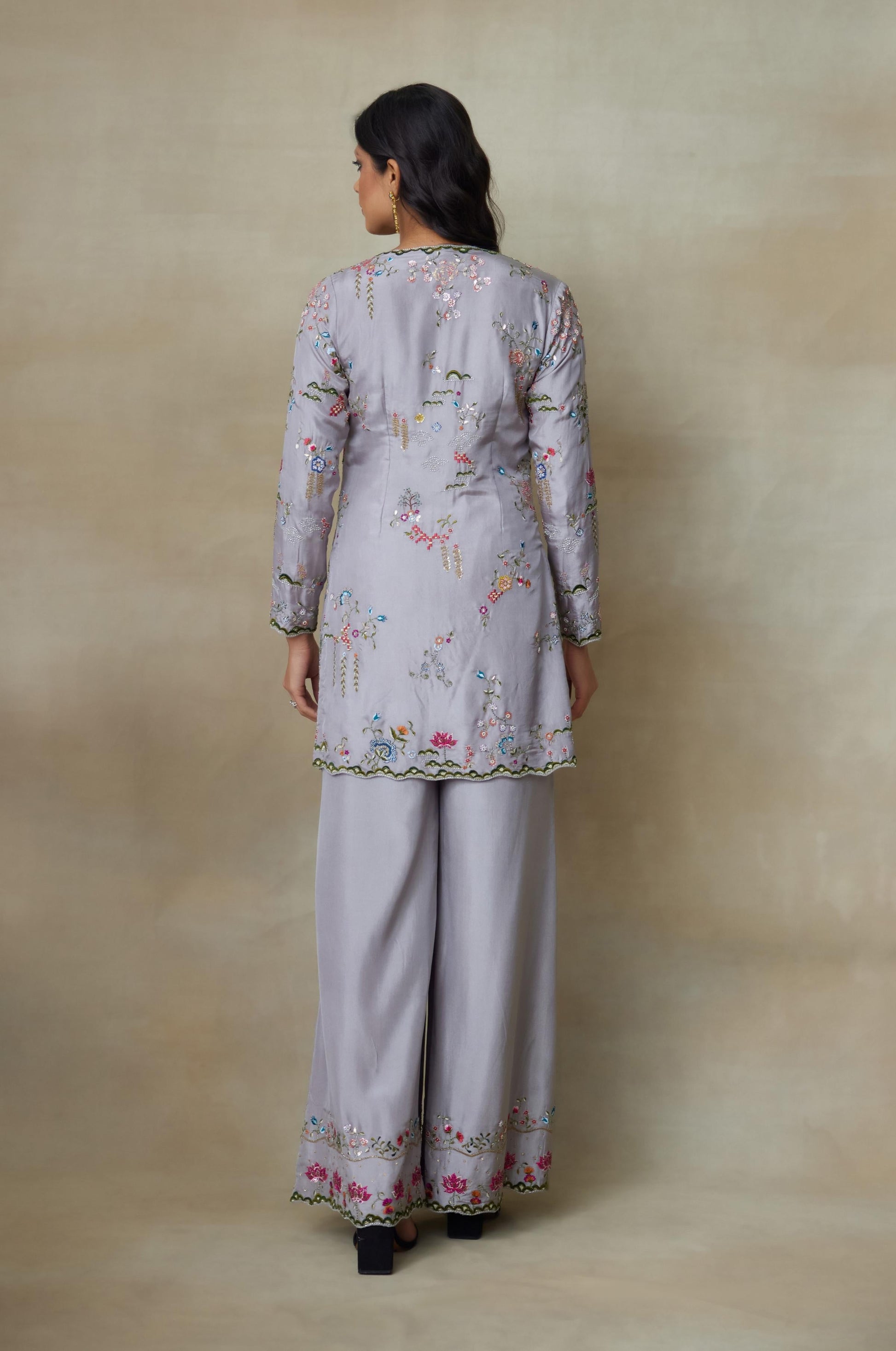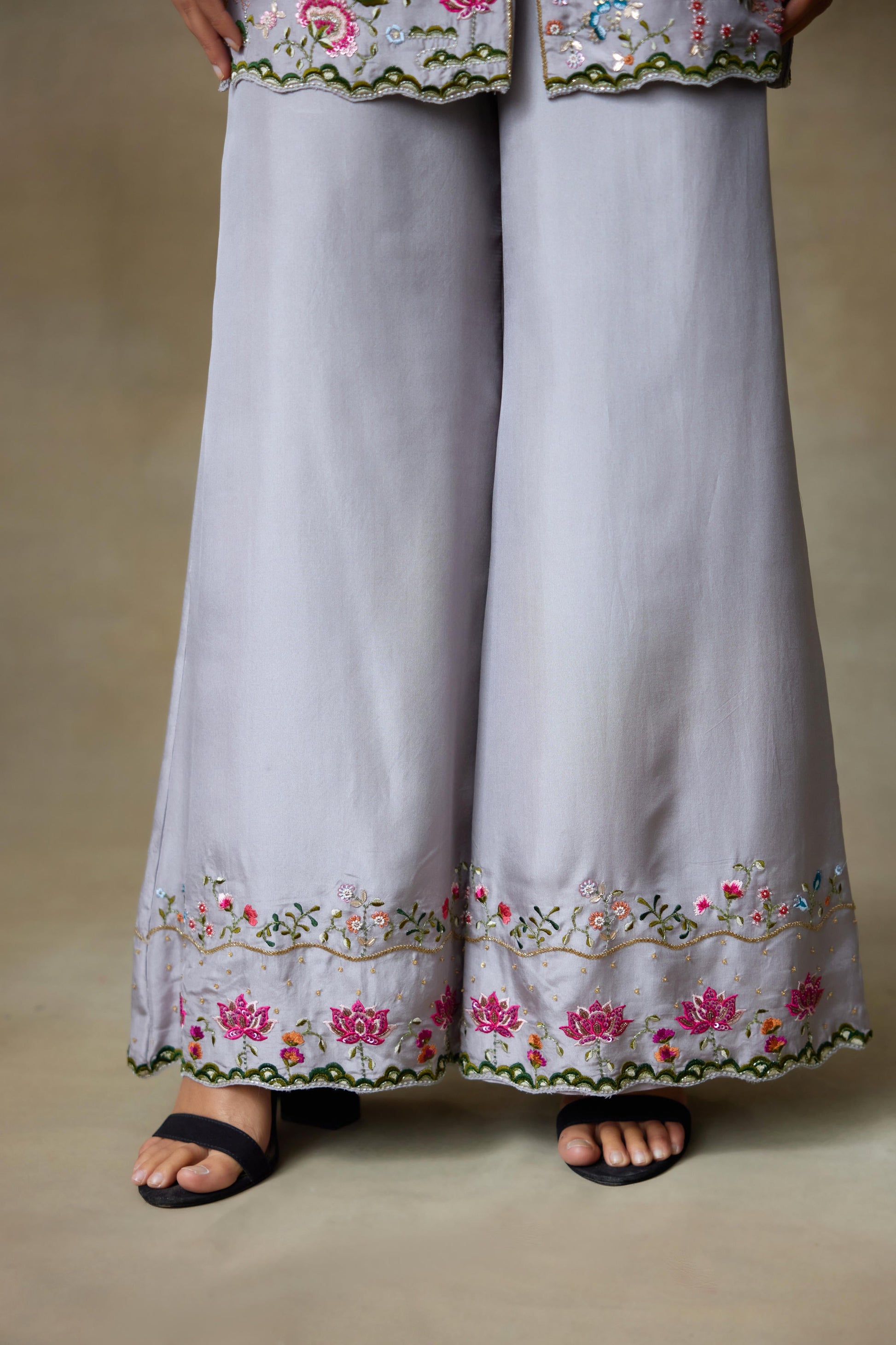 Our Grey Chamundi Silk Top Paired With Silk Pants Has Floral Handcrafted Work All Over Top With Beads , Resham And Lotus Flower Embroidery. The Handwork Is Done With Alignment Which Makes It An Enchanting Ensemble.