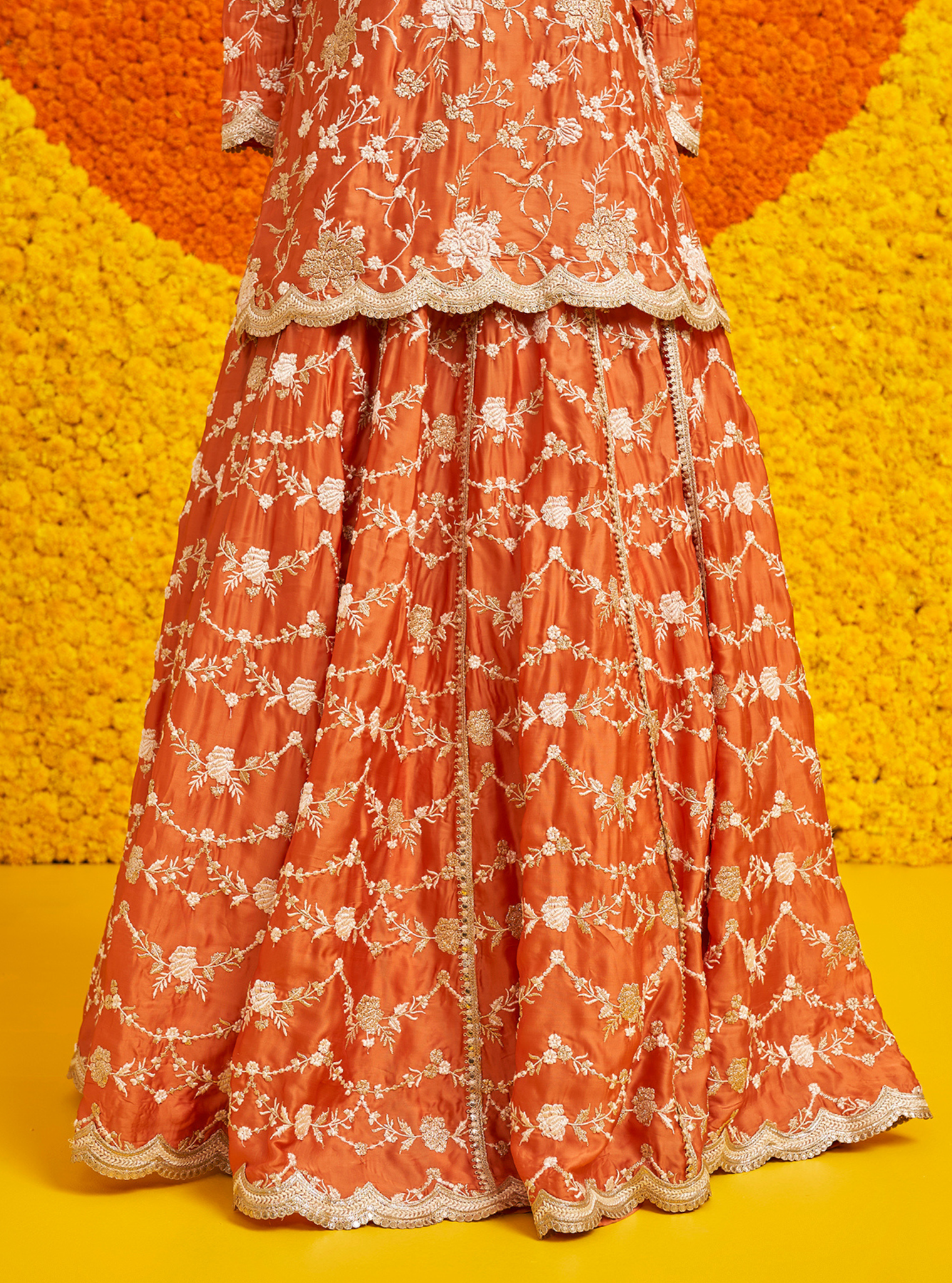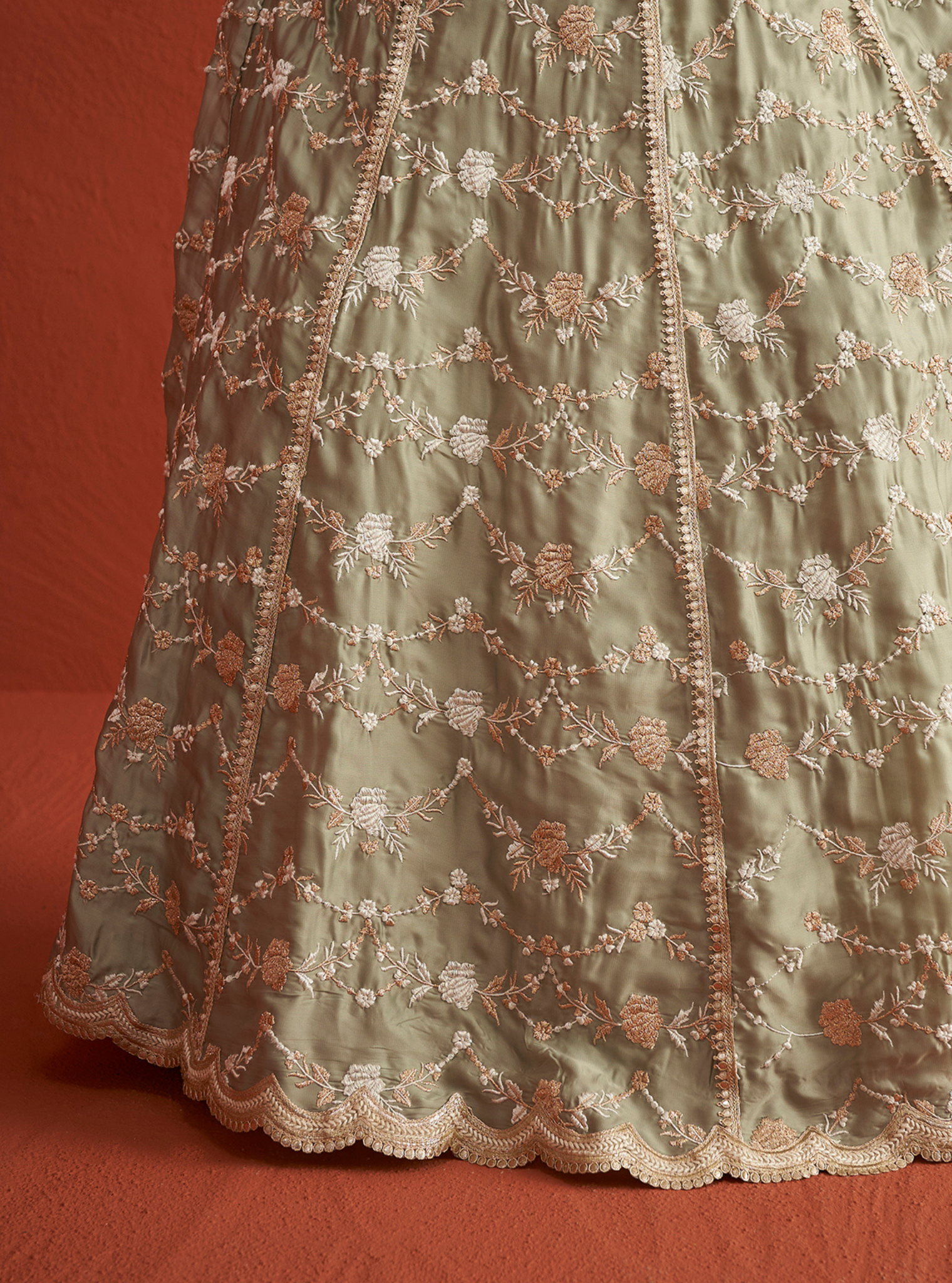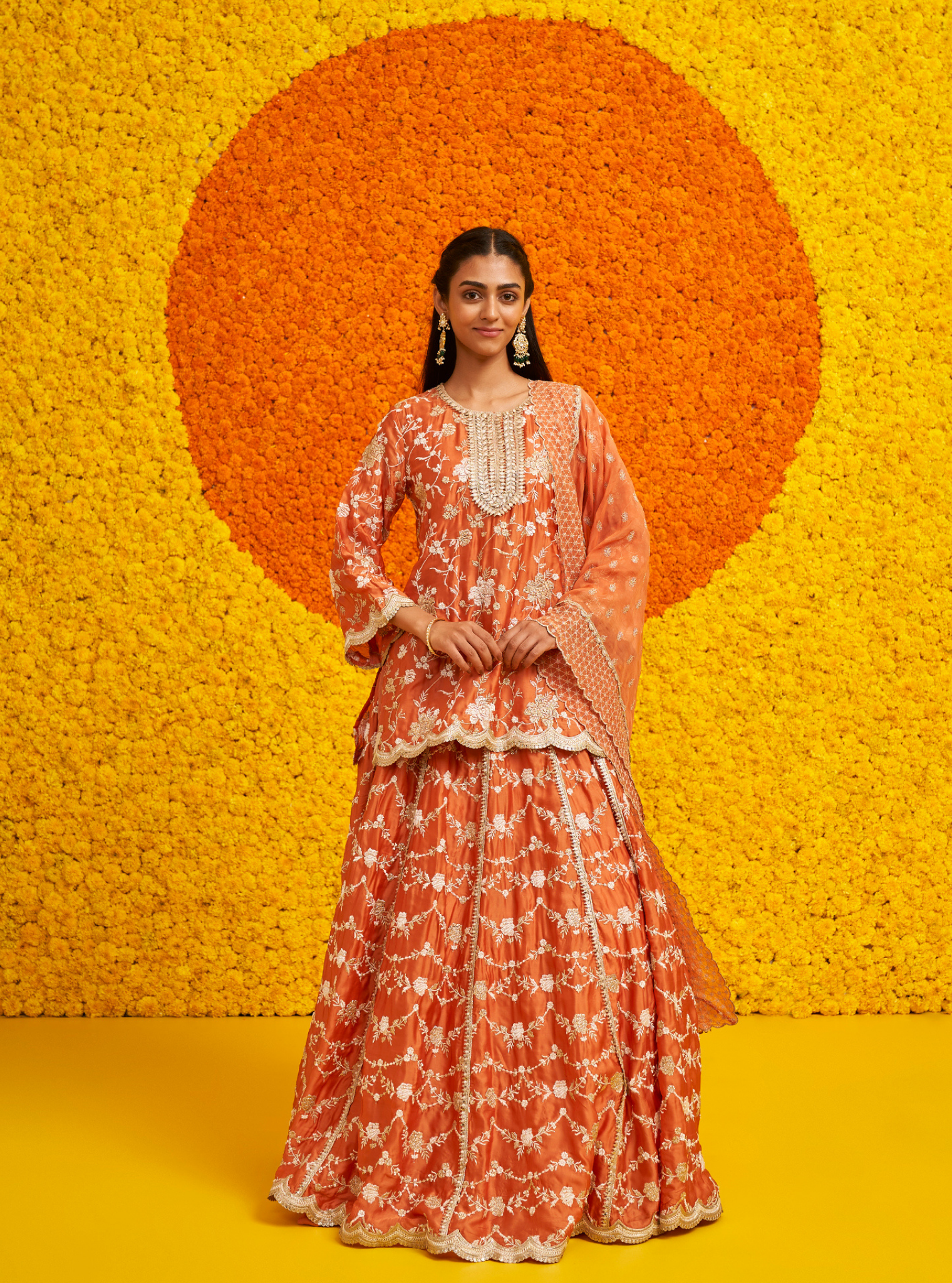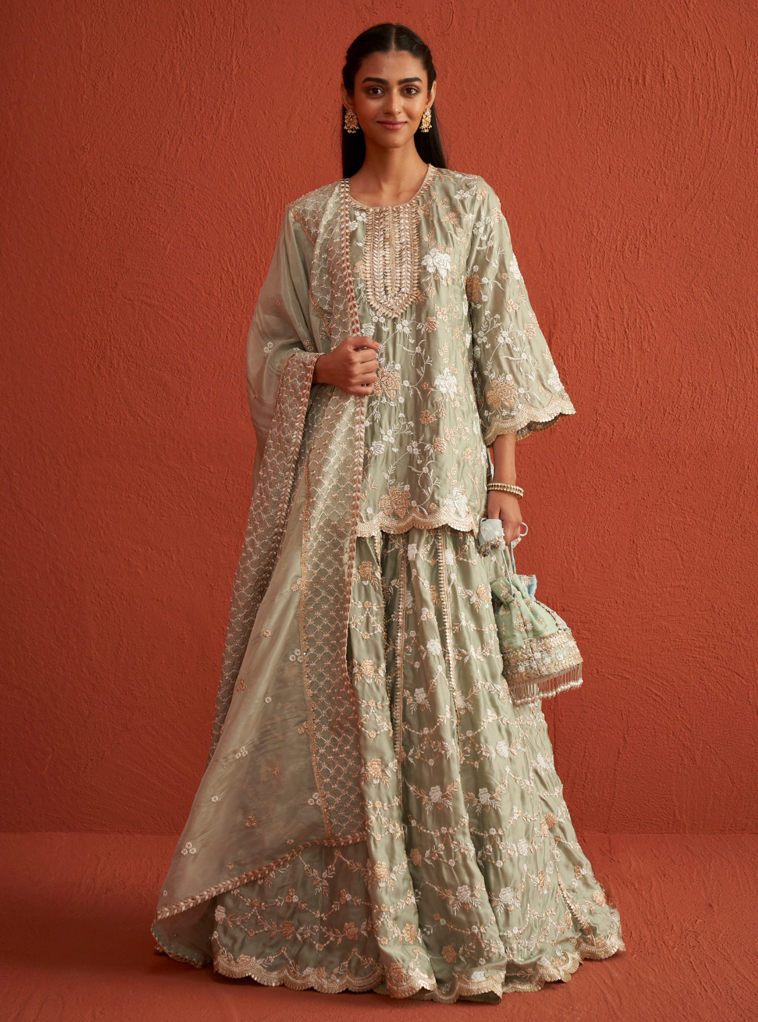 No better way to make a statement this wedding season than with this refreshing sage green/orange lehenga. The floral embroidery sprawled across the flared skirt and the matching kurta creates an opulent and radiant ensemble. The intricate sequin gotta on the neckline adds a subtle shimmer, making this ensemble perfect for daytime festivities. The light, airy fabric ensures both comfort and style, making it ideal for long celebrations.