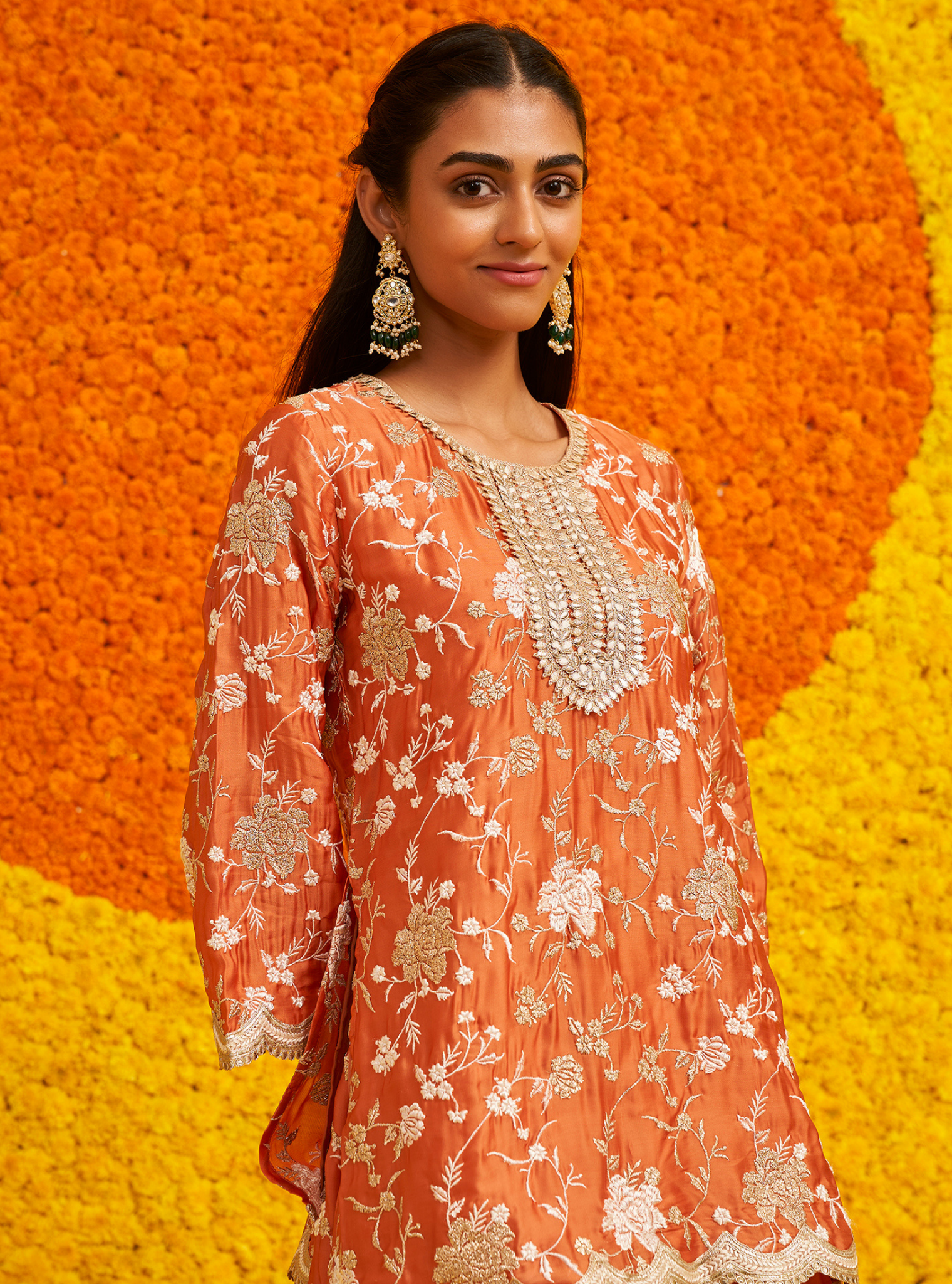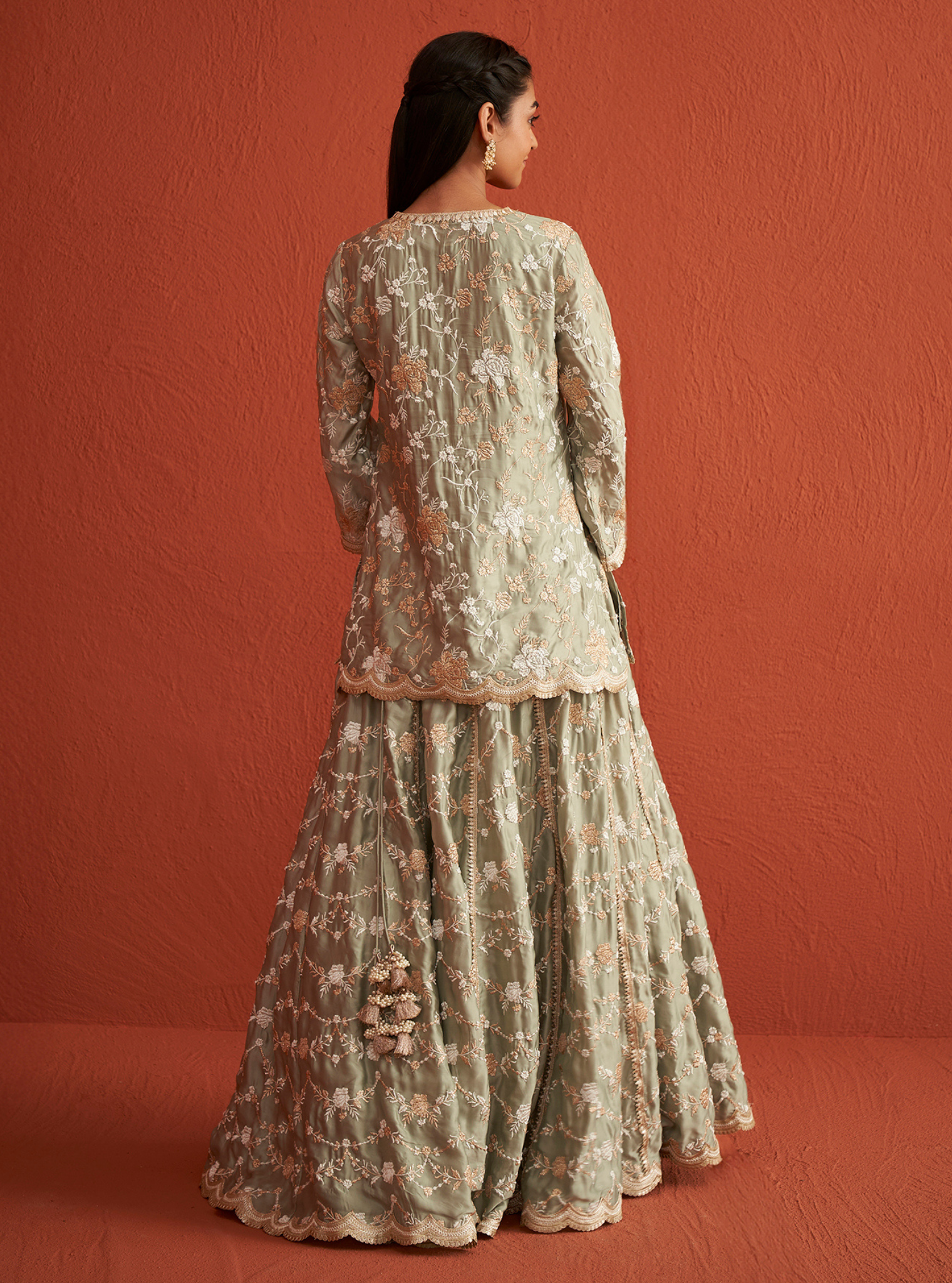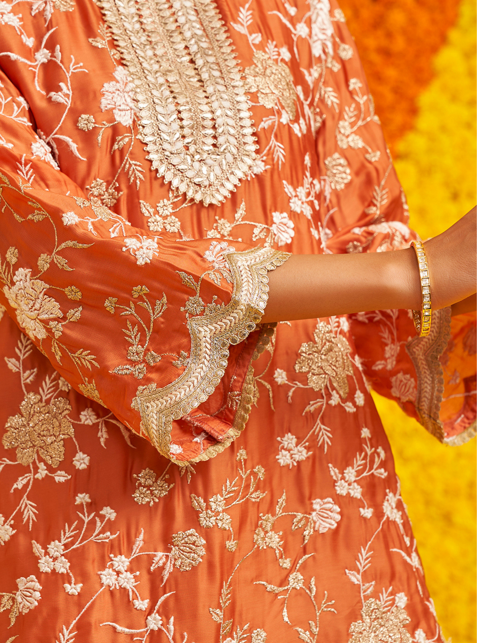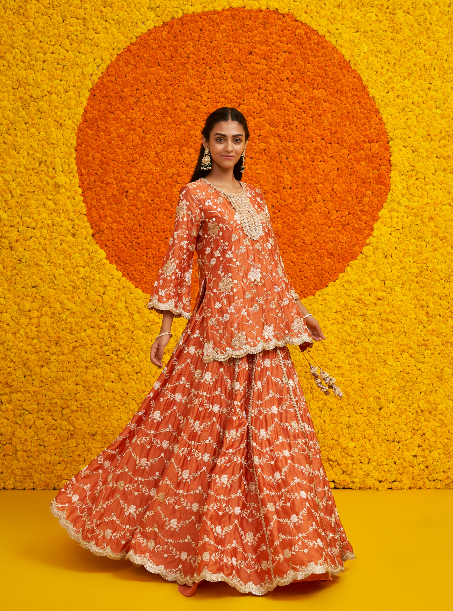 No better way to make a statement this wedding season than with this refreshing sage green/orange lehenga. The floral embroidery sprawled across the flared skirt and the matching kurta creates an opulent and radiant ensemble. The intricate sequin gotta on the neckline adds a subtle shimmer, making this ensemble perfect for daytime festivities. The light, airy fabric ensures both comfort and style, making it ideal for long celebrations.