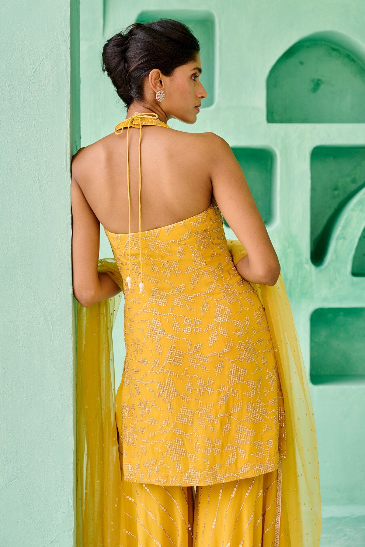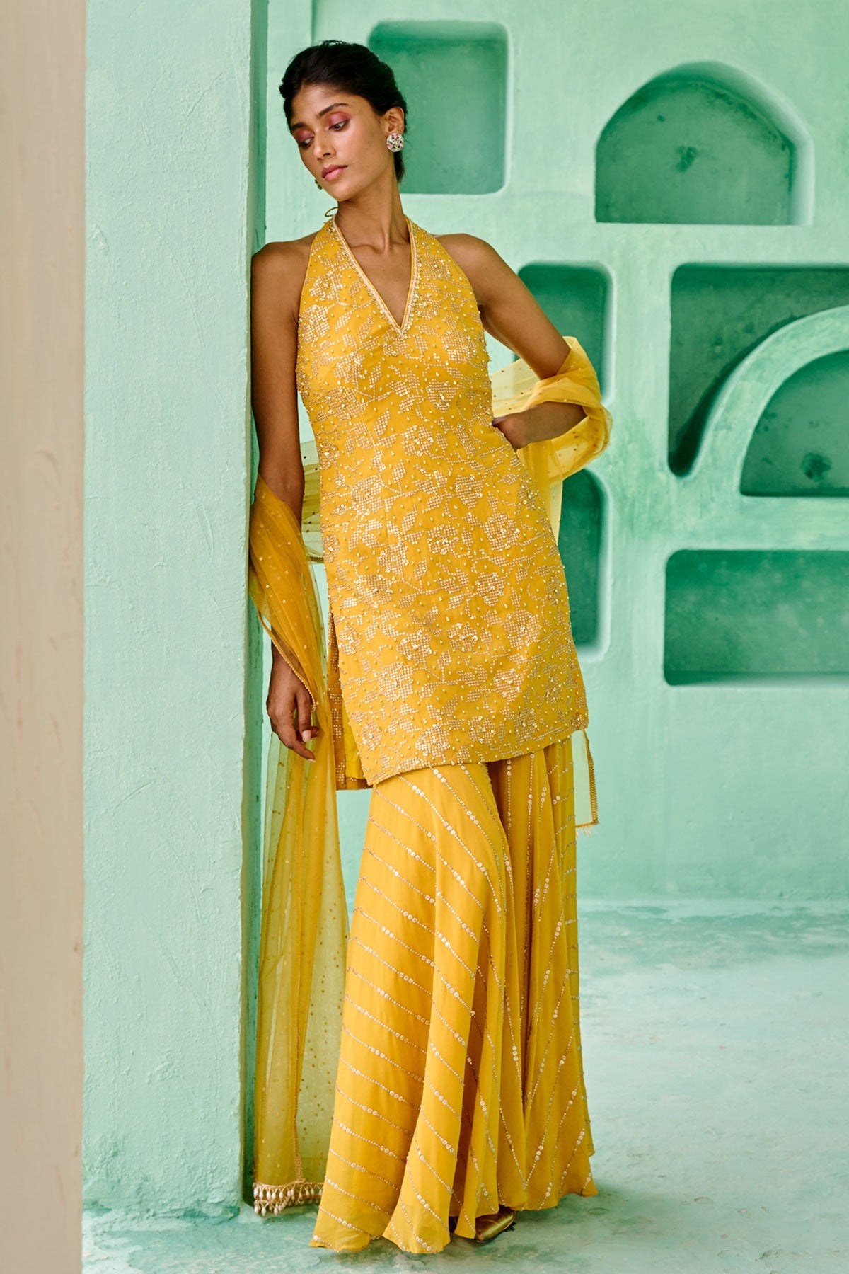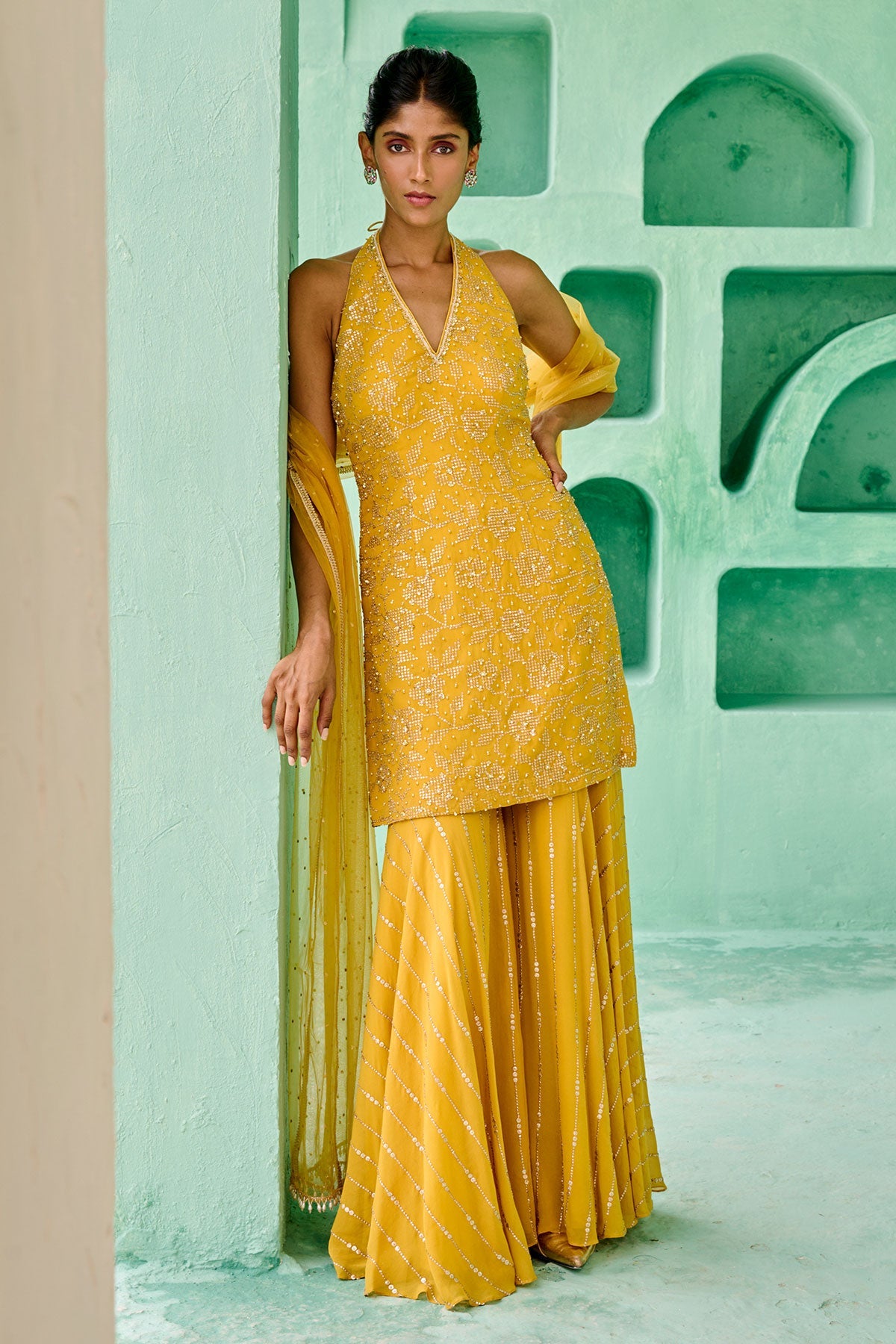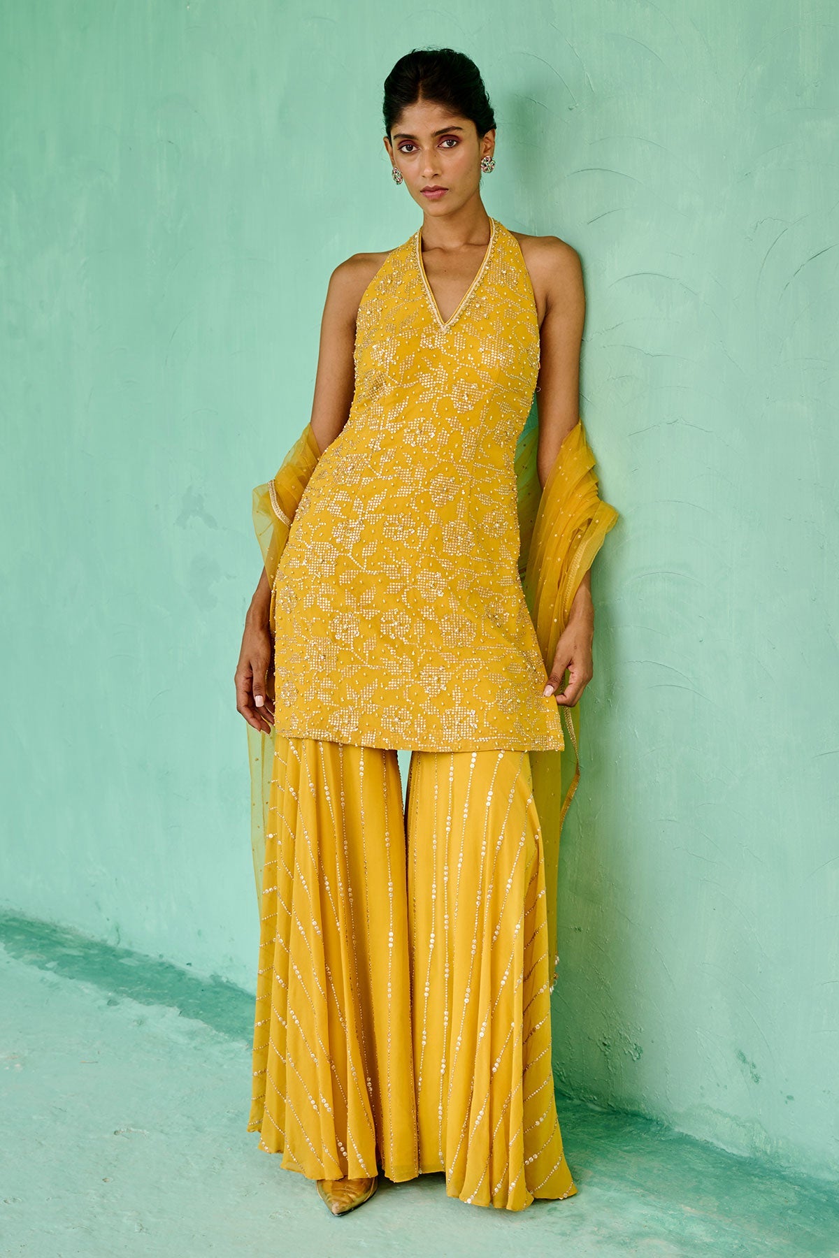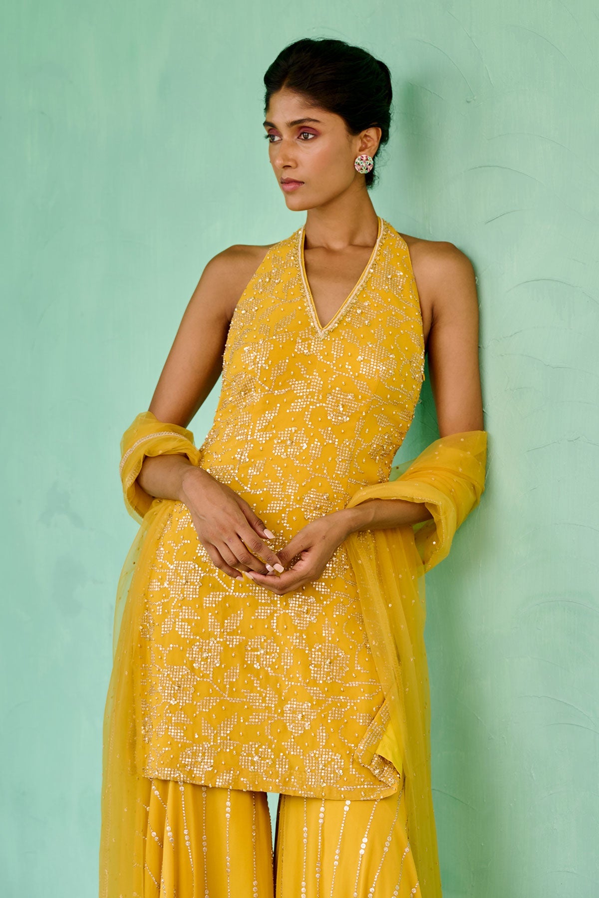 Georgette sequence embellished sharara paired with floral sequence and pearl embroidered halter neck kurta and tulle dupatta.