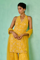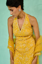 On The Model: XS, 5 Feet 10 Inches Neckline - Halter, Neck Depth - 10 inches Kurta Length- 35 inches Pant Length - 44 inches