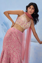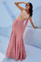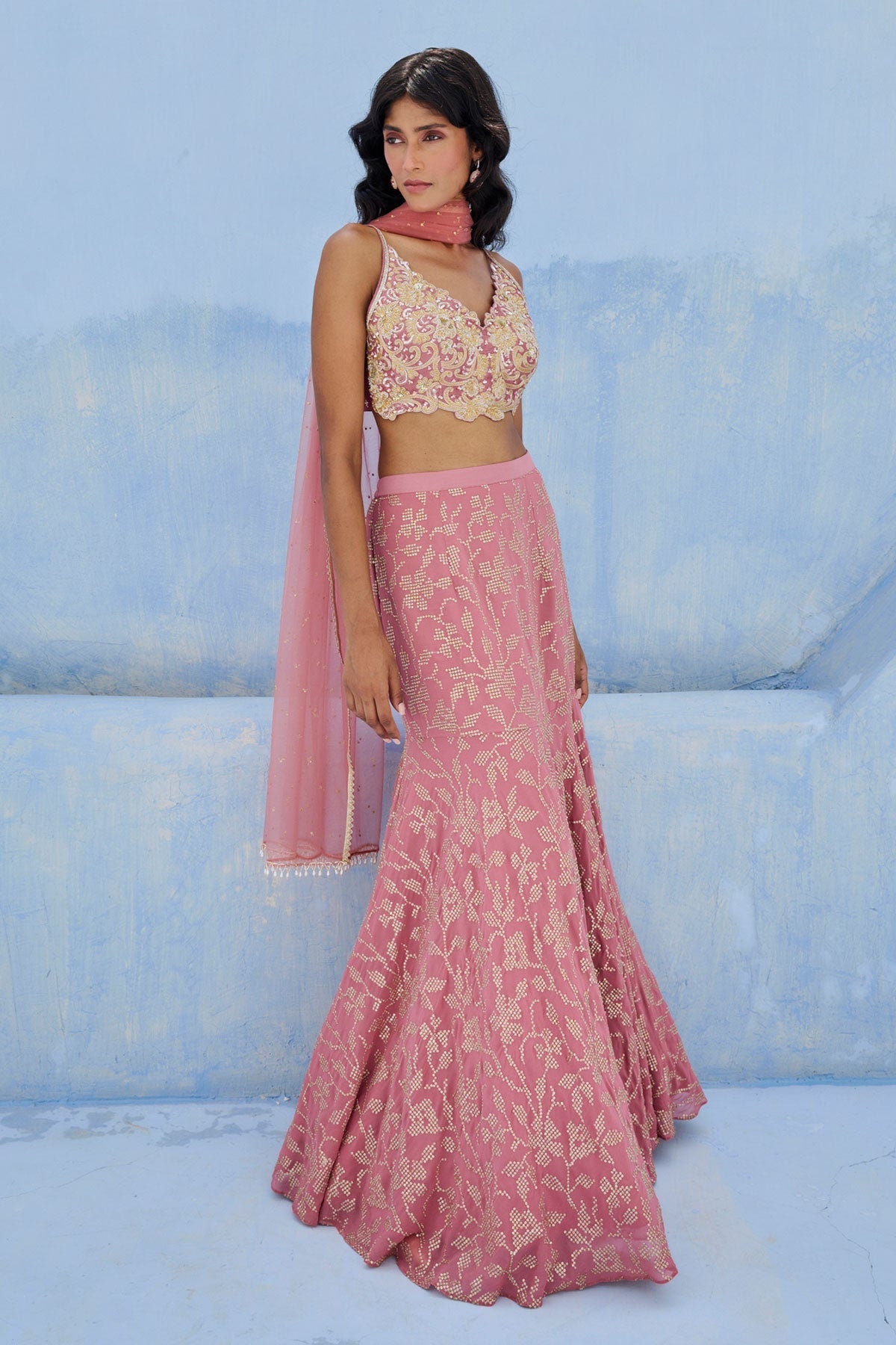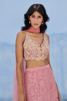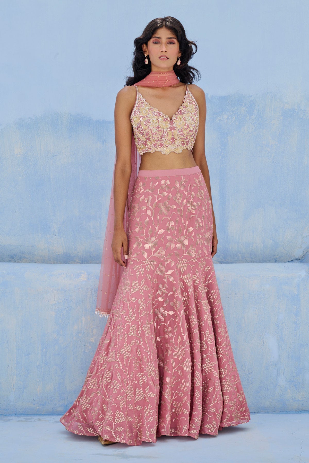 Fit and flare skirt with floral sequence embellishments paired with sequence and glassbeads embroidered blouse and tulle dupatta.