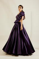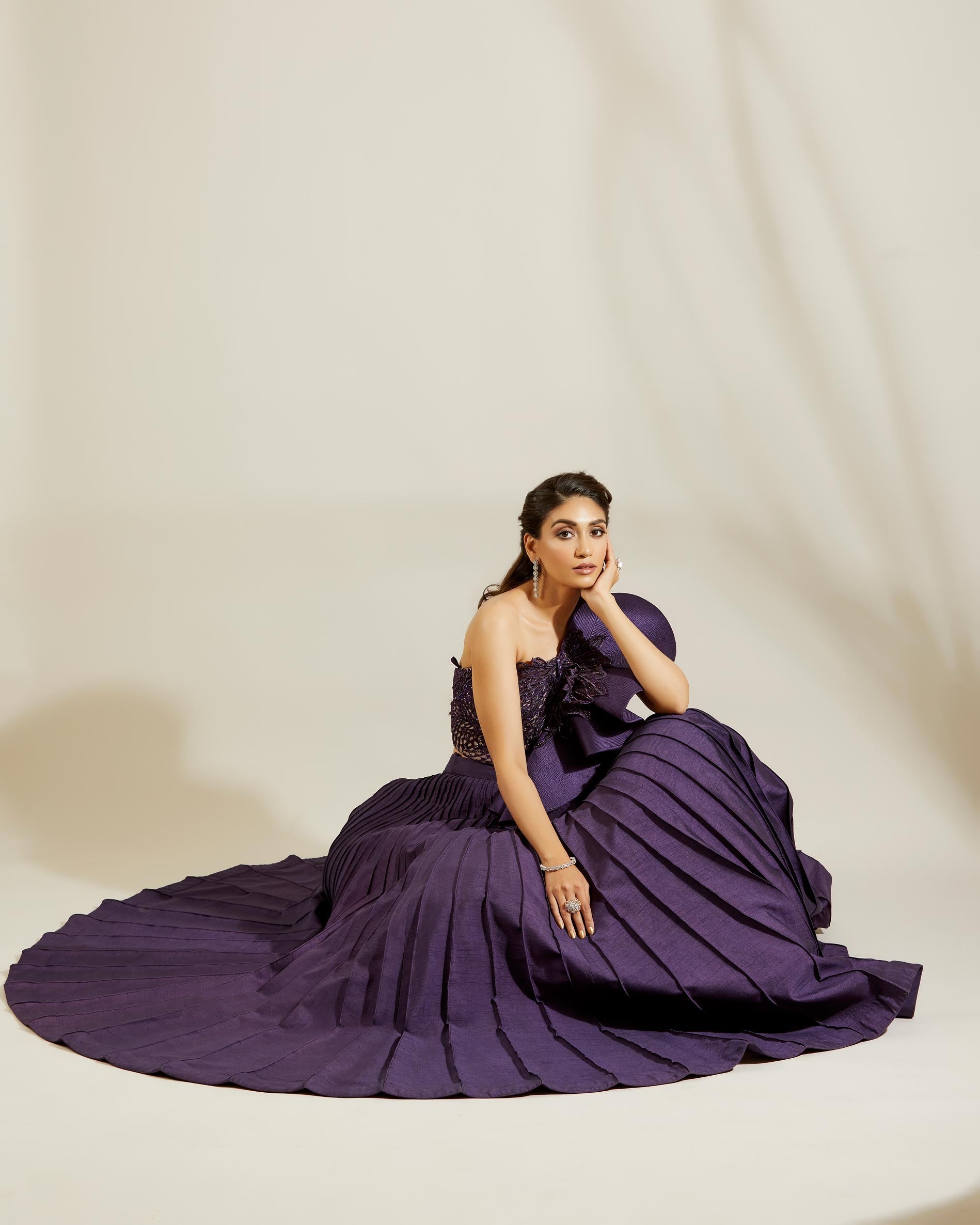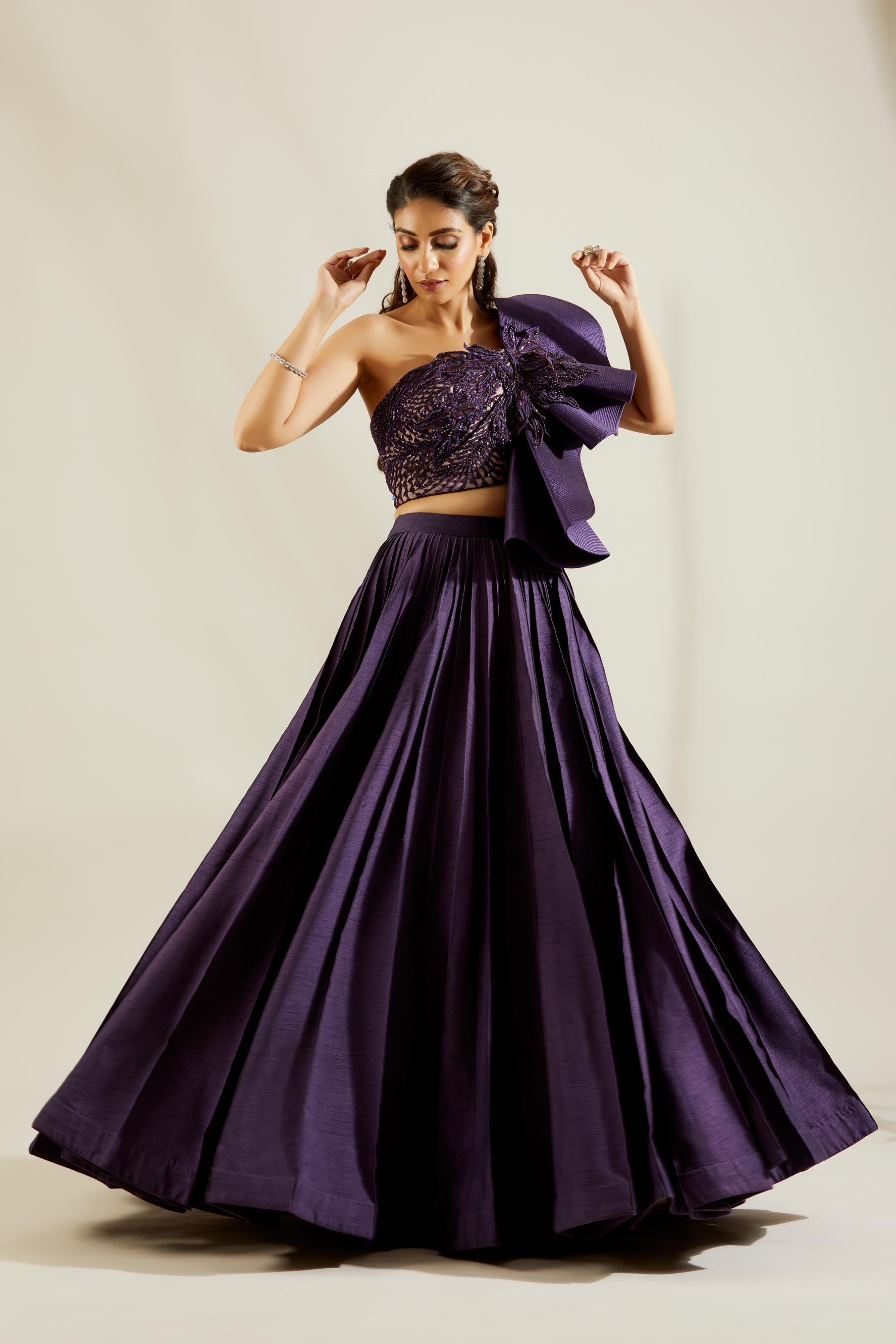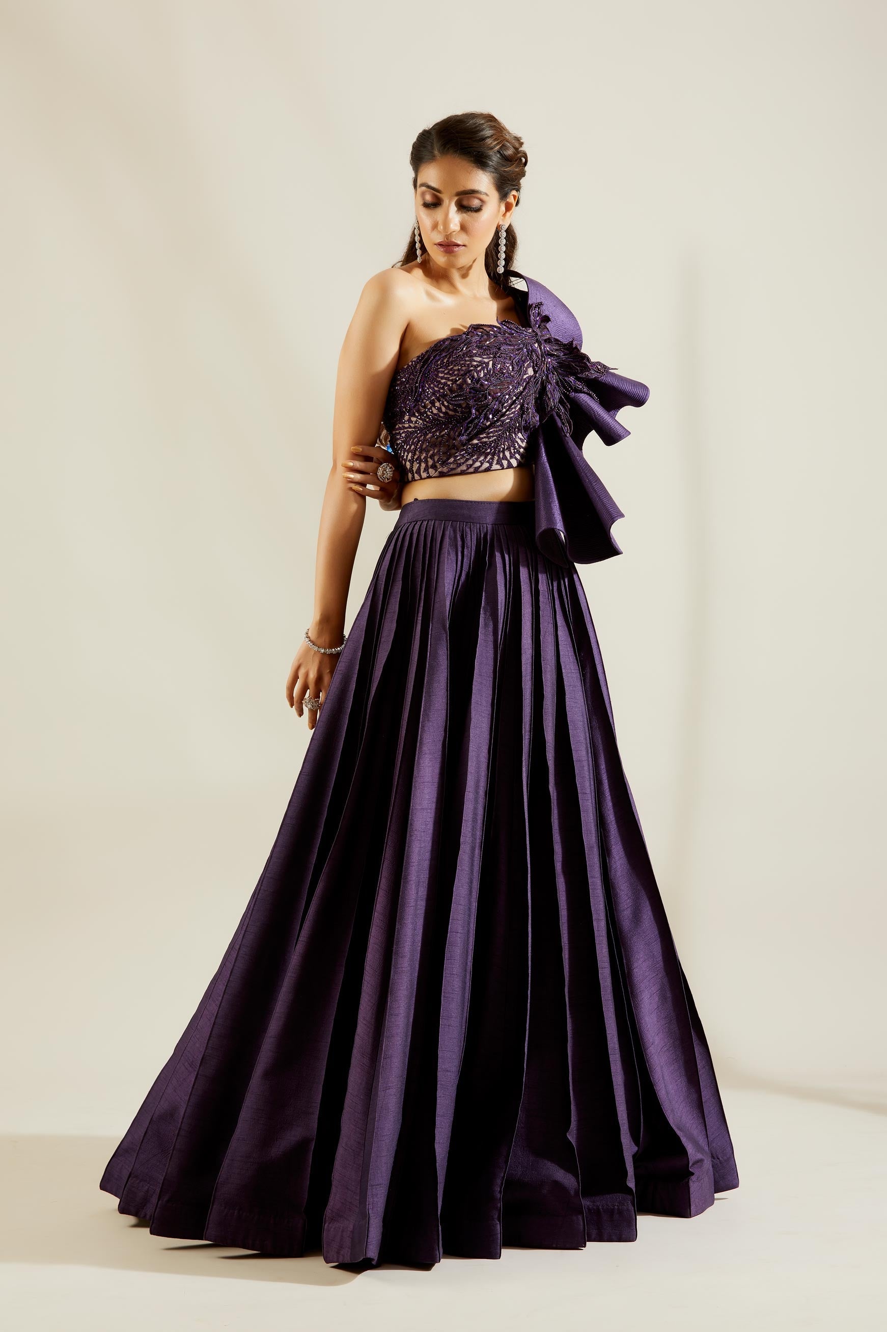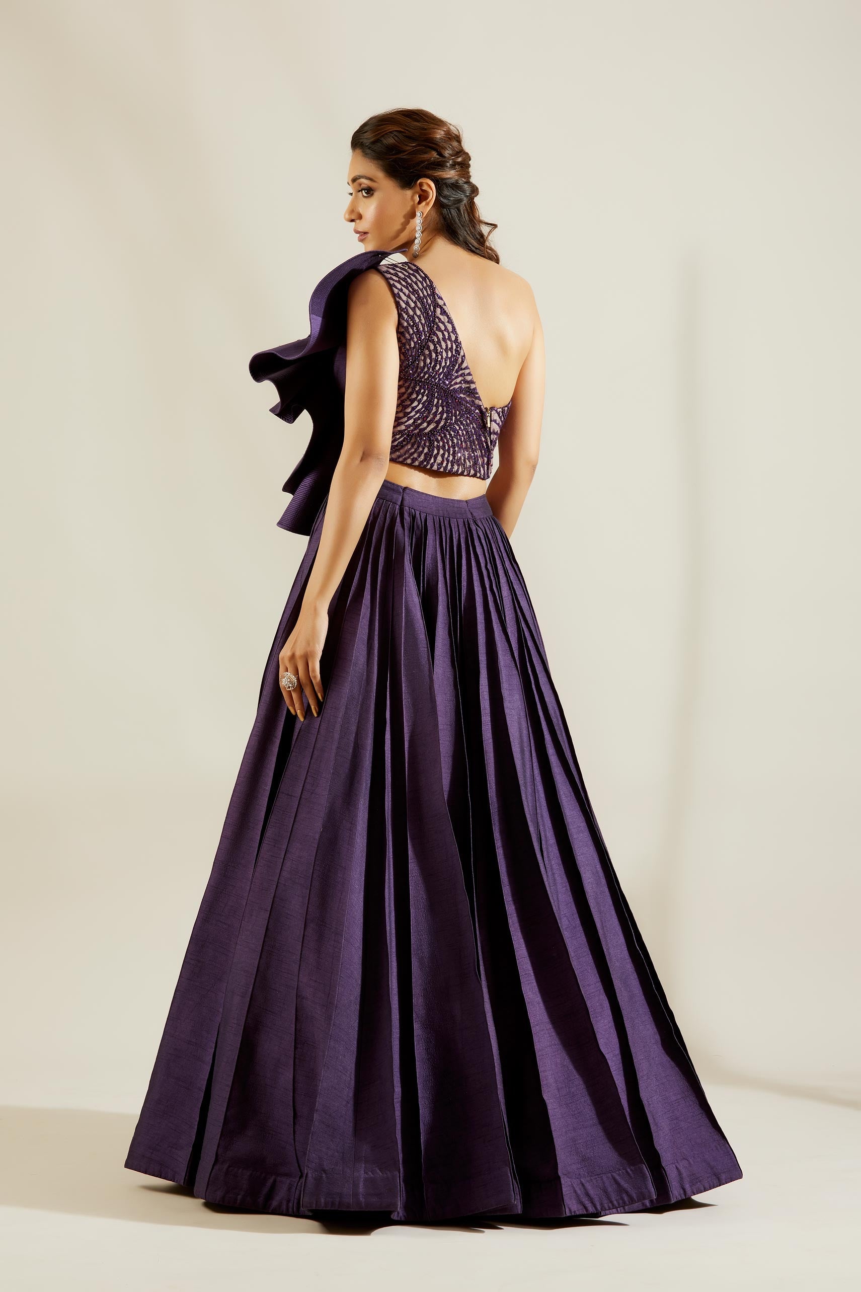 Indigo big flap one shoulder blouse with line placement embroidery and 3d leaves applique comes with a pint tuck skirt