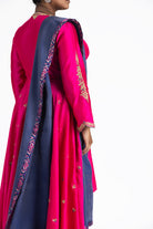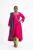 Fuchsia Chanderi Kalidar Embroidered With Gold Zari, Dabka, Sequins, And Resham, Paired With Brocade Trousers And A Tissue Dupatta.