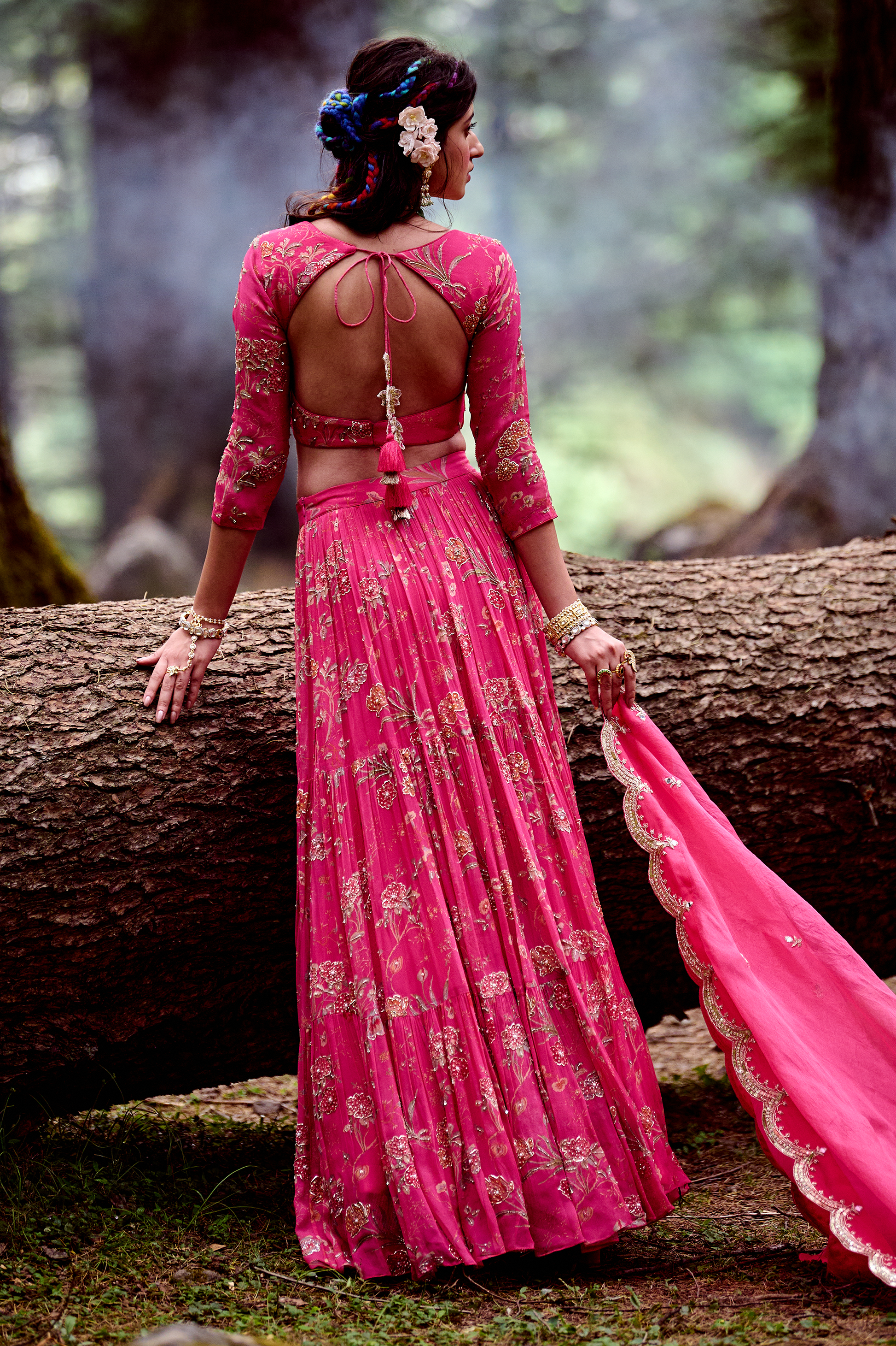 Our three–layered pink floral print lehenga is reminiscent of a jungle blooming with flowers, adorned with hand–embroidery of sequins, dabka work and moti. It is paired with a hand–embroidered blouse and mirror scalloped dupatta.