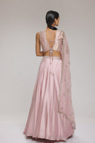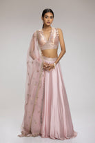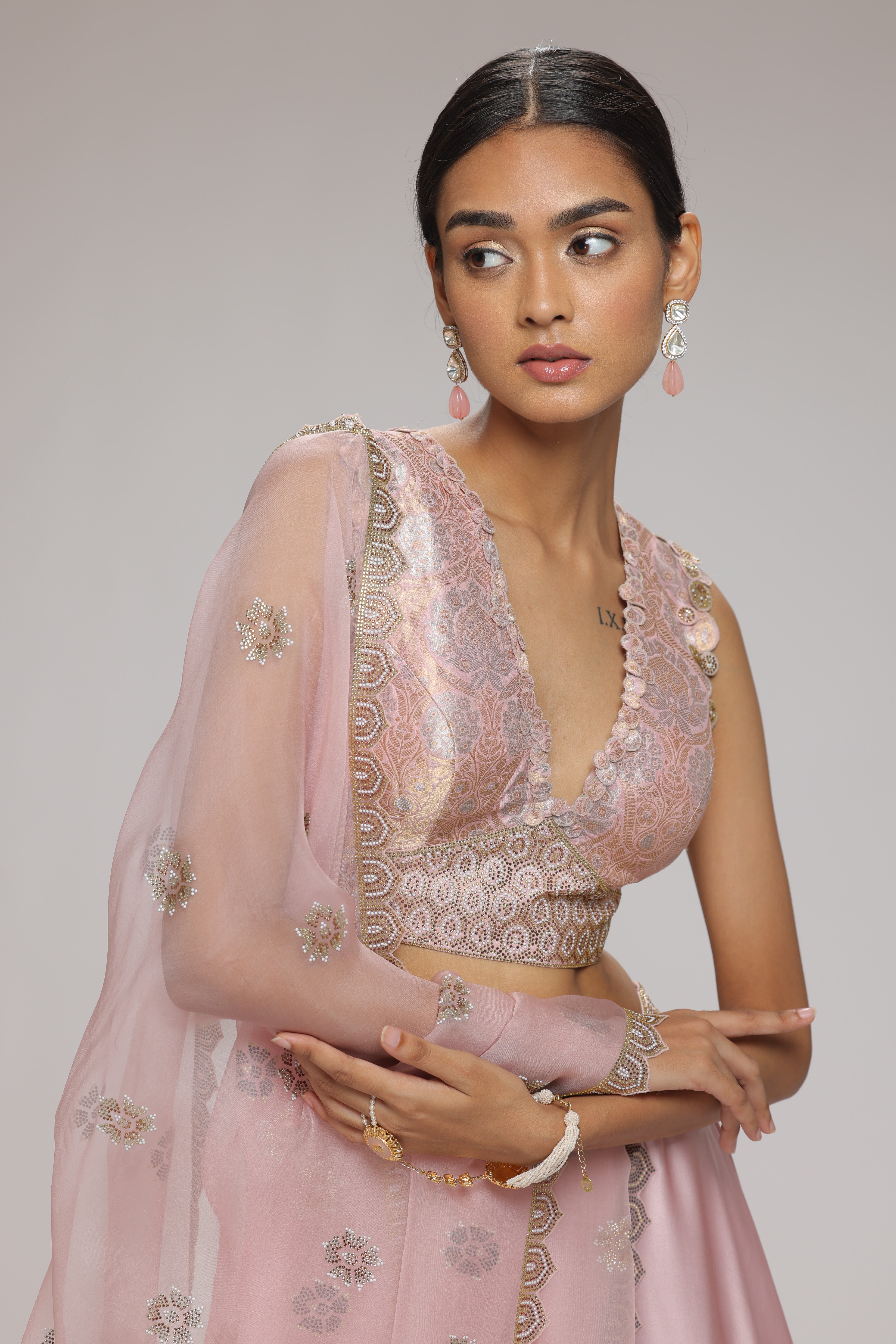 A pink chamoise satin lehenga, accentuated by a rhinestone embellished yoke with a banarasi brocade blouse and embellished with shimmering rhinestones. Completing the ensemble is an organza dupatta embellished with rhinestones.
