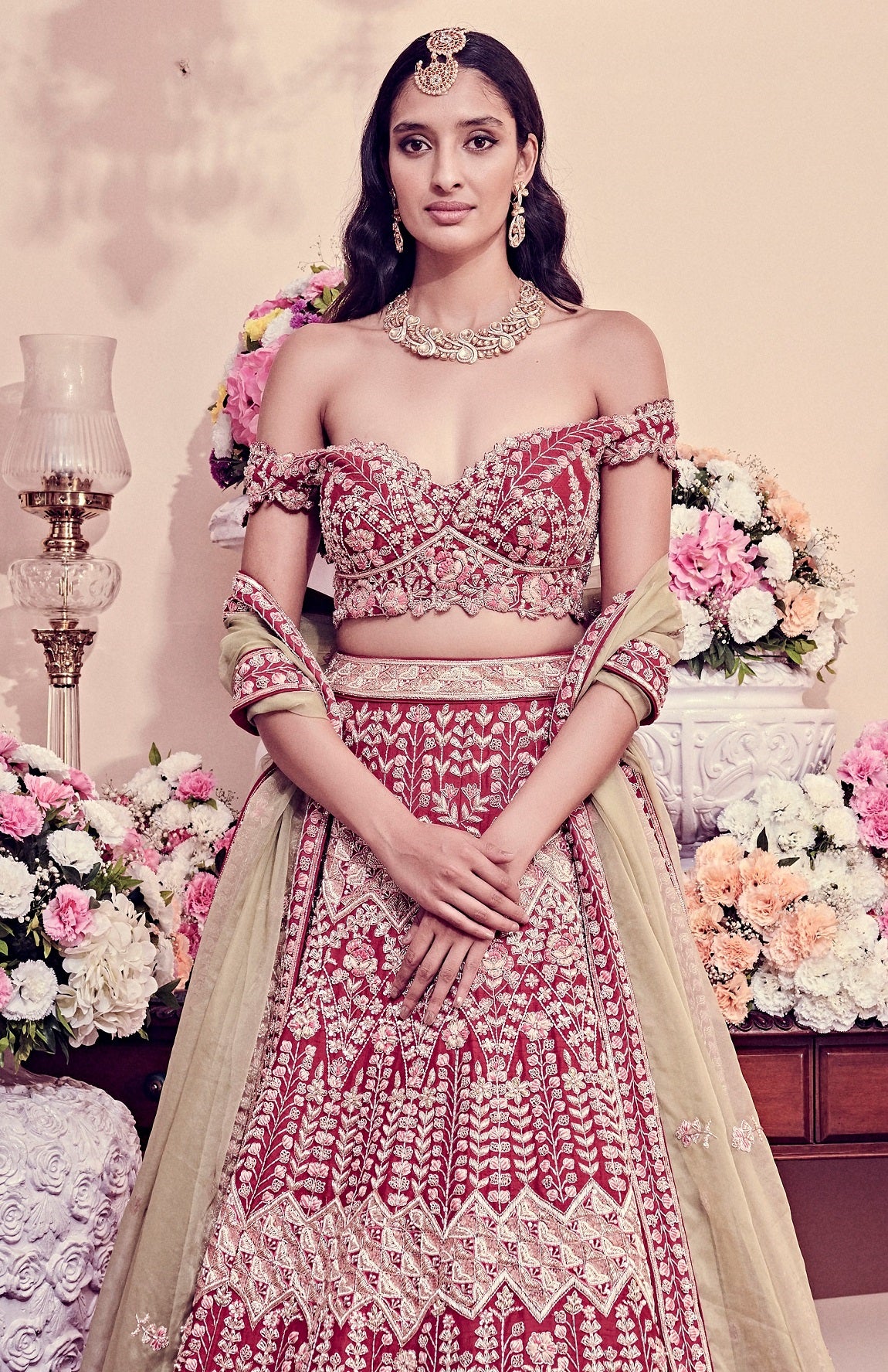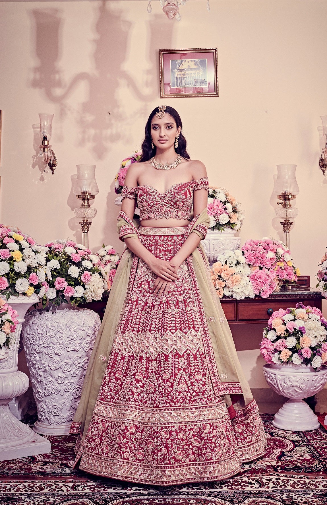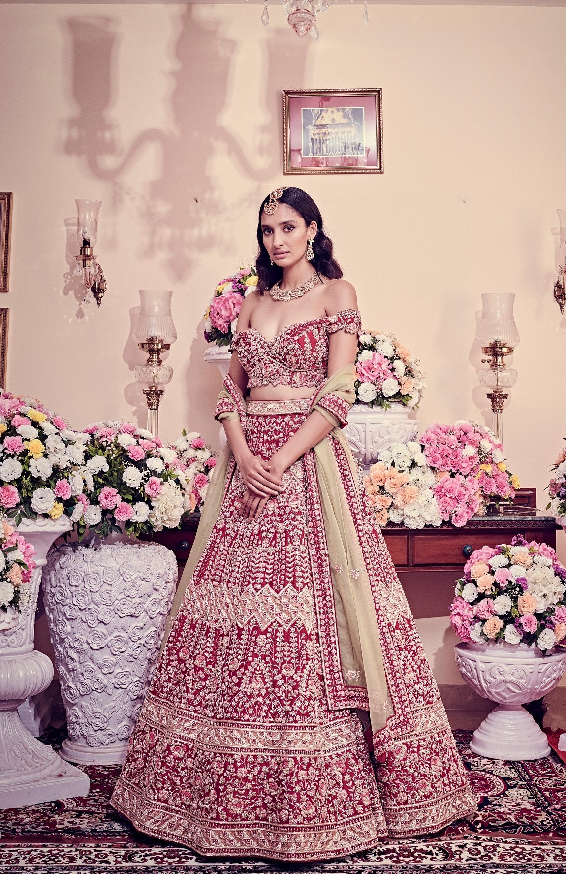 The lady Daniel Kazi wears a bindani’s signature garnet red lehenga set. The lehenga is meticulously adorned with off-shoulder statement blouses to accentuate golden zari embellishments to ace the new-age bridal look.