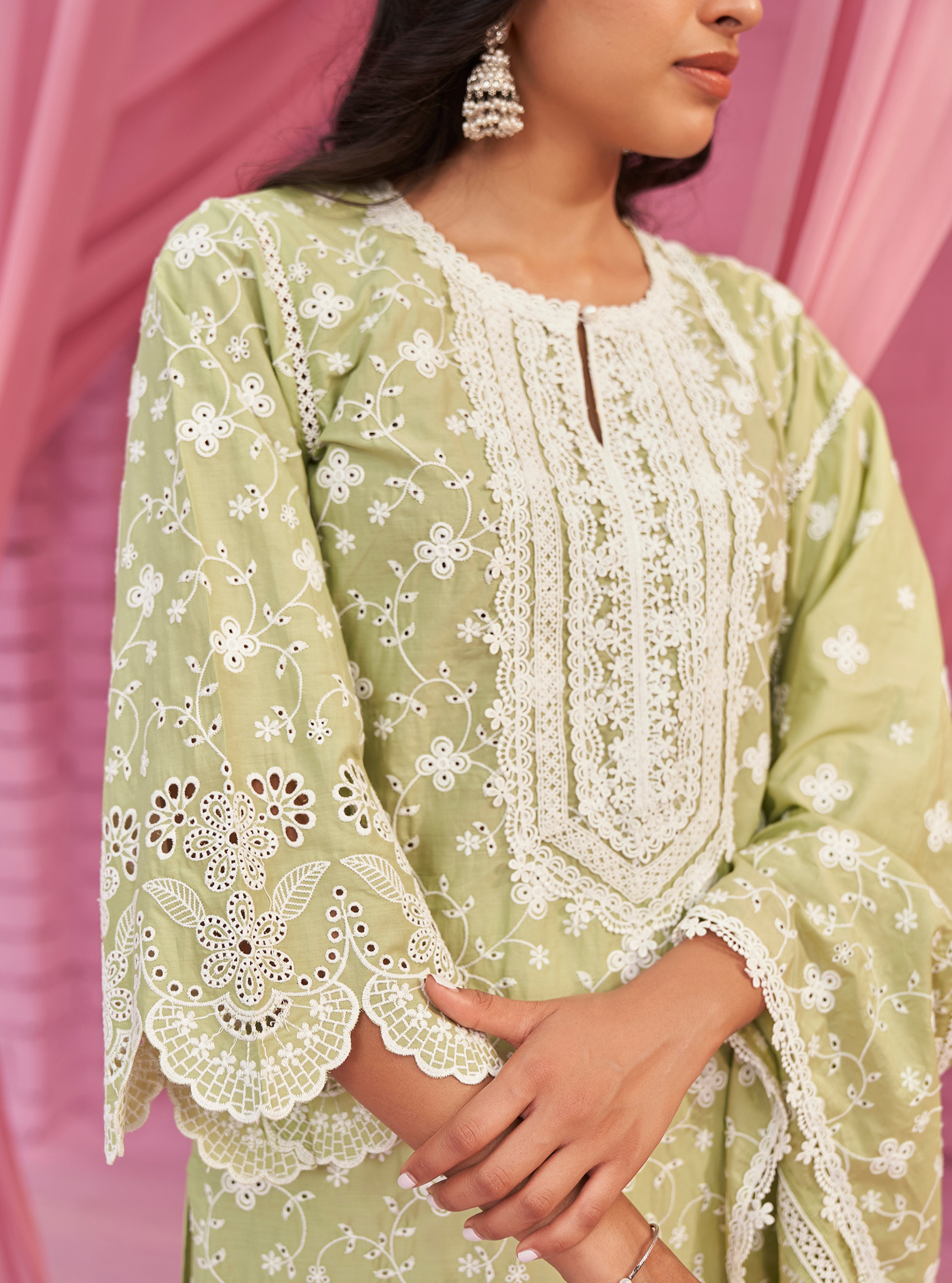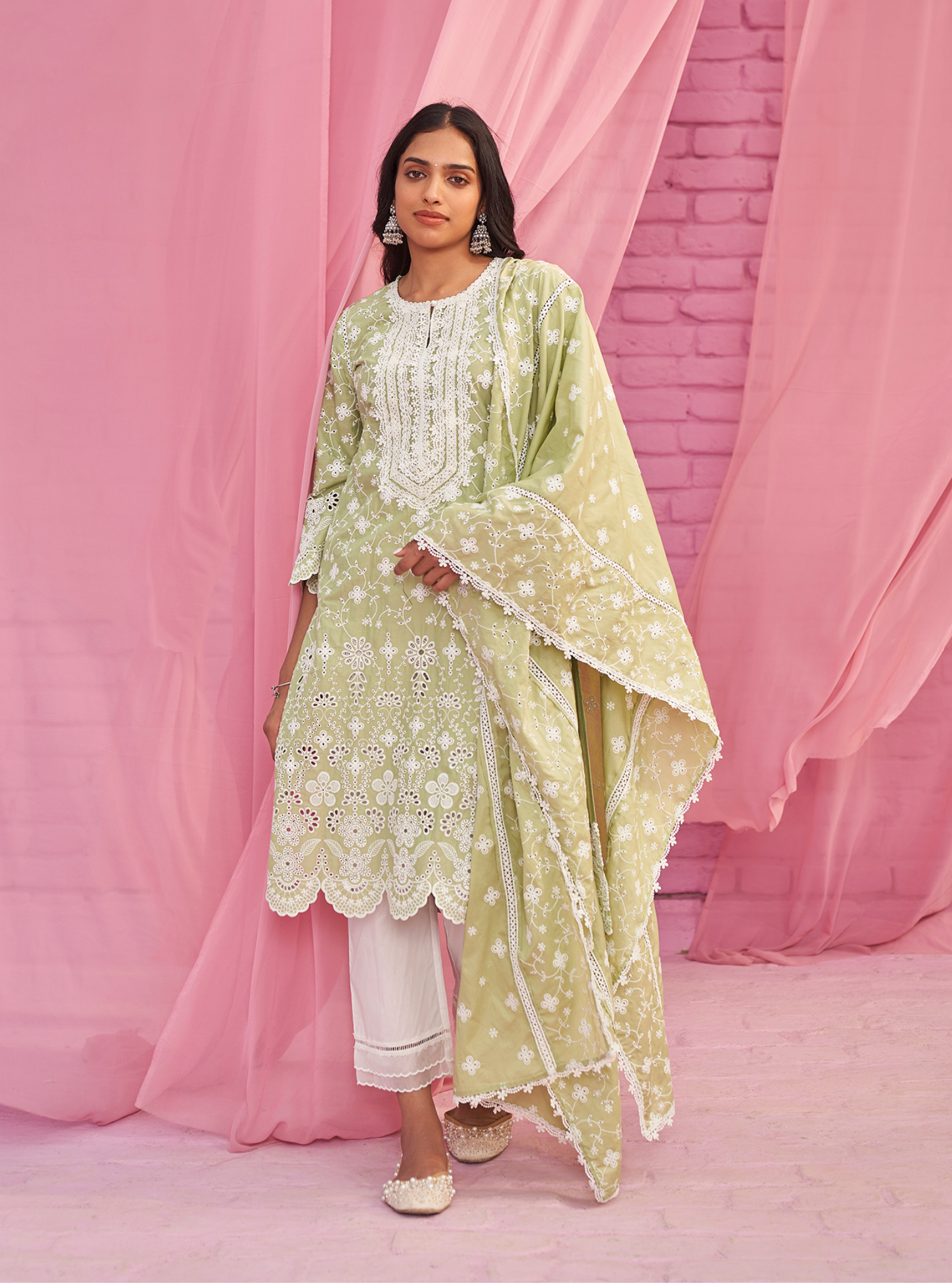 Contact Us For CustomizationThis serene green kurta set perfectly blends tradition and contemporary flair. The kurta is adorned with delicate white floral motifs that stand out beautifully against the blue fabric, creating a captivating contrast. The round neckline is adorned with intricate embroidery, while the sleeves and hemline are scalloped. The dupatta is crafted in a similar delicate hue and features intricate embroidery to mirror that on the kurta. Together, they create a regal and harmonious look.