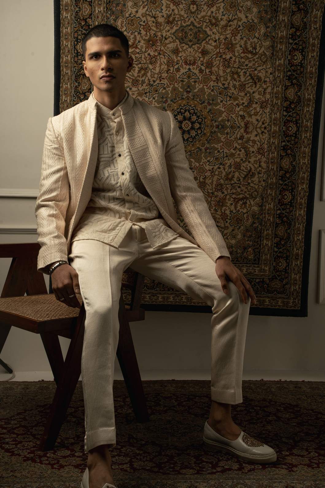 The ivory ensemble exudes a graceful fusion of traditional and contemporary elements, with an unmistakable Indo-Western essence. Crafted from luxurious georgette fabric, each layer of the ensemble is adorned with intricate tonal silk thread embroidery, adding an exquisite touch of elegance and sophistication.