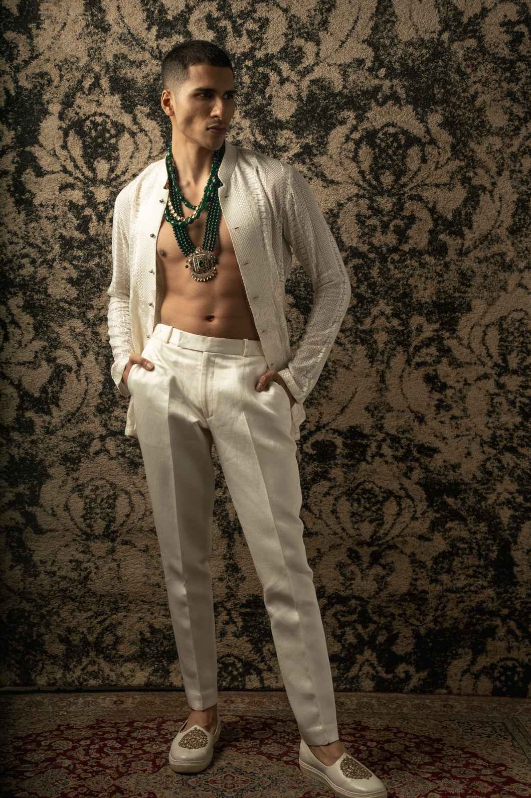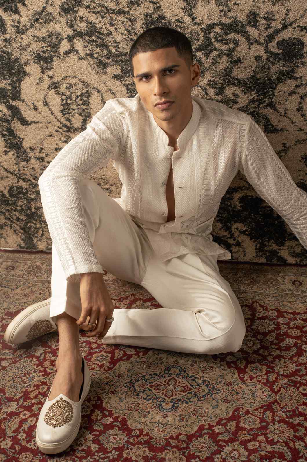 An ivory silk georgette ensemble, boasting intricate textured tonal embroidery, creates a fabric illusion while being meticulously hand-embroidered, offering a blend of elegance and craftsmanship in every stitch.