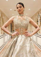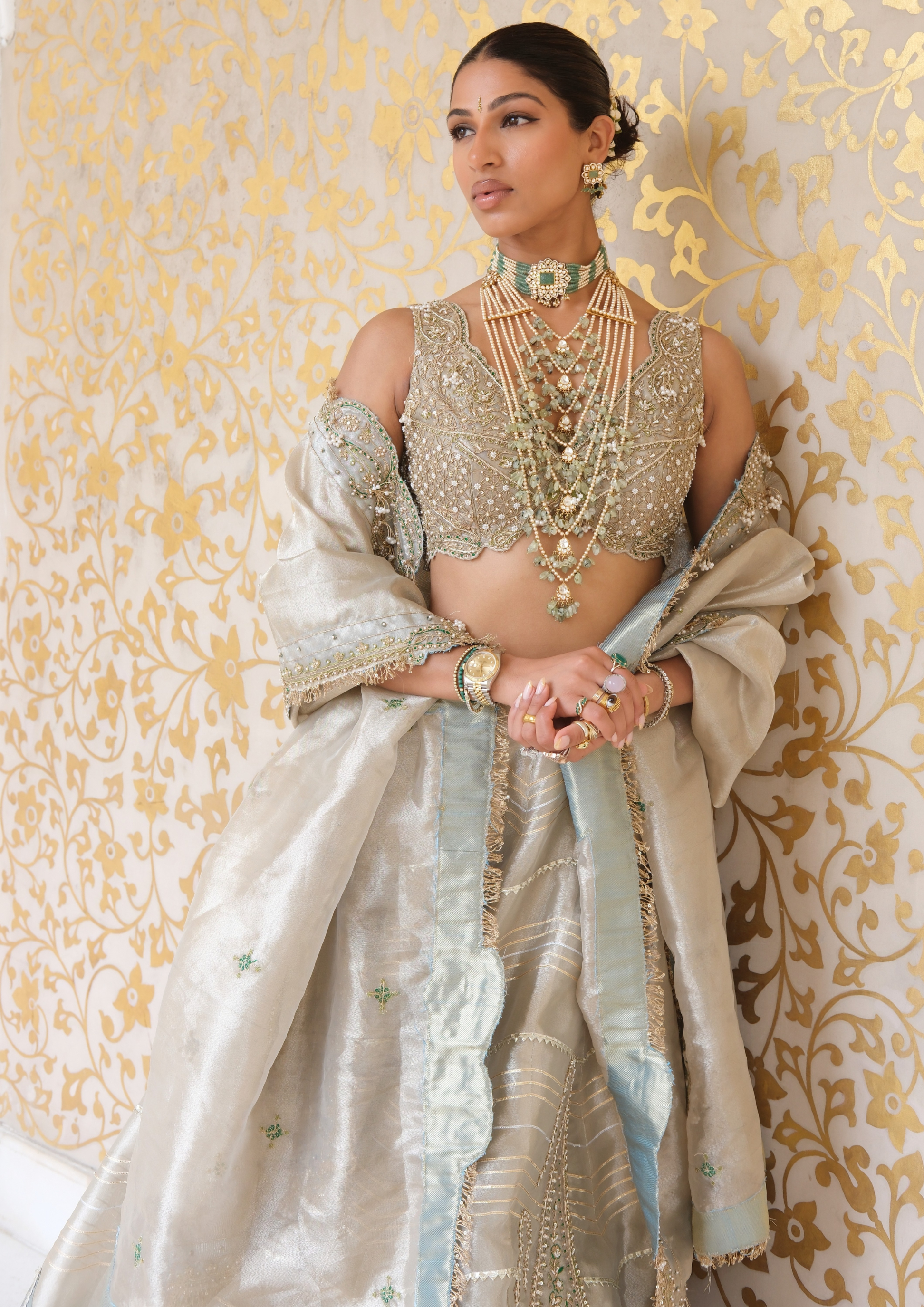 This Kalidar lehenga set in pearl gold silk zari tissue and Jacquard silk Banarasi features Jharokha-inspired panels, elongated paisley embroidery, and intricate embellishments. The ensemble includes an embroidered blouse adorned with paisley motifs and a pearl gold tissue dupatta detailed with paisley cutwork and pearl details.