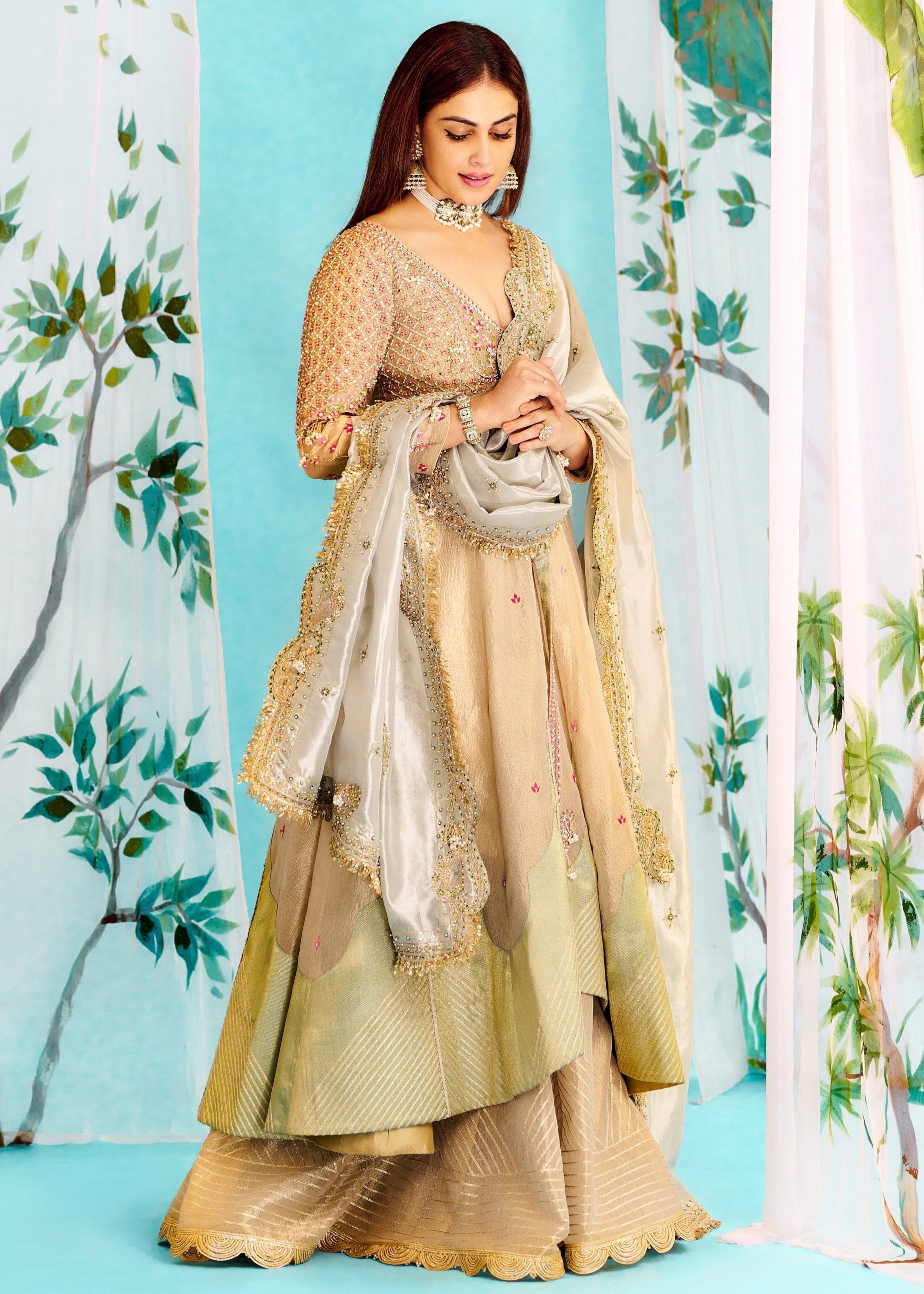 Genelia Deshmukh in our Pearl ivory silk Zari tissue jacket with sharara and Dupatta
