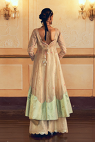 This Kalidar jacket set in pearl ivory silk zari tissue and Jacquard Banarasi showcases Jharokha-inspired panels with intricate paisley embroidery. The ensemble is completed with a sharara crafted from crushed tissue featuring scalloped border at the hem, and a pearl ivory tissue dupatta featuring floral motifs and pearl detailing.