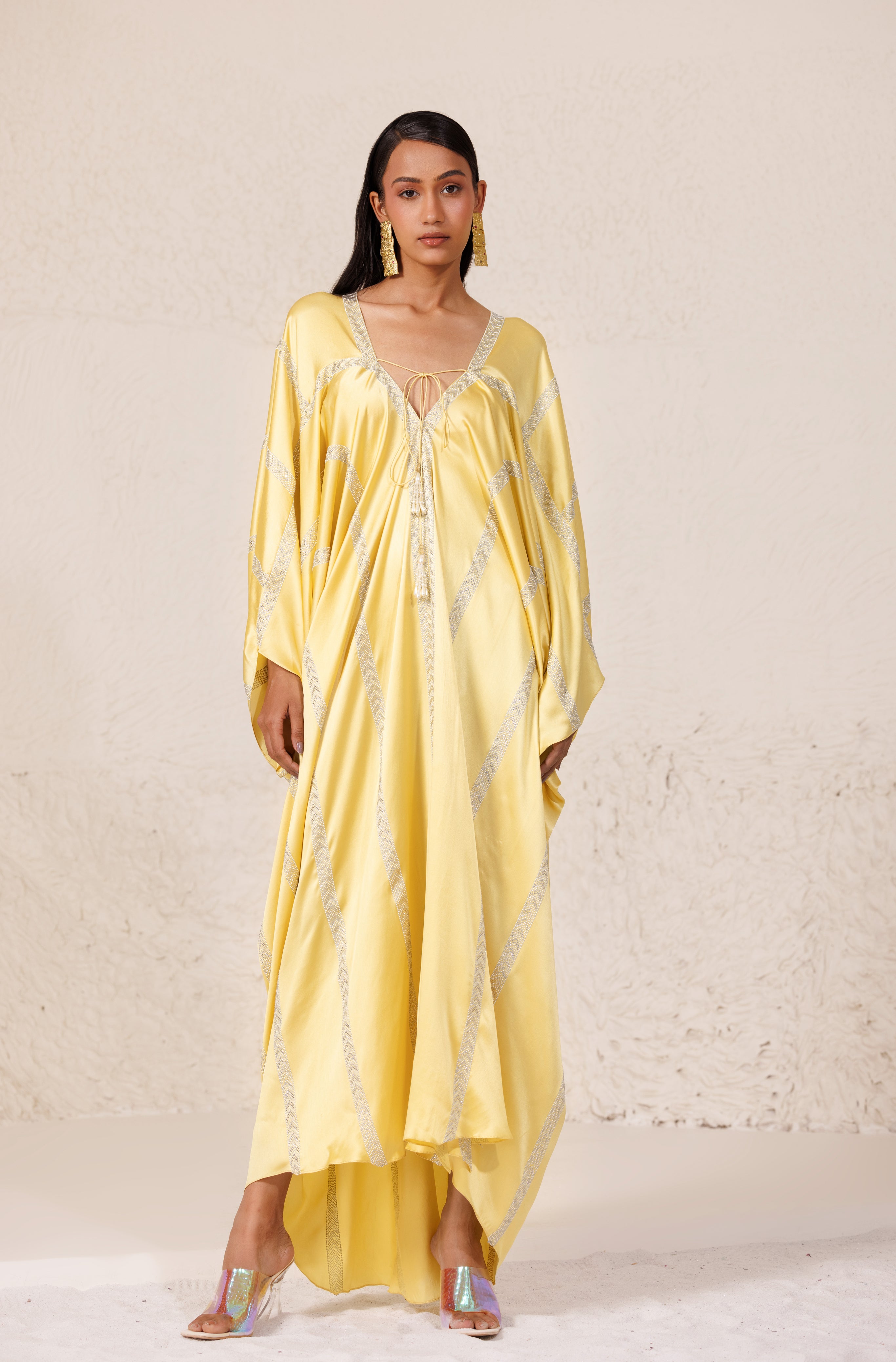 A luminous yellow silk satin kaftan, gracefully adorned with an intricate pattern of embellished rhinestones. This ensemble exudes a harmonious blend of opulence and modernity, creating a captivating and elegant look that captures the essence of refined beauty.