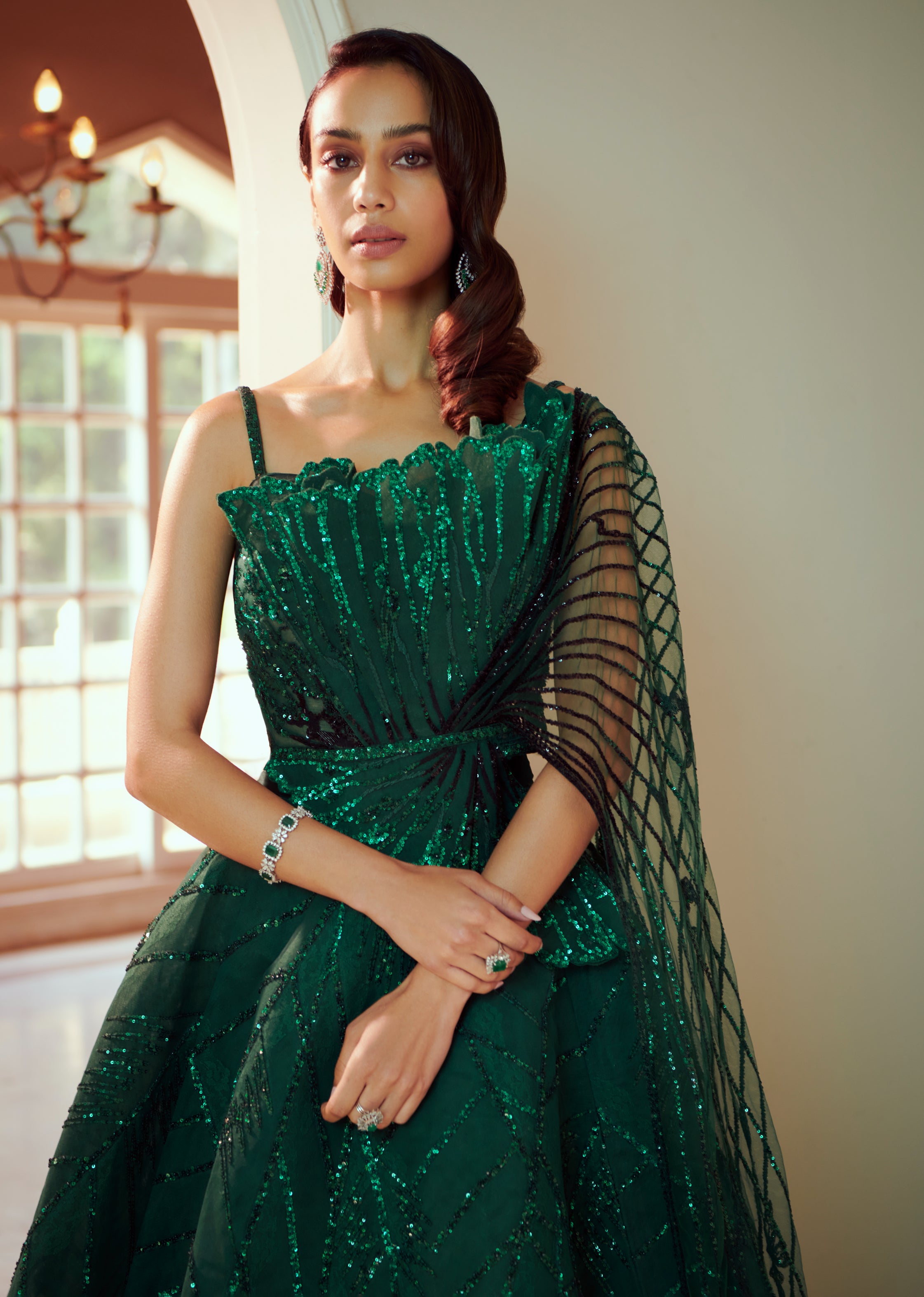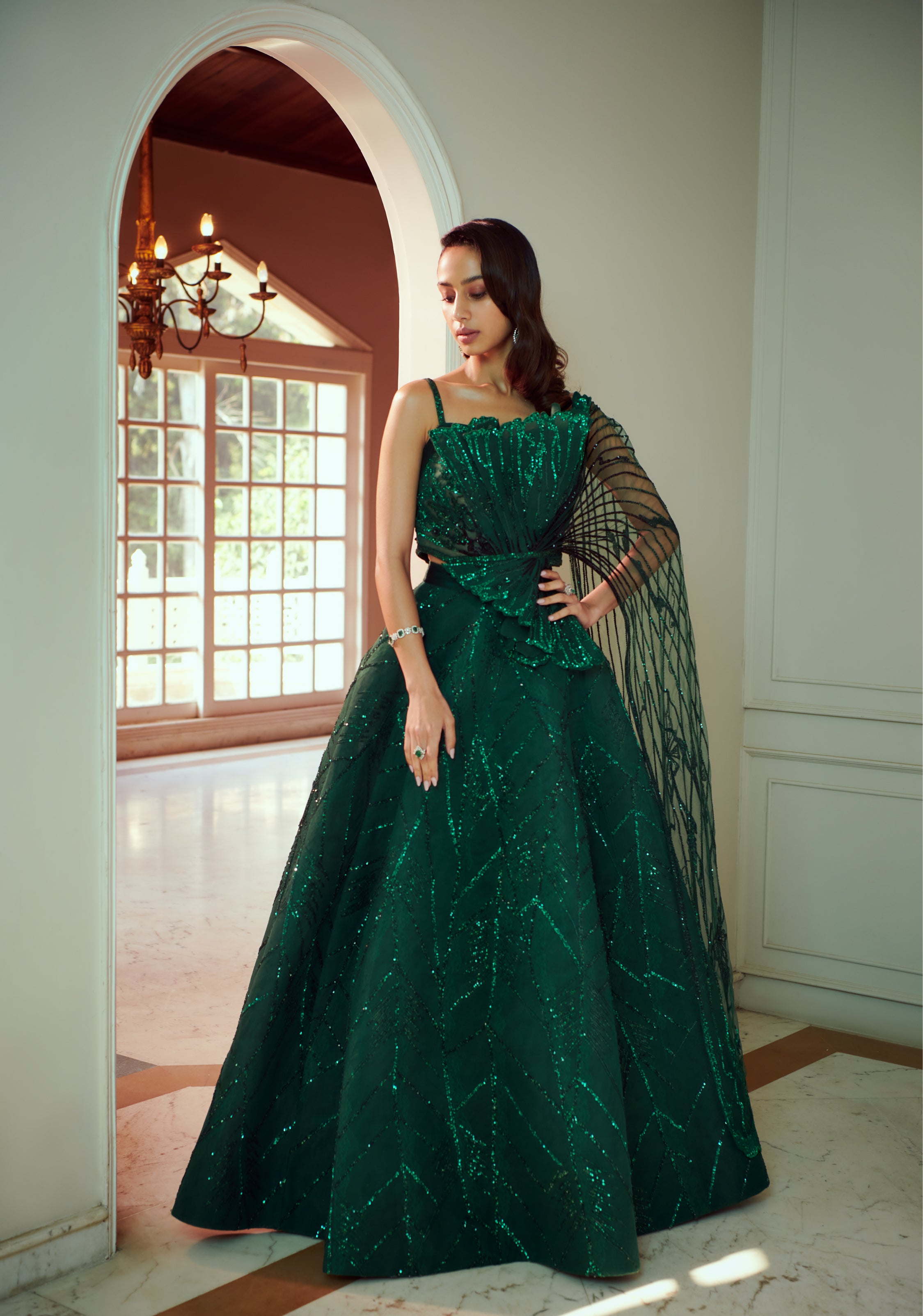 Glazed skirt with interwind embroidery . It comes with asymmetrical bodice pattern and attached dupatta.
