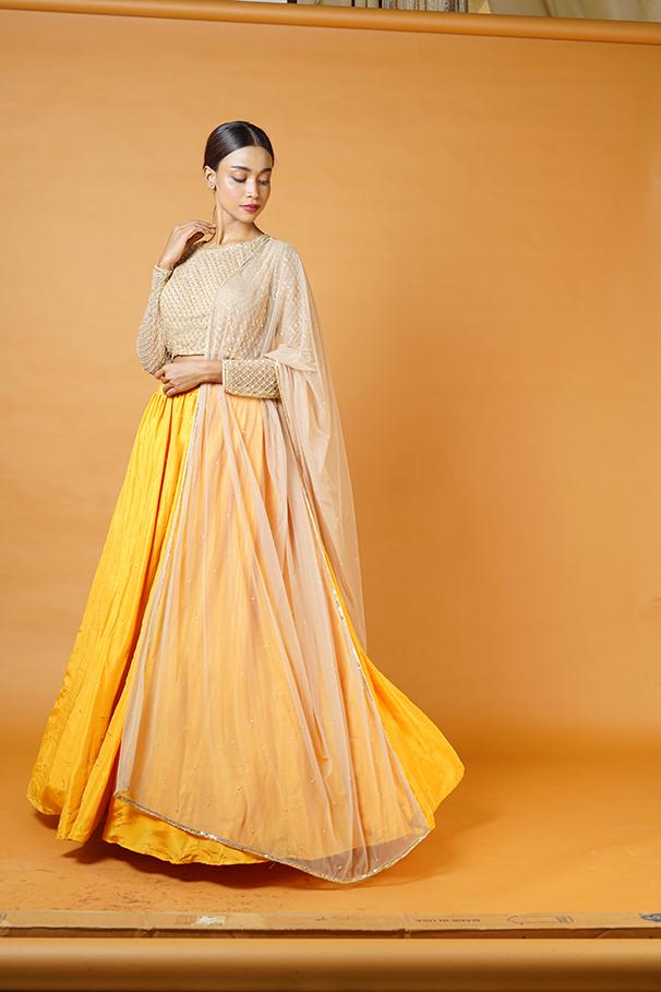 Gold blouse and dupatta with fire yellow lehenga