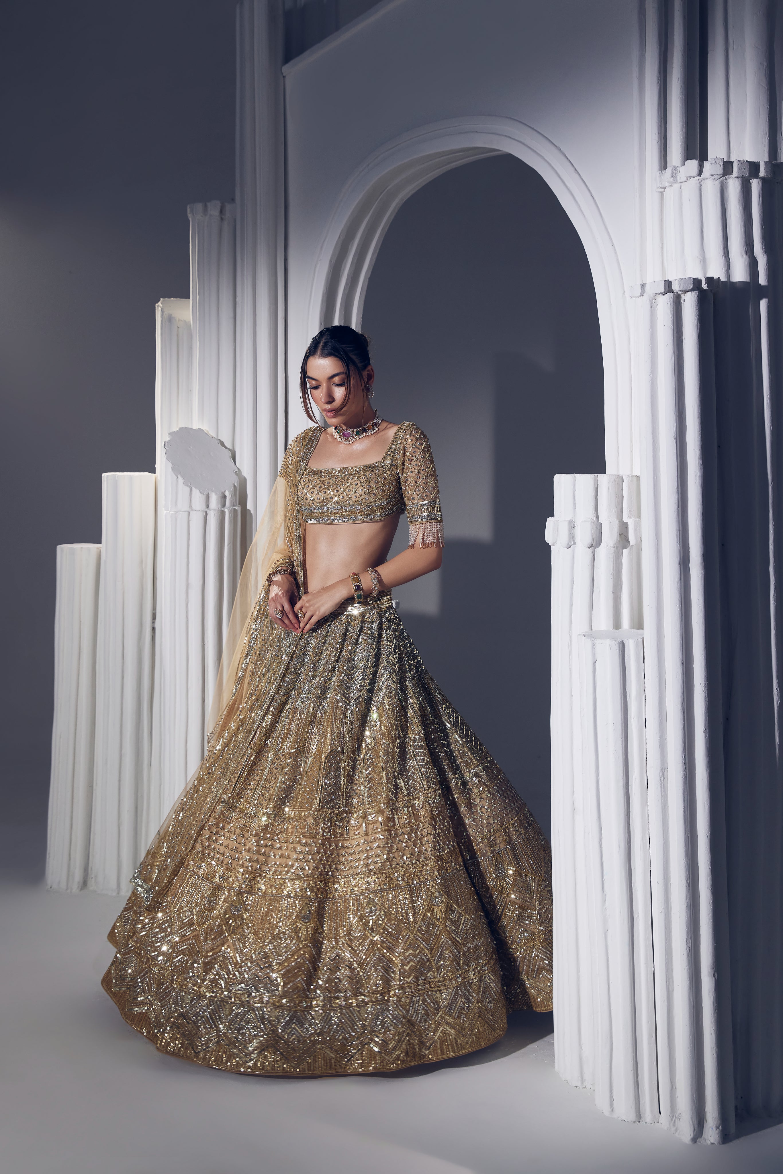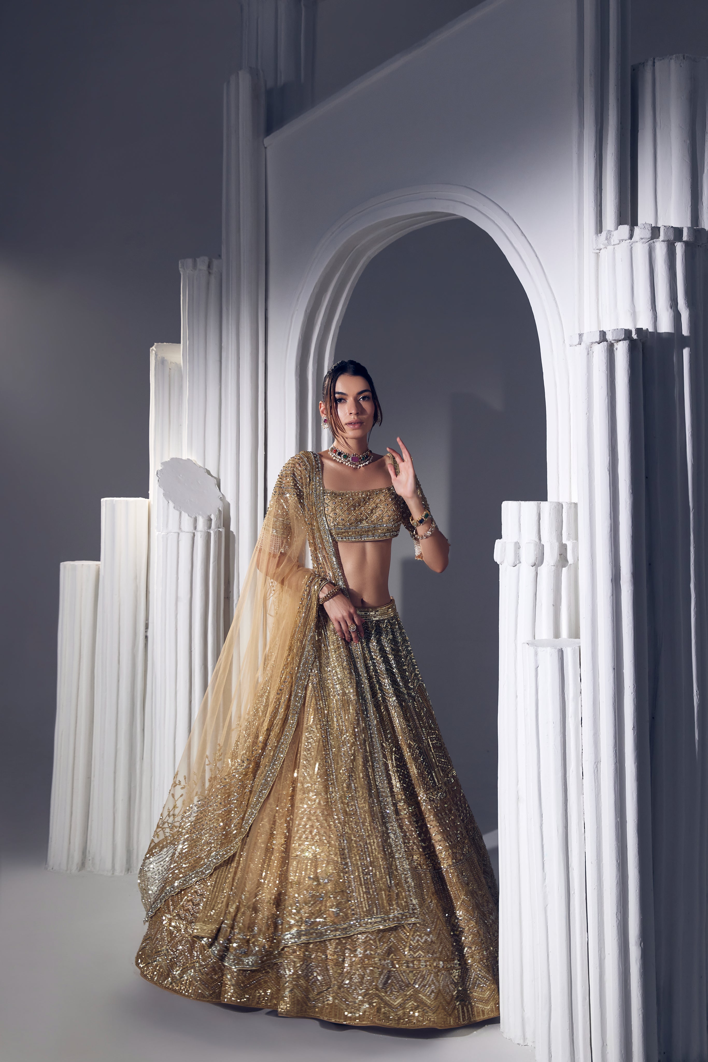 GOLD COLOR LEHENGA SET FEATURES GOLD EMBELLISHED EMBROIDERY MIXED RUCHIKA HURRIA STATEMENT EMBROIDERY ELEMENTS PAIRED WITH STYLISH BLOUSE WITH STATEMENTS CRYSTAL EMBELLISHMENT. THE SET WITH PAIRED WITH NET DUPPATTA WITH STYLISH BORDER AND SCATTERED SWAROSKI WORK ON THE INSIDE.