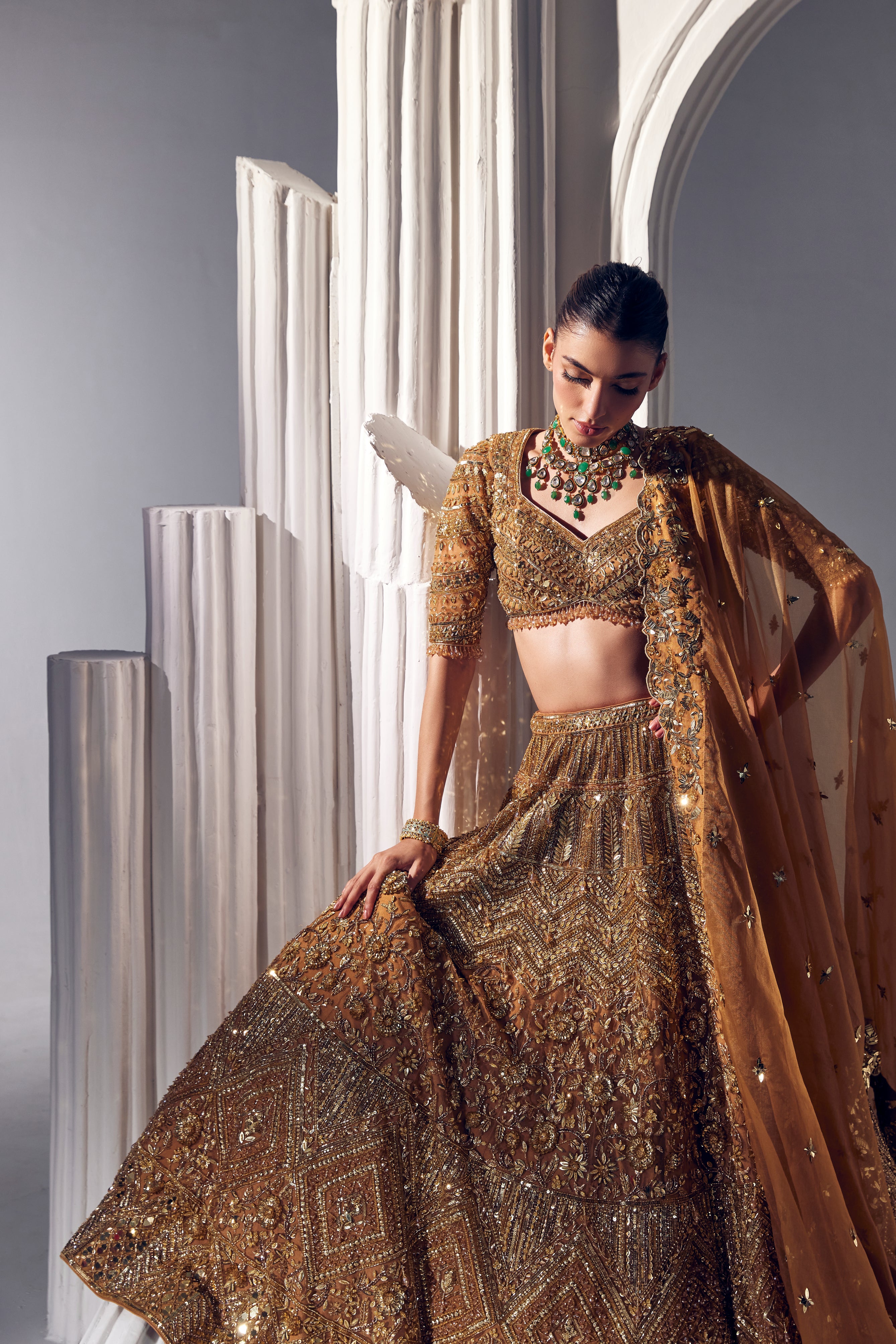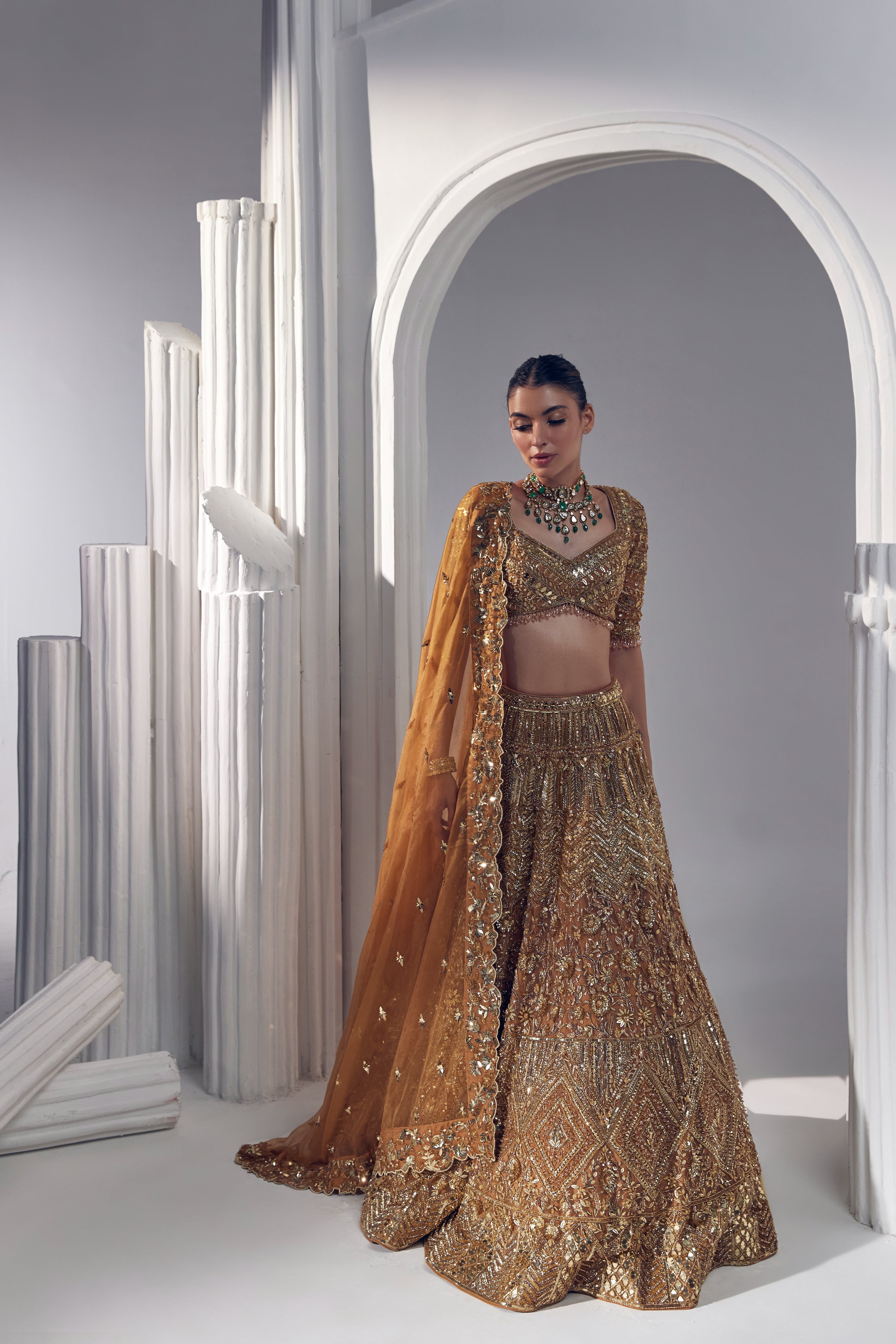 GOLD COLOR LEHENGA SET FEATURES GOLD EMBELLISHED EMBROIDERY MIXED RUCHIKA HURRIA STATEMENT EMBROIDERY ELEMENTS PAIRED WITH STYLISH BLOUSE WITH STATEMENTS CRYSTAL EMBELLISHMENT. THE SET WITH PAIRED WITH NET DUPPATTA WITH STYLISH BORDER AND SCATTERED BOOTI WORK ON THE INSIDE.