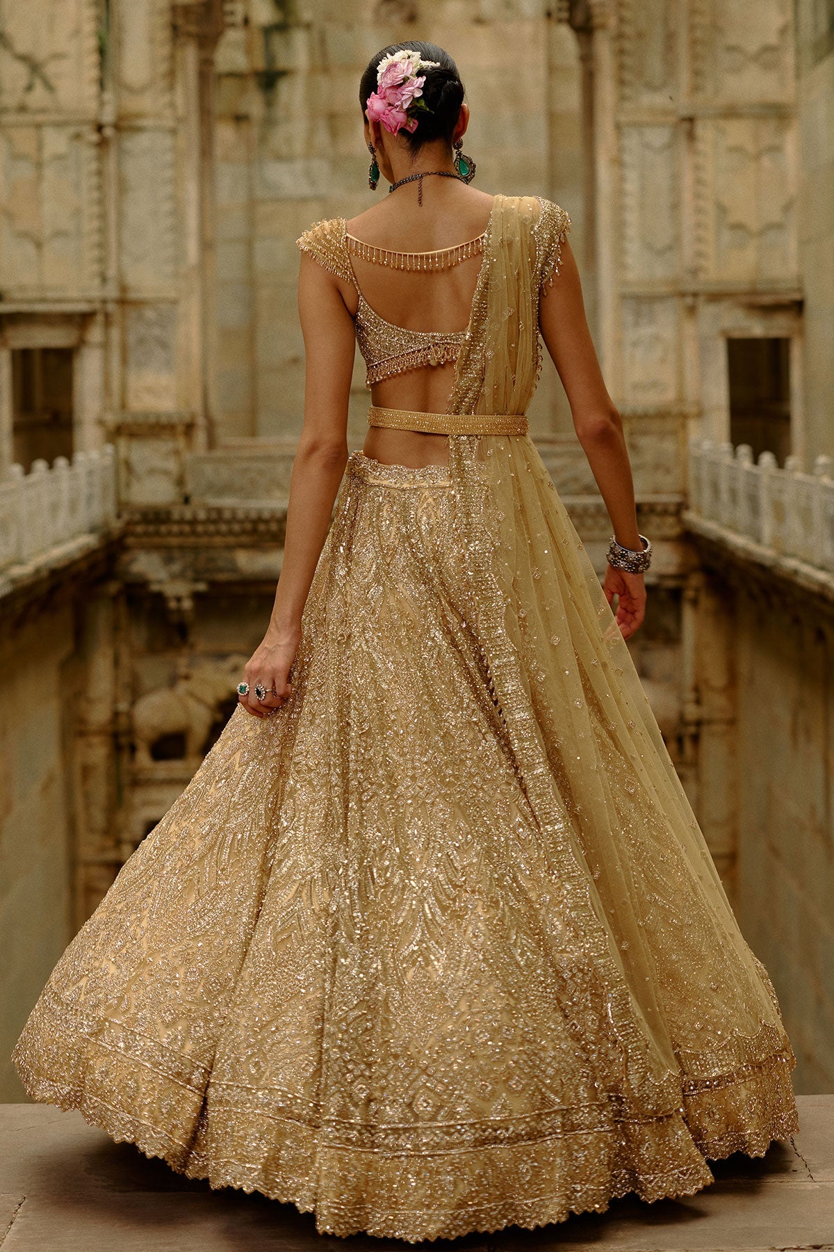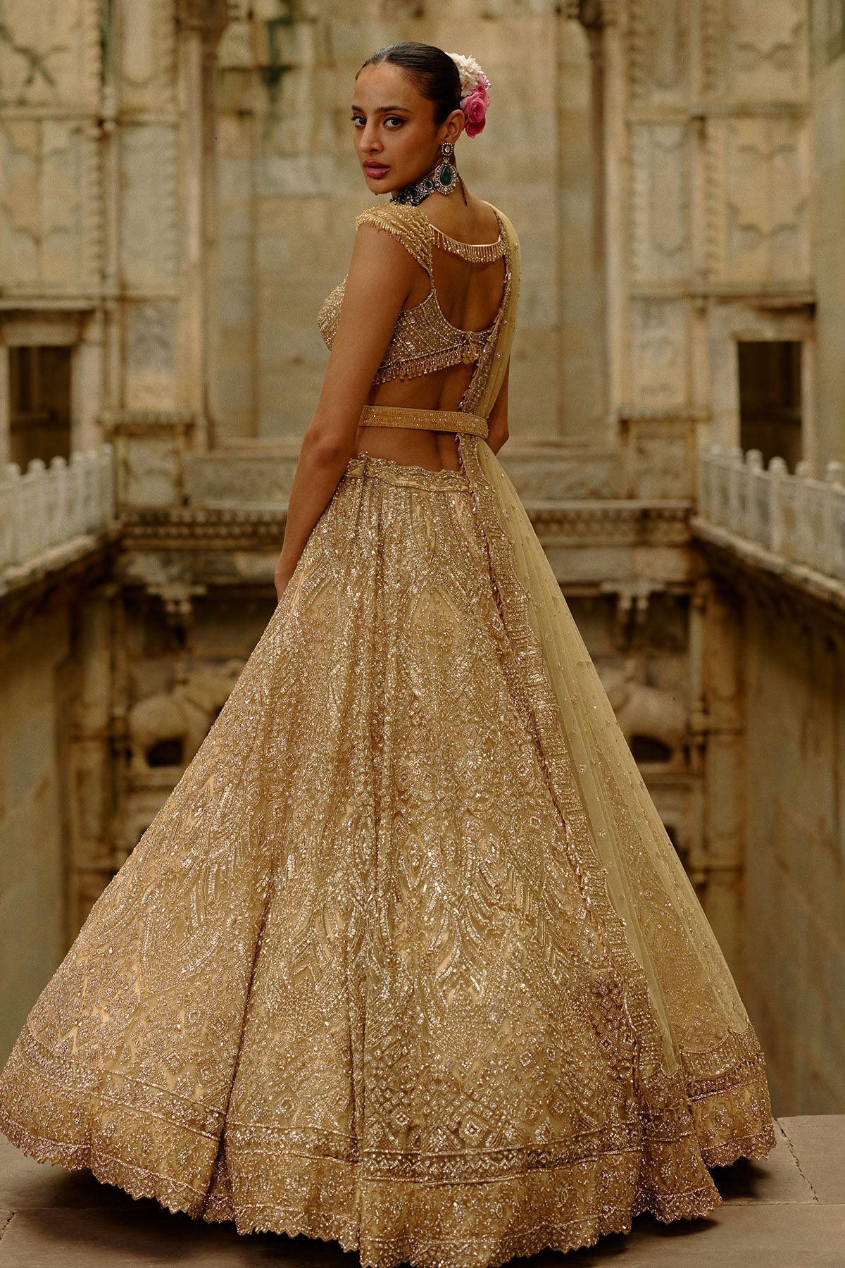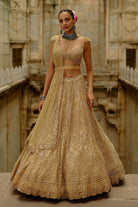 Gold net lehenga dupatta set adorned with crystals, cutdana, sequins, and delicate beadwork.