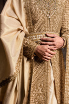 Gold Raw Silk Achkan Embroidered in antique dori with dabka and beadwork with a belt and monga silk kurta and churidar.