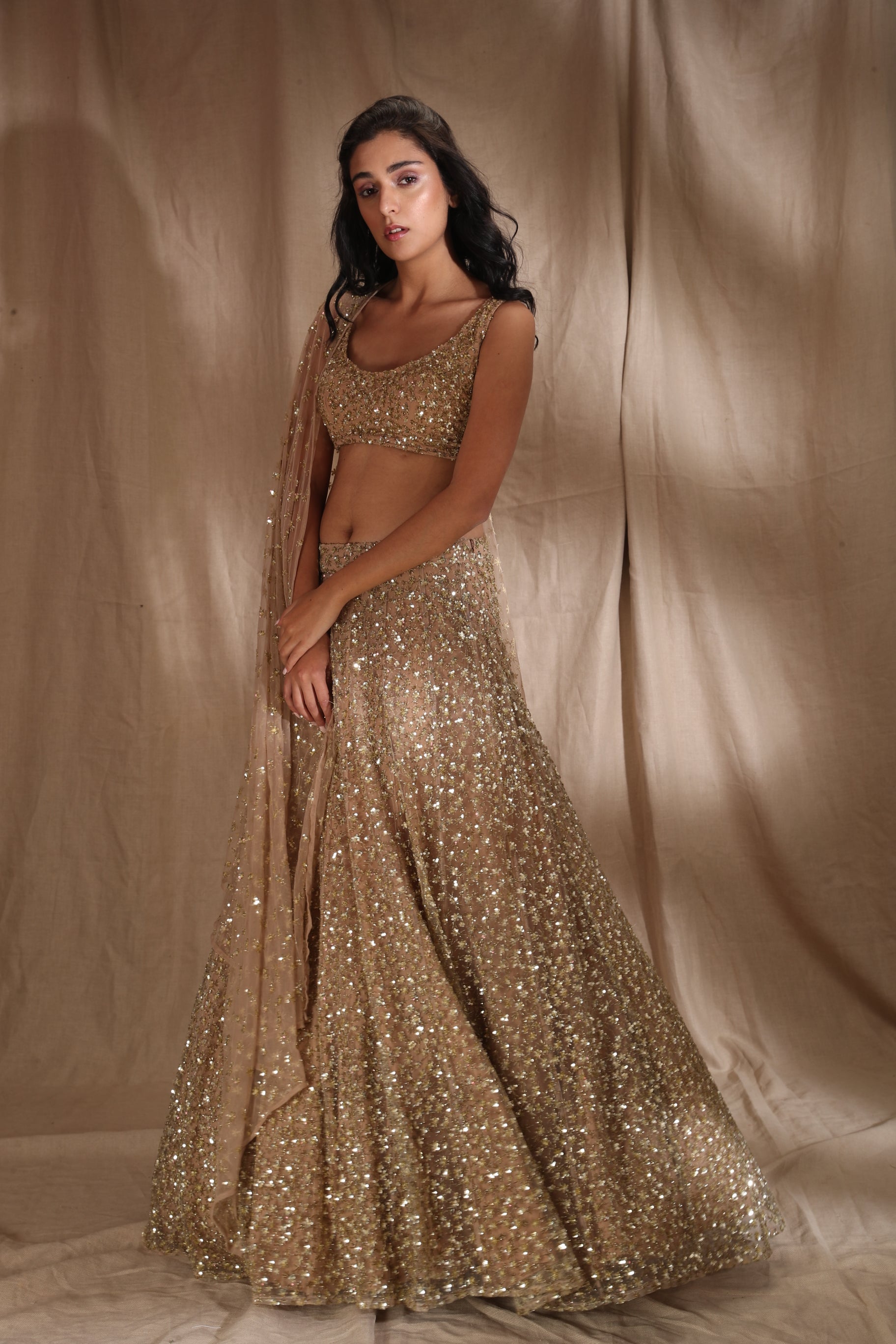 Featuring a GOLD SHIMMER LEHENGA IN NET.