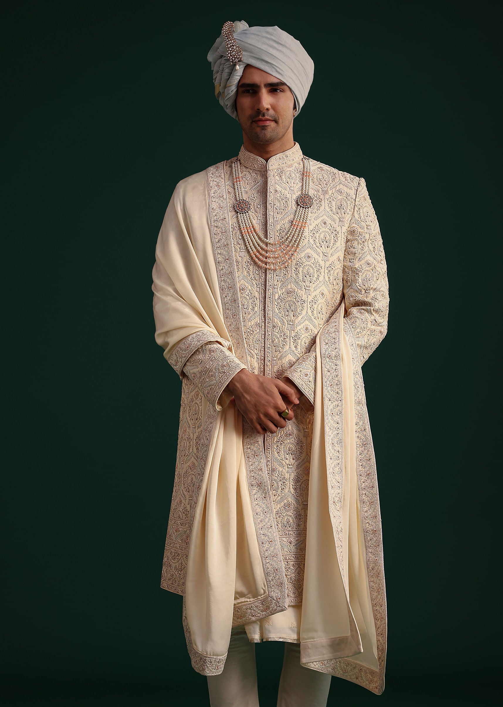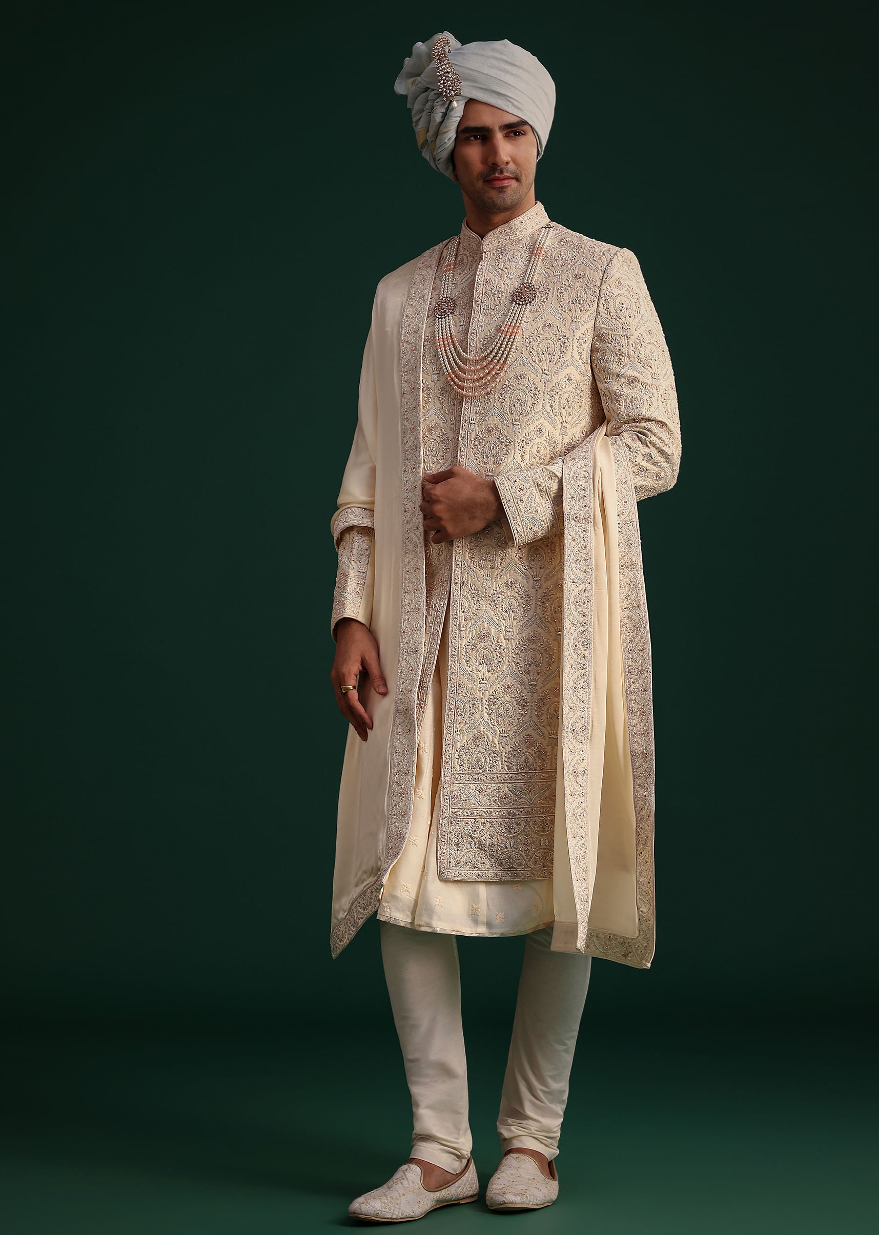 Our offwhite silk sherwani set exudes refined elegance and sophistication. Detailed with a mandarin collar front hookeye placket and full sleeves the exquisite artistry is highlighted with accents of pearl cutdana and sequin embroidery. Paired with a complementing kurta dupatta and coordinating bottoms don this outfit to leave a lasting impression at any celebration. Awarded as the Most Trusted Brand, we're delivering styles you love, just as promised.