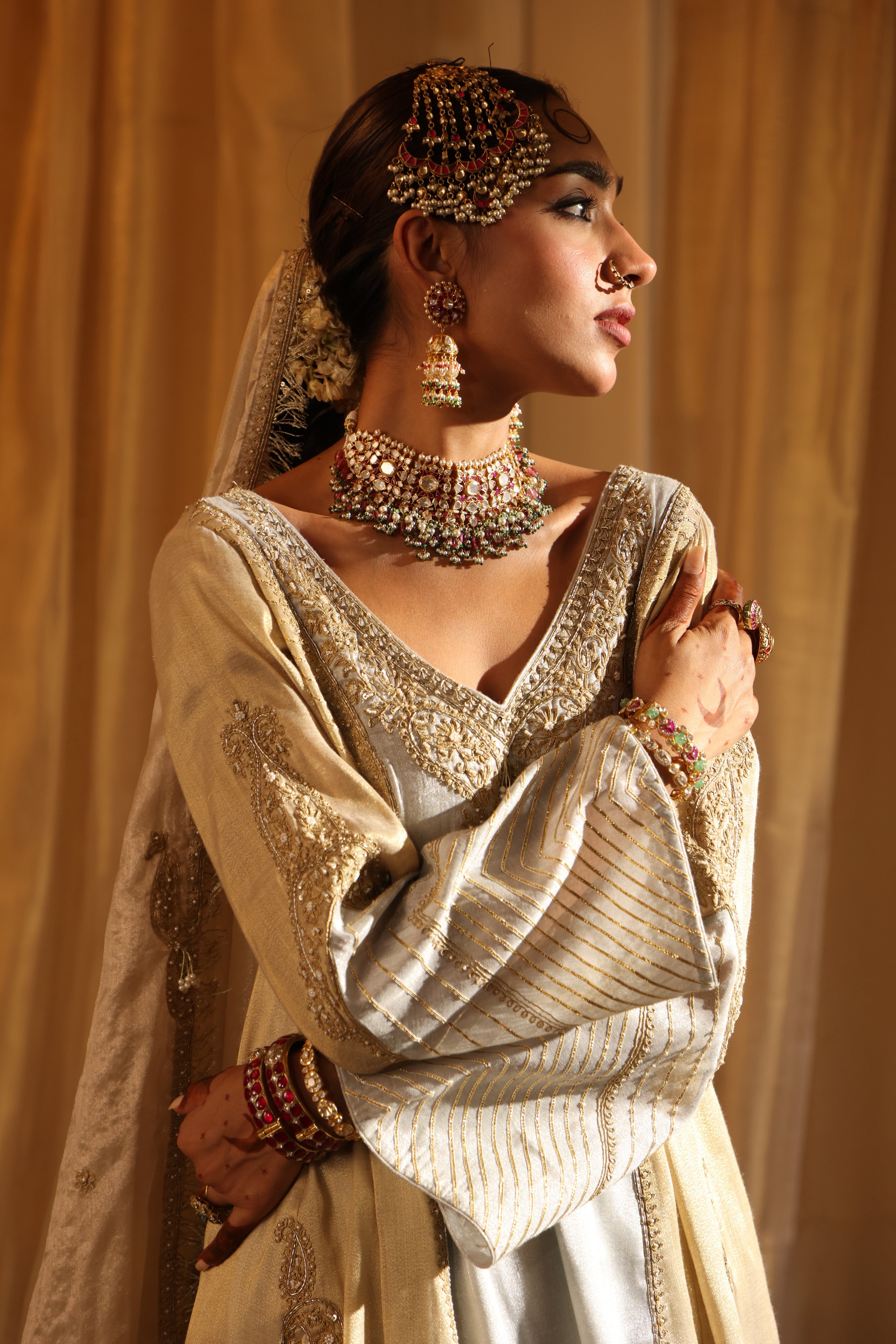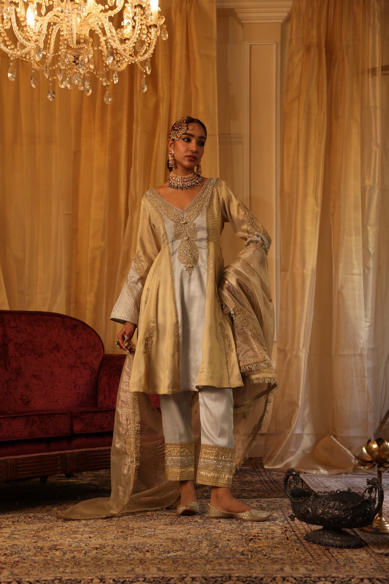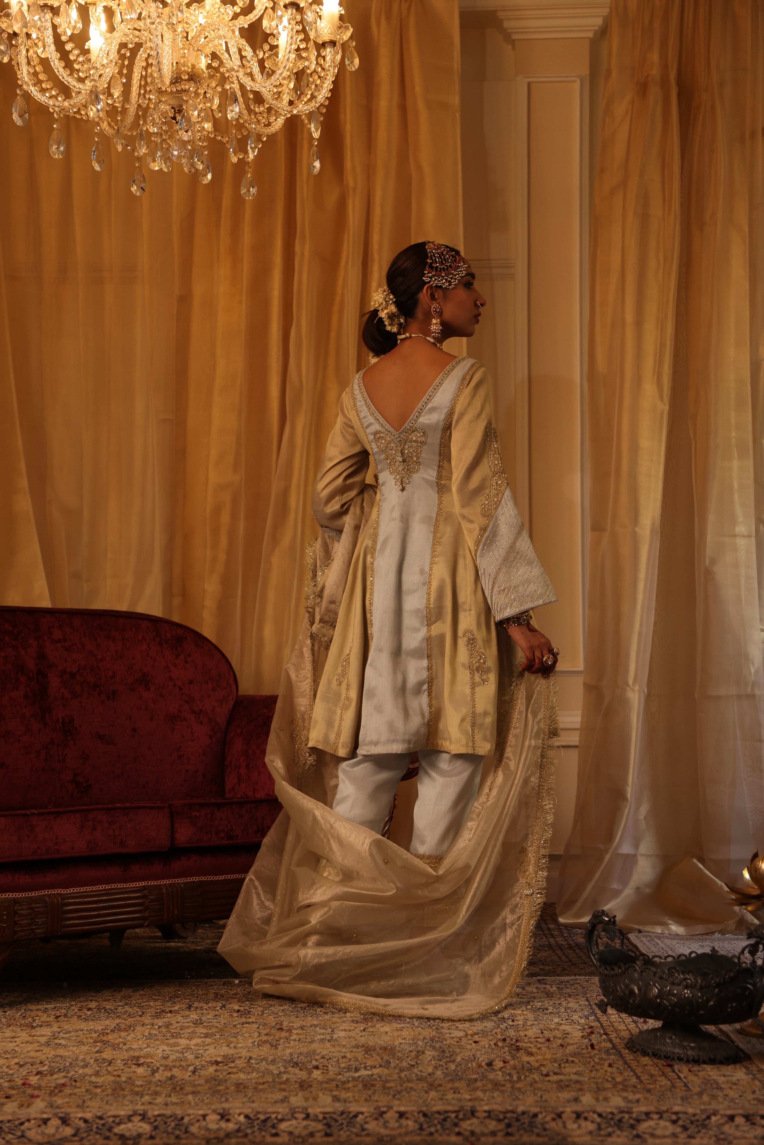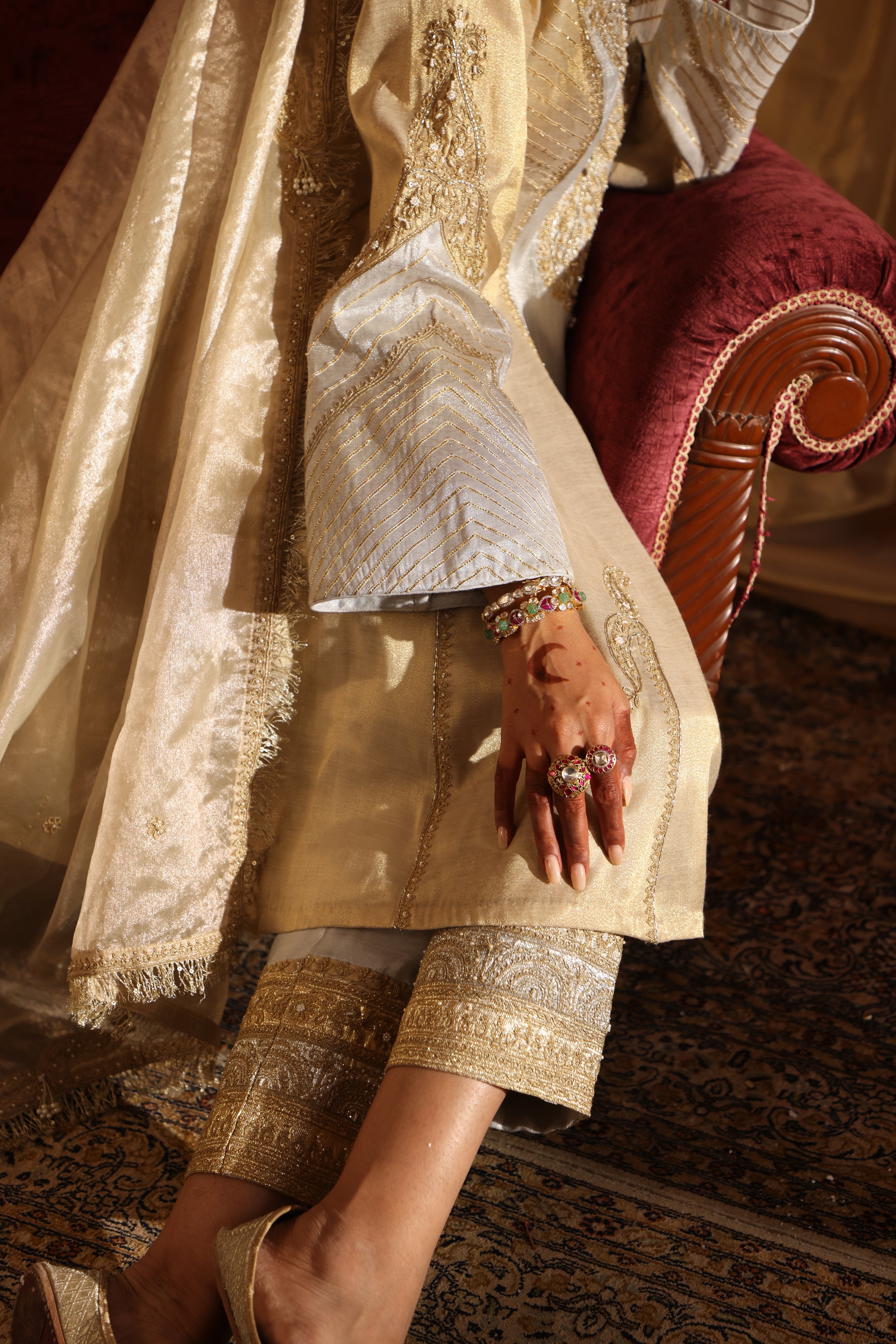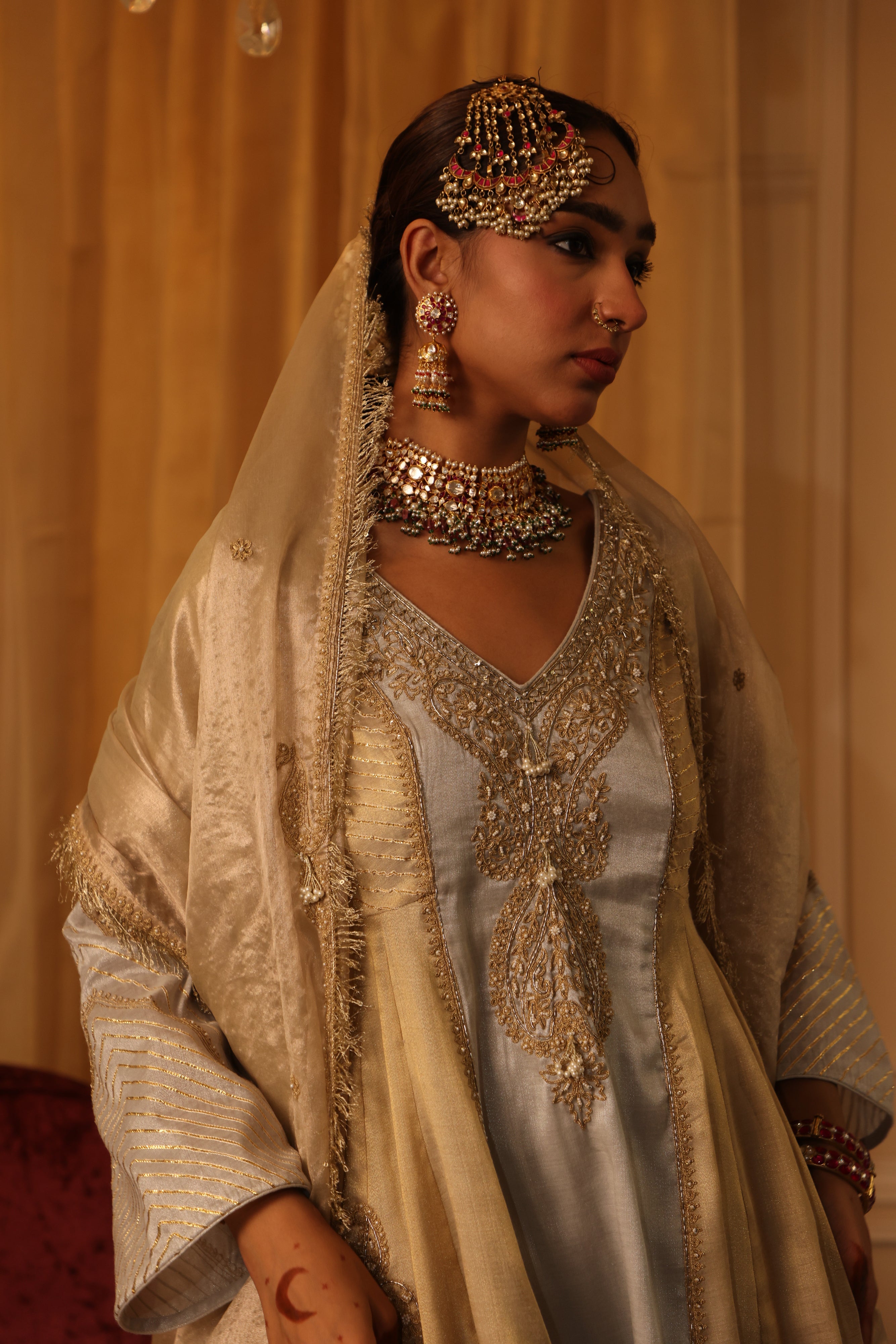 This gold and silver cotton tissue ensemble radiates regal charm. The short kurta, crafted with gold and silver panels, features intricate paisley motifs and delicate hand embroidery, enhanced with zari, dori work, and gota texturing. The straight pants shimmer with lampi and intricate embroidery, while the tissue dupatta completes the look with pearl work, dori embroidery, and elegant fringe edges Fabric: Cotton Tissue |