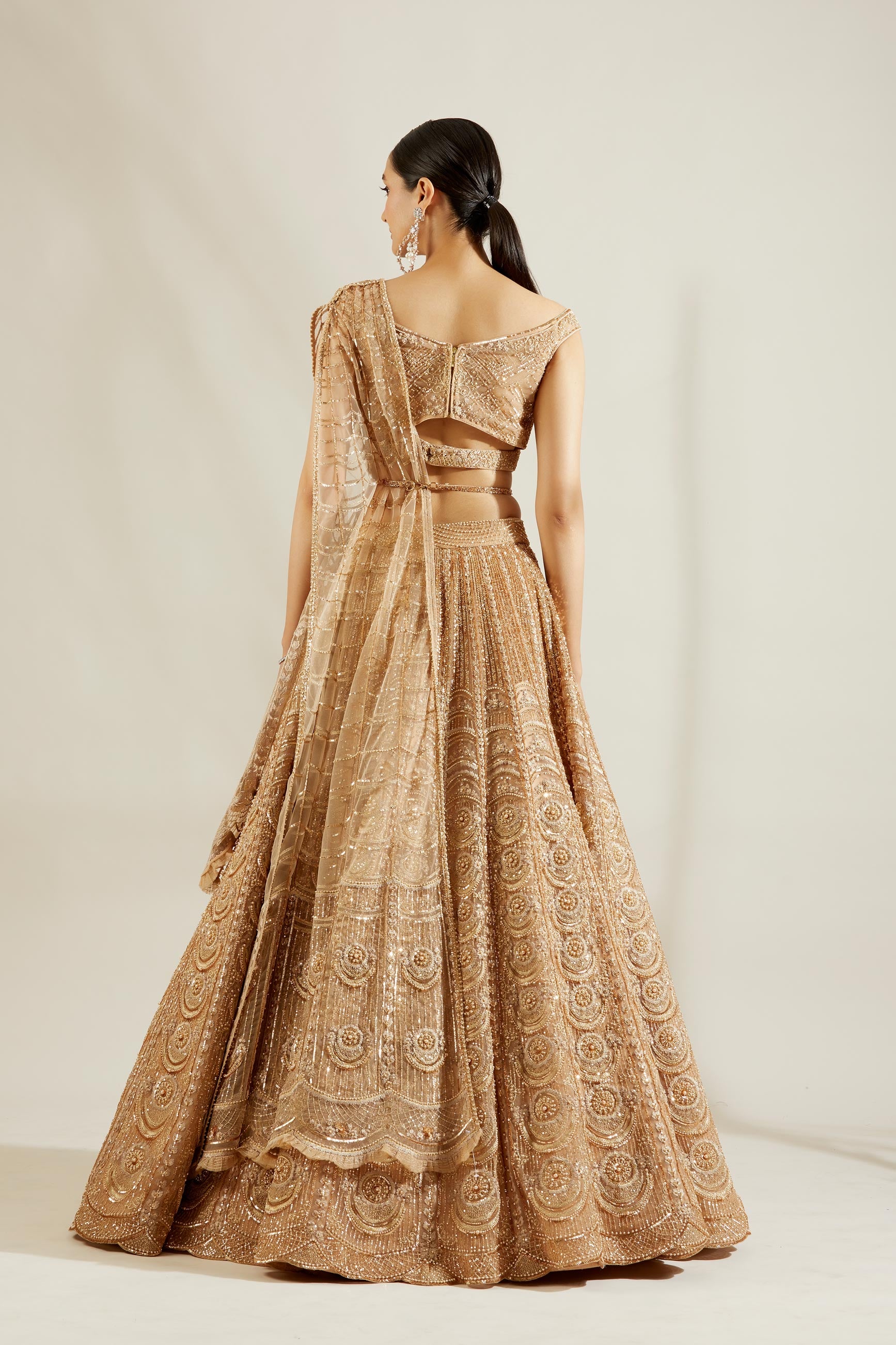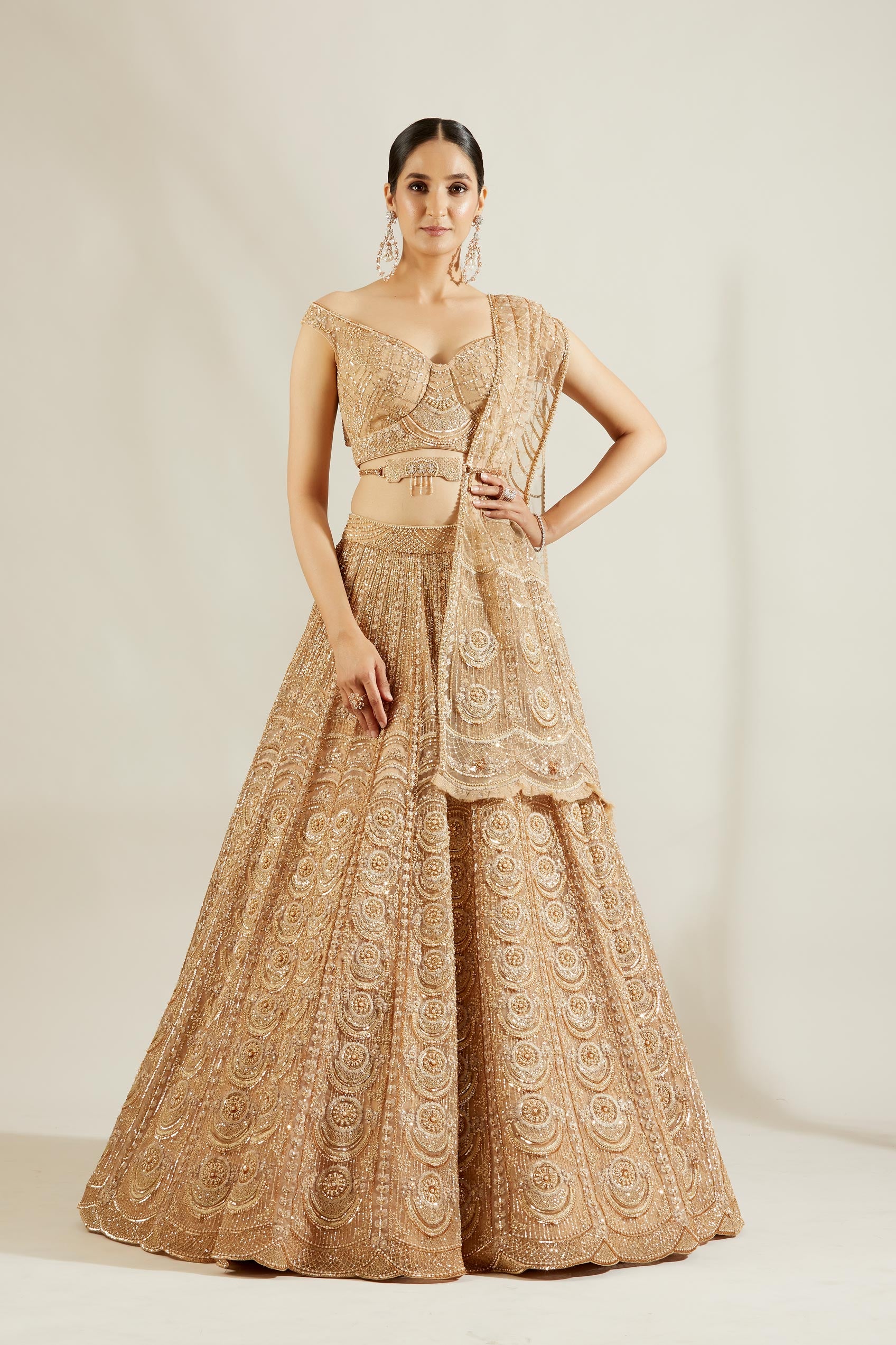 Golden dori mandala lehenga with pear embellishment all over paired with sensual neckline blouse and a dupatta.