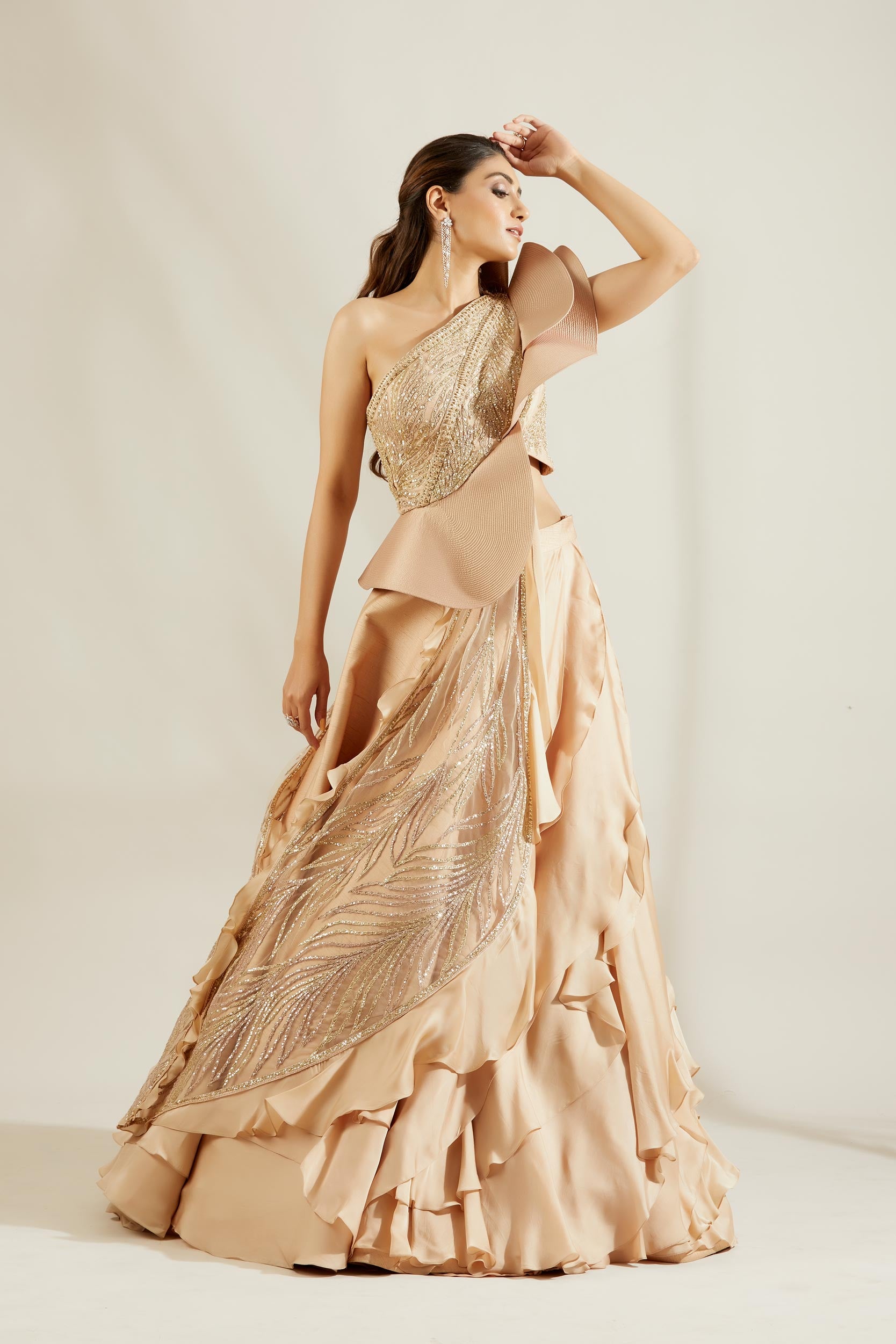 Golden leaf peplum one shoulder top with placement embroidery comes wwith an organza ruffle skirt showinh the golden tints of transparancy and an attached dupatta.