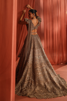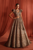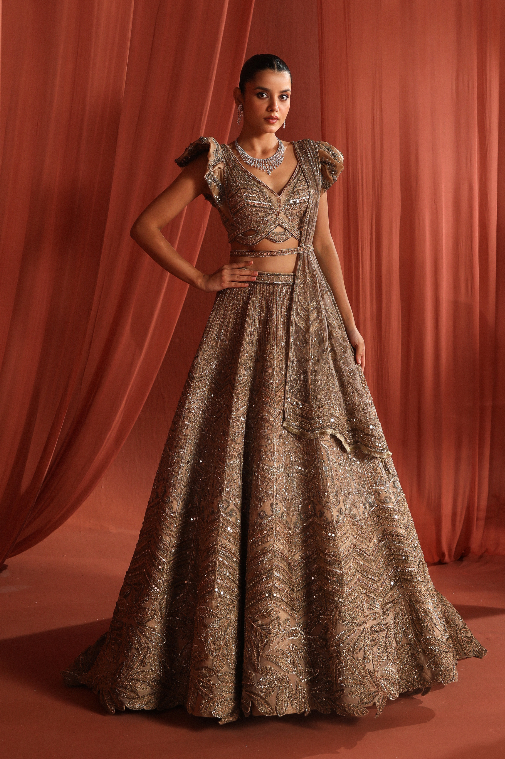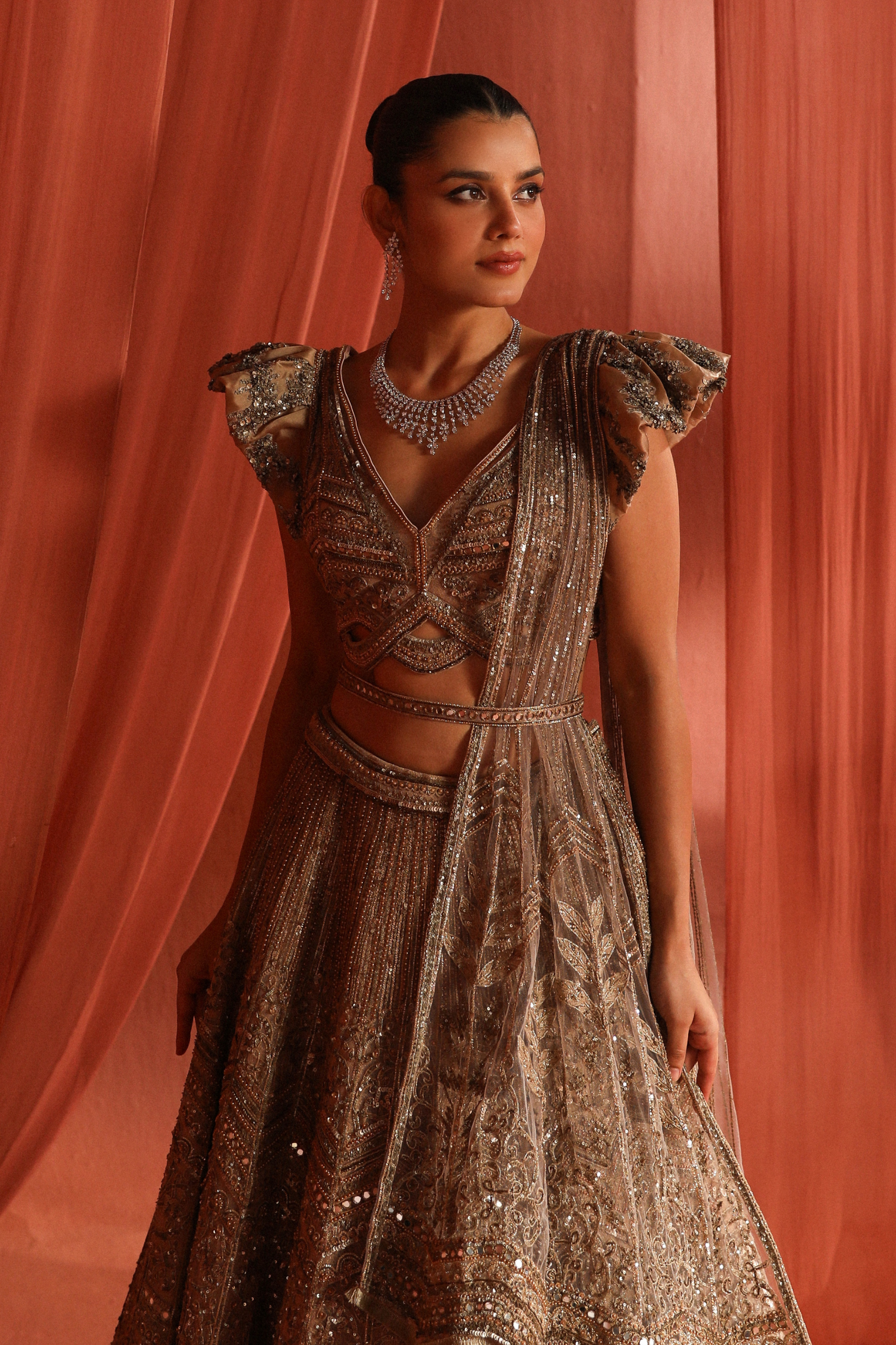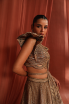 Dusky orchid sheeny blouse paired with a heavily embroidered elegant lehenga, and dupatta