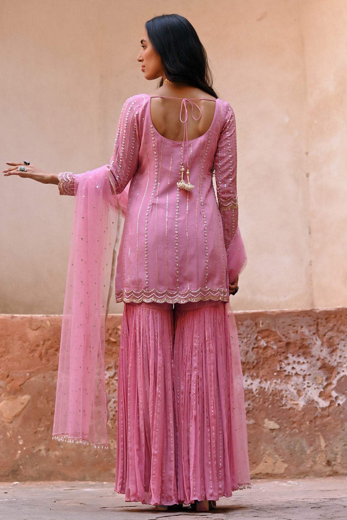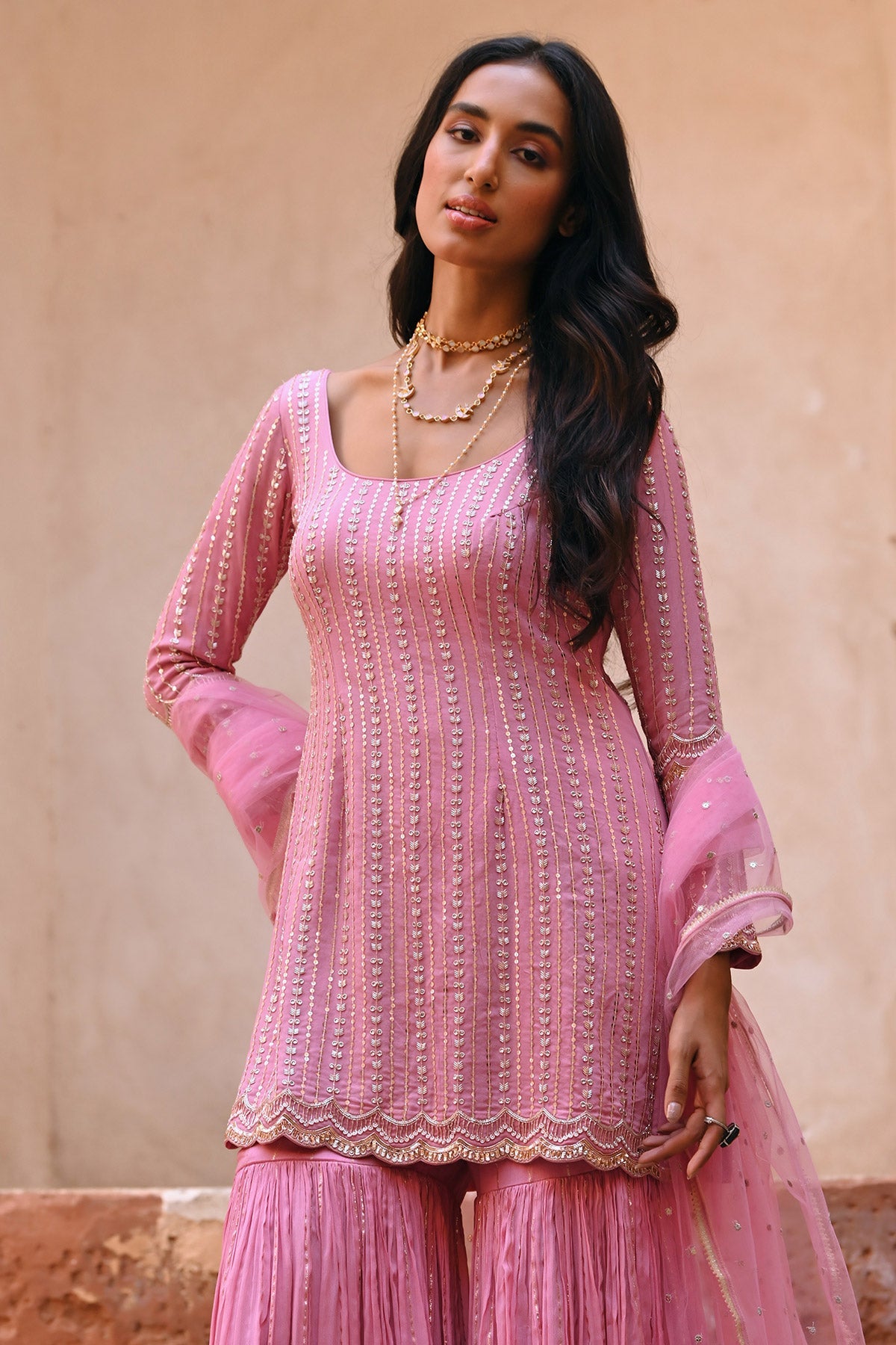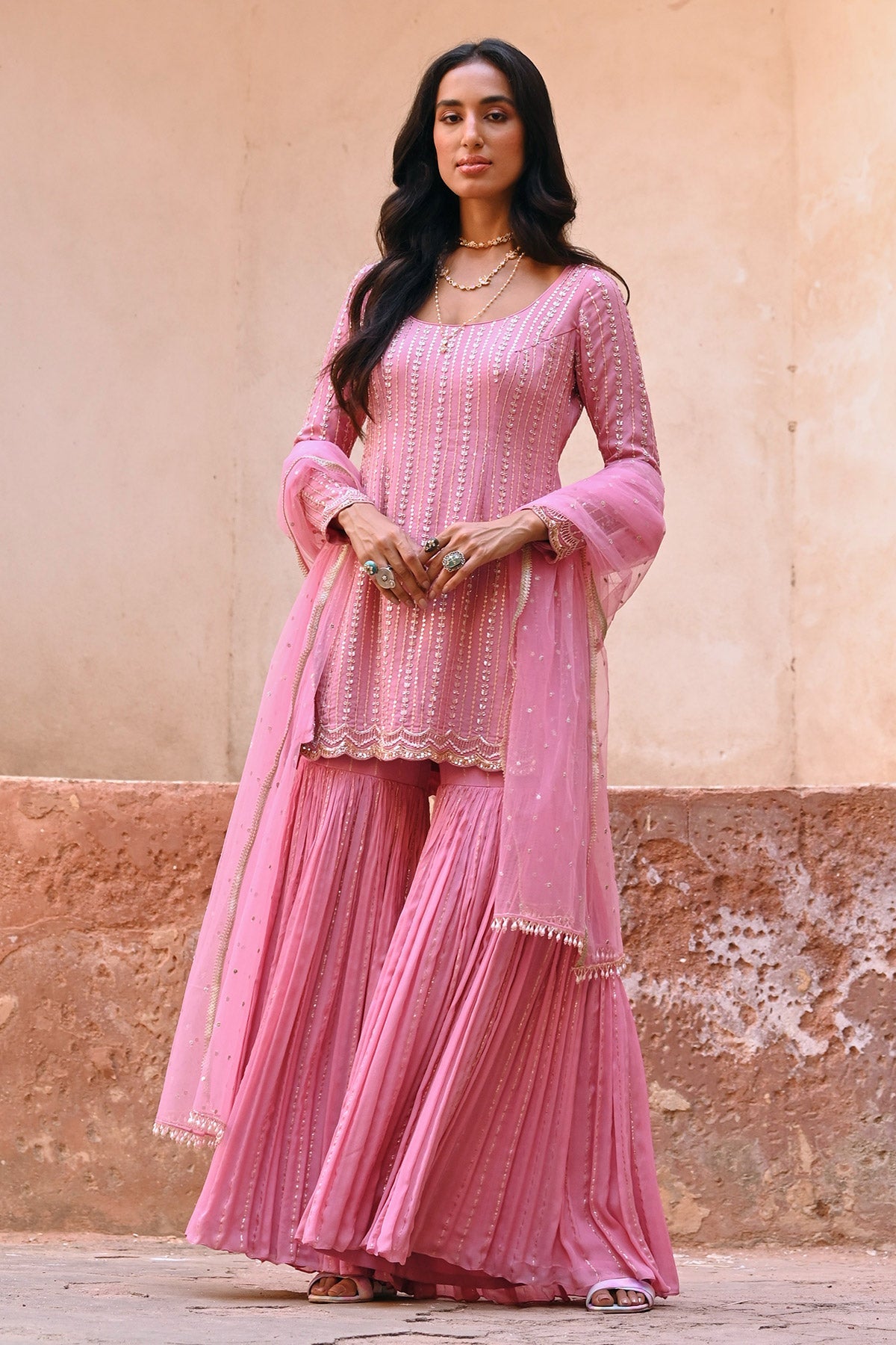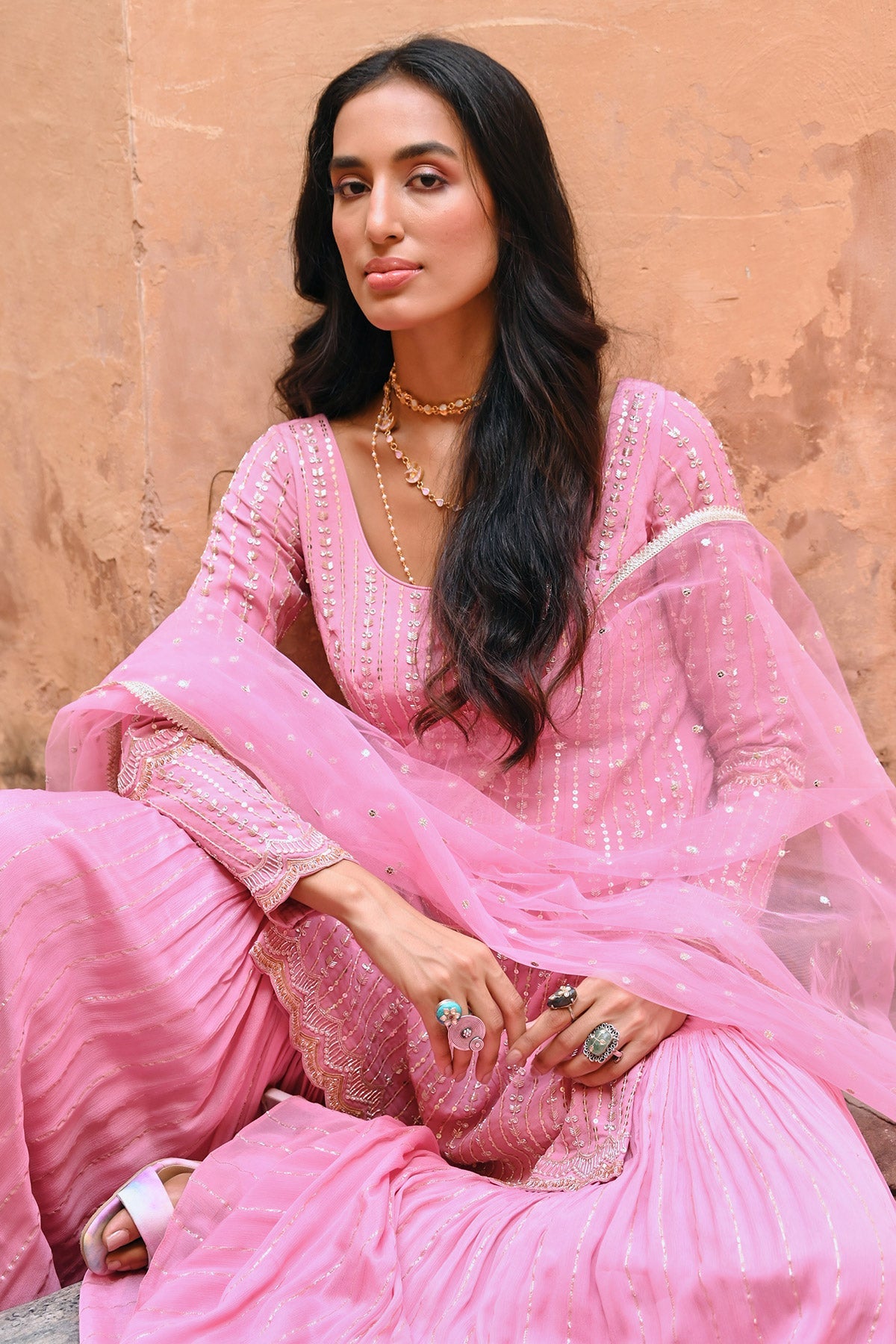 Crepe kurta with glassbeads and zardozi embroidery paired with flared pants and tulle dupatta.