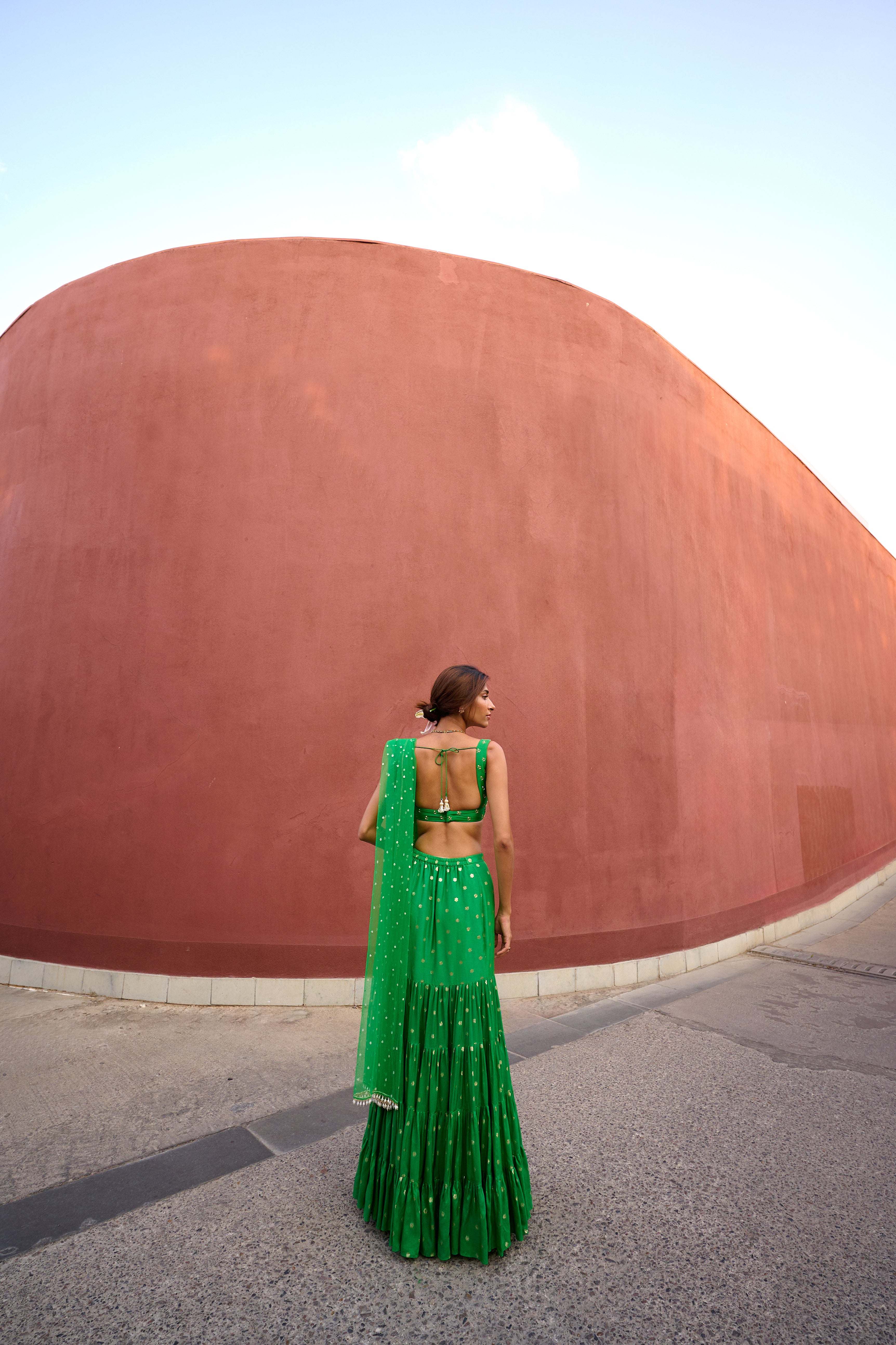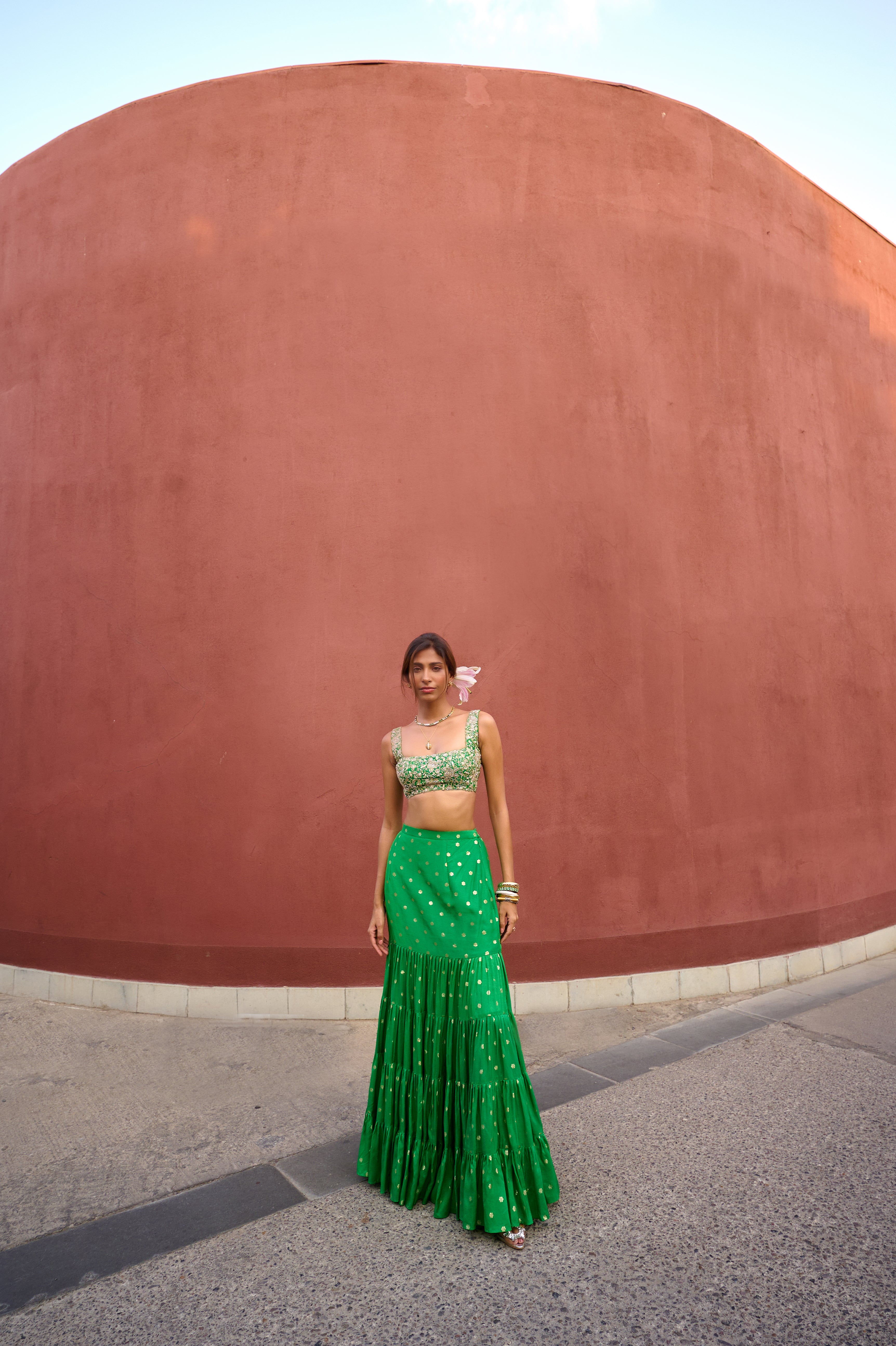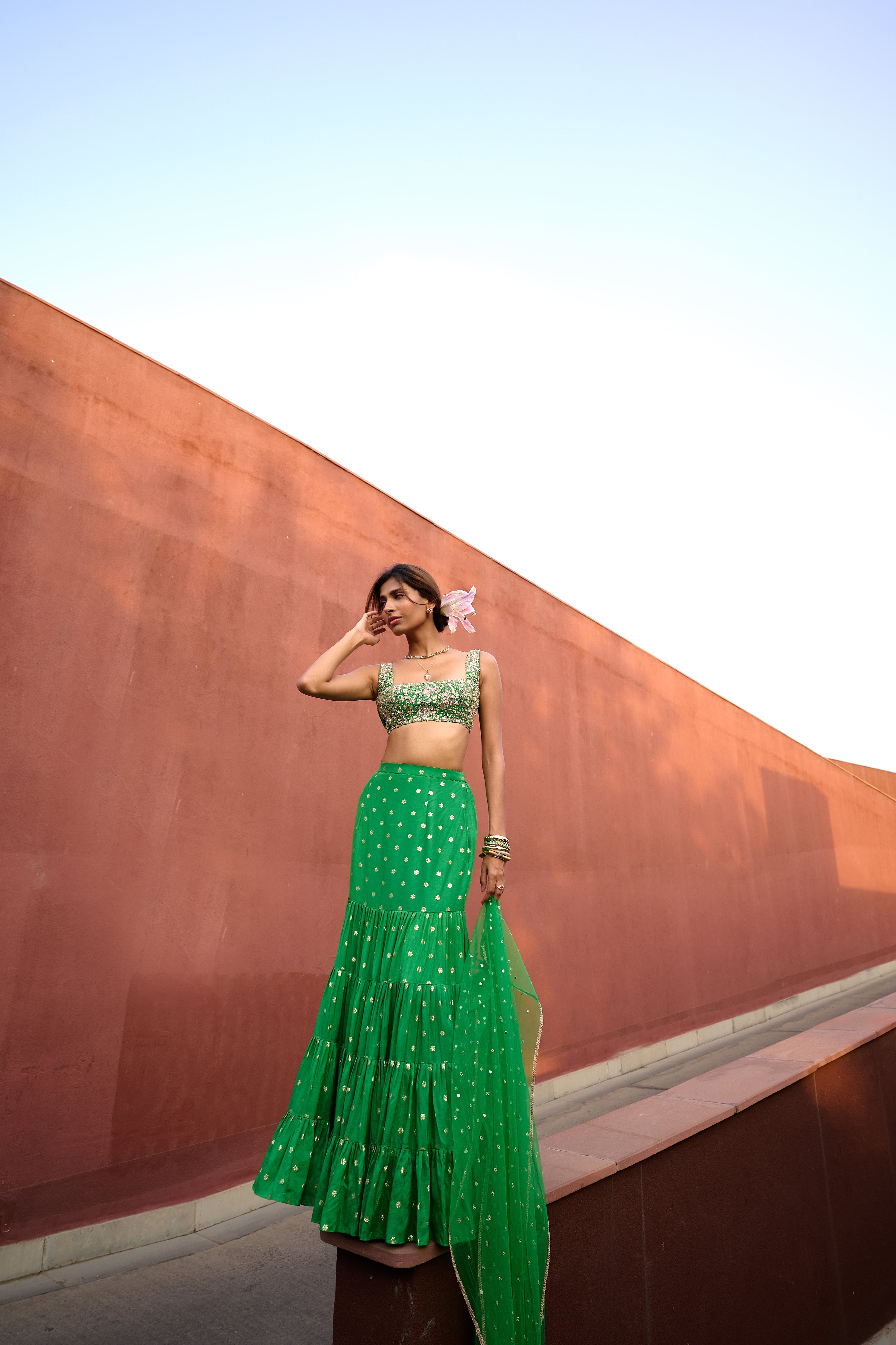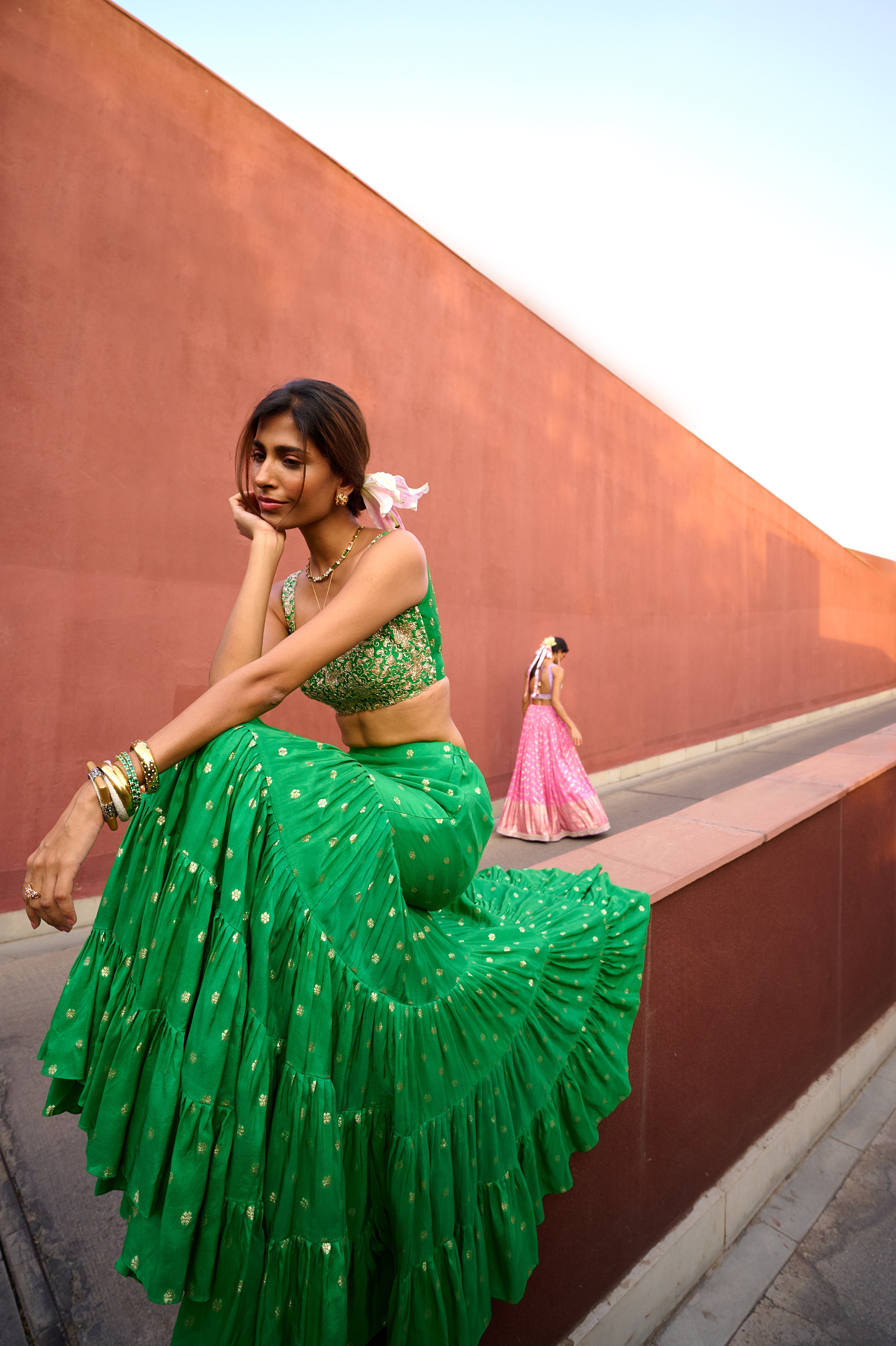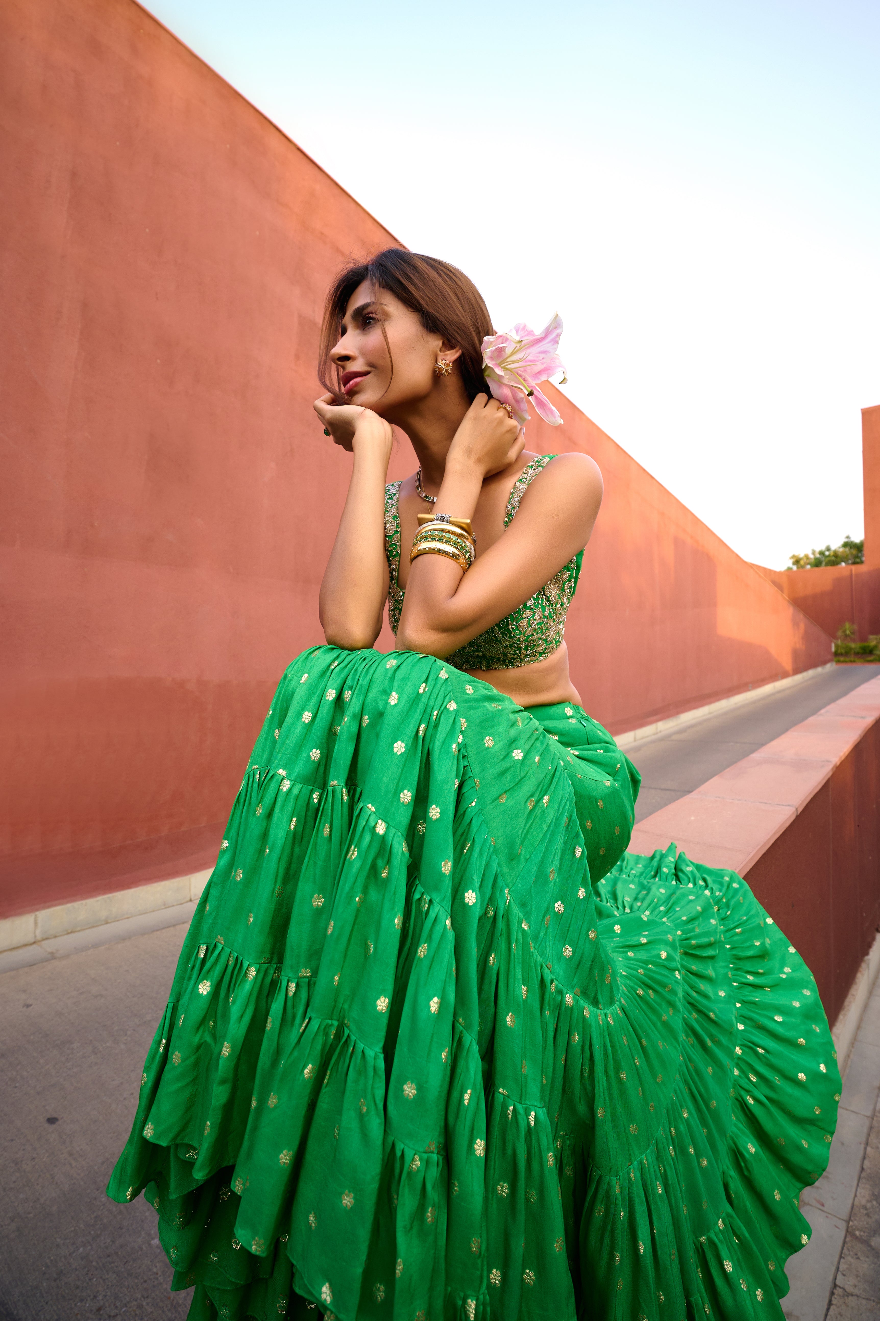 Green tiered jamewar fit and flared skirt paired with intricate zardozi work blouse and tulle dupatta.