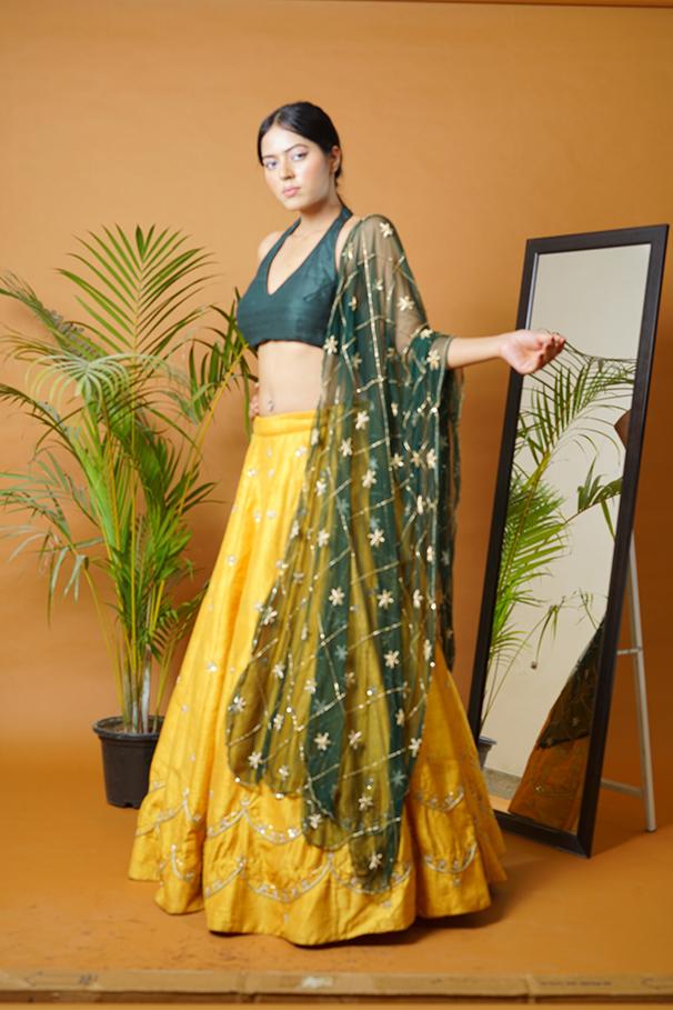 Green blouse and dupatta with mustard lehenga