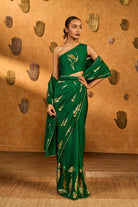 Details: The saree is a half-and-half design, featuring a beautiful placement foil print on the pleats and an all-over foil print on the crushed pallu. Blouse Peice - The blouse piece features beautiful embroidery at the center, adding an elegant touch to the design.