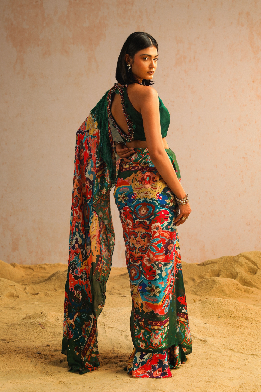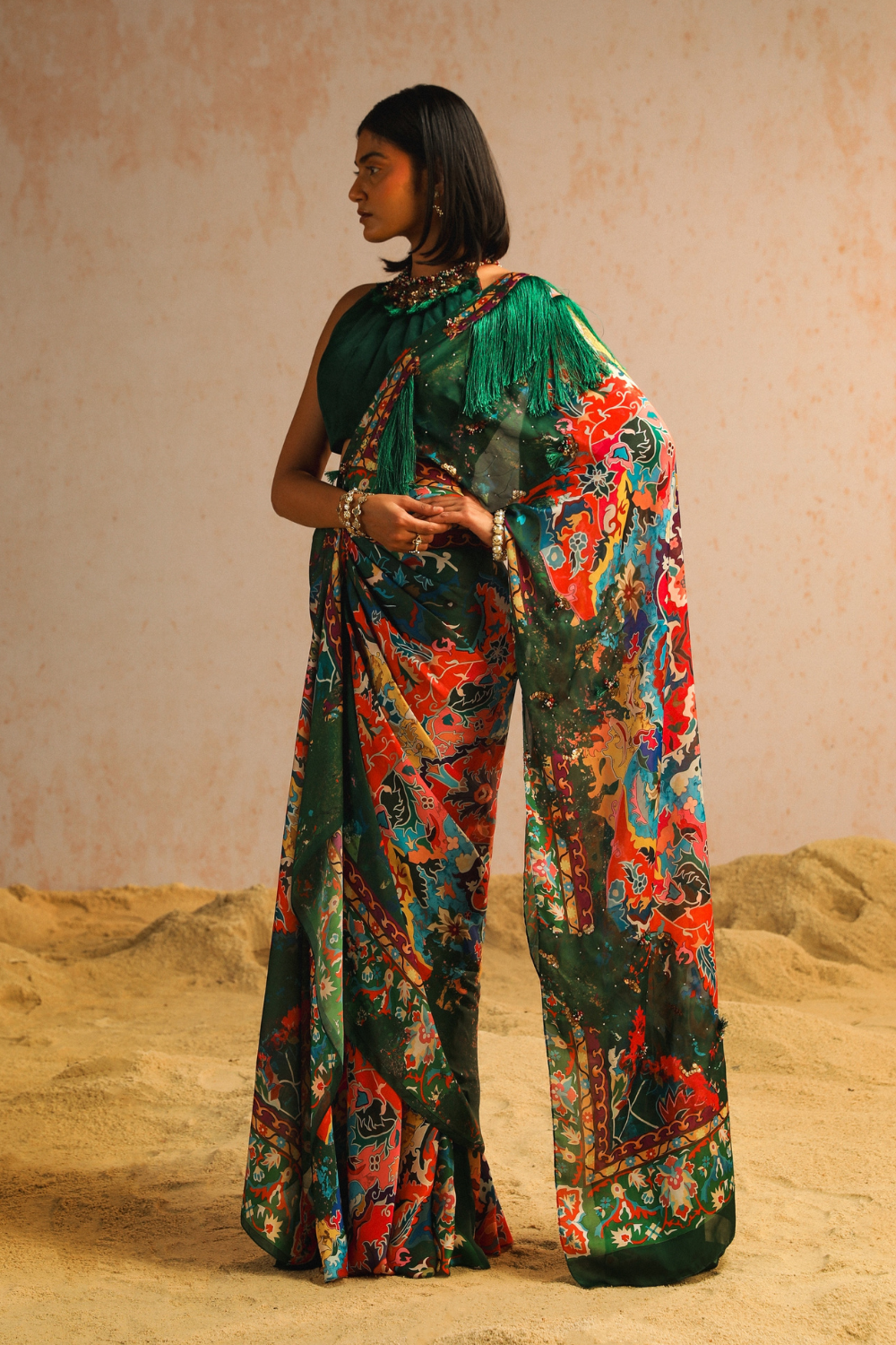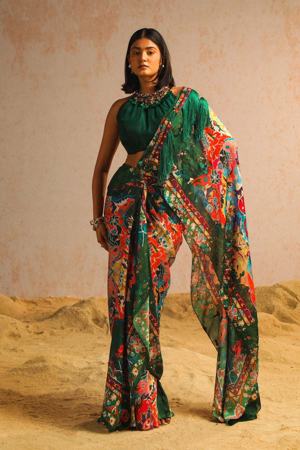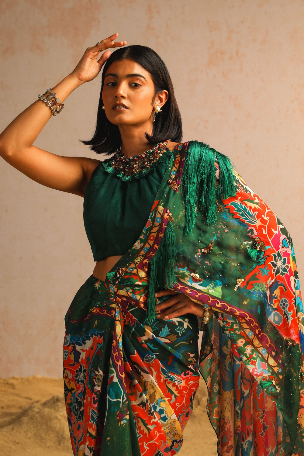 This green satin Georgette draped saree embodies our distinctive draping style, elegantly wrapping around the body to create fluid lines and graceful folds, adorned with intricate motif print inspired by Jan Kath's erased carpets. It is paired with a matching halter neck organza blouse lined with crepe. The blouse features a keyhole back and is adorned with intricate embroidery along the neckline. Vibrant hues, reminiscent of macaw plumage, infuse the ensemble with an exotic allure. The detailed aari and zardozi work, including sequins, pearls, tassels, and thick fringe borders on the dupatta's hem, add movement and artistic charm to the outfit.