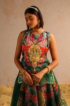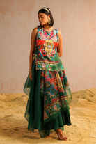 This captivating Green organza layered skirt drapes elegantly around the body, creating fluid lines and graceful folds. Adorned with intricate motif print inspired by Jan Kath's erased carpets, the skirt exudes a sense of artistic beauty. The combination of plain and printed organza adds a sophisticated charm, enhancing its feminine appeal. Paired with a short kurta in matching tones, the ensemble is further enhanced by the embroidered neckline, both at the front and back, which adds a touch of intricacy and detail. The meticulous aari and zardozi work, featuring sequins, pearls, and tassels, brings movement and artistic elegance to the outfit, while vibrant hues reminiscent of macaw plumage create an exotic allure.