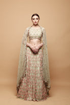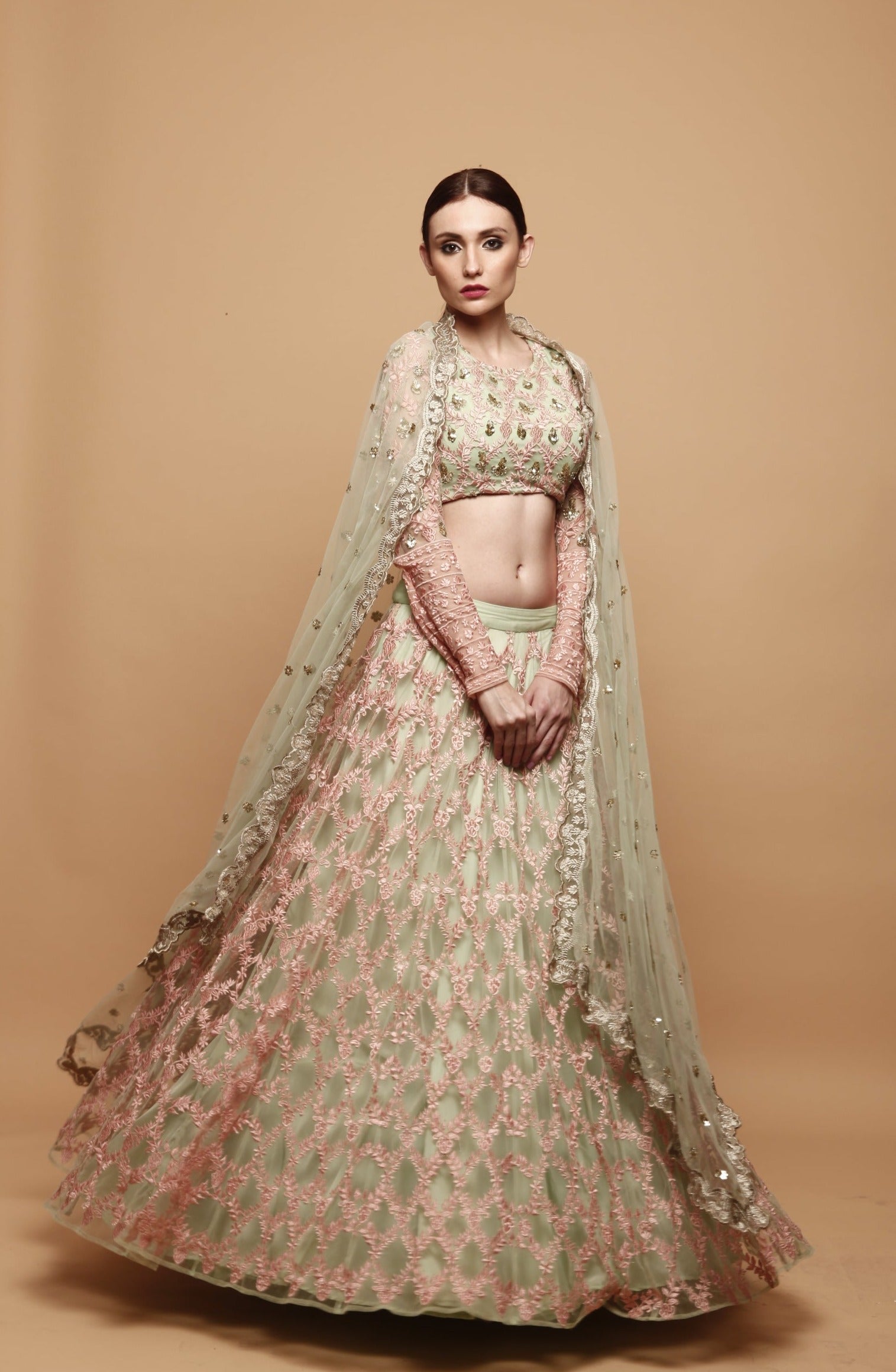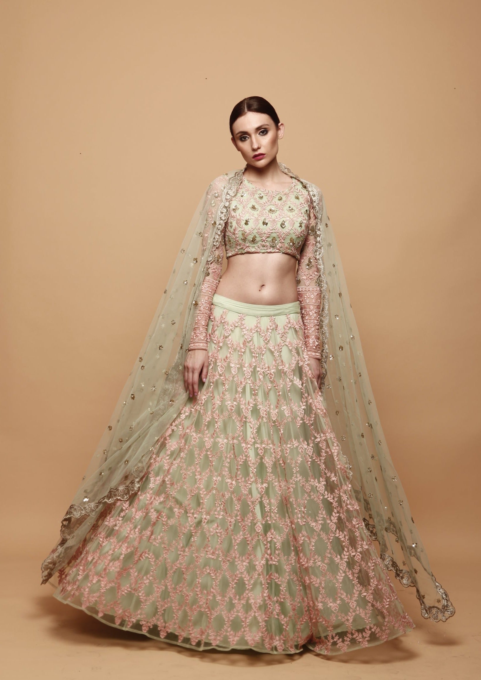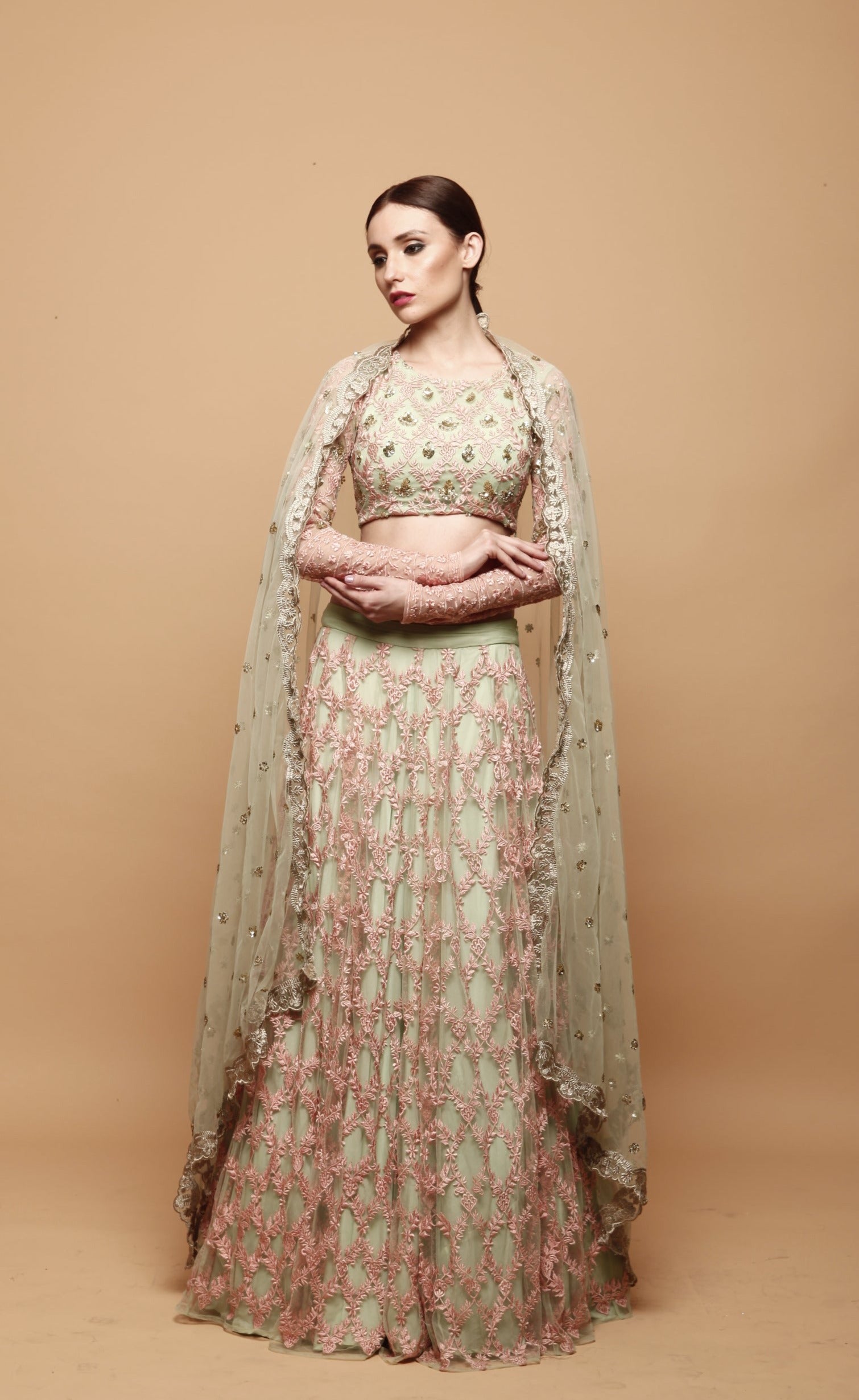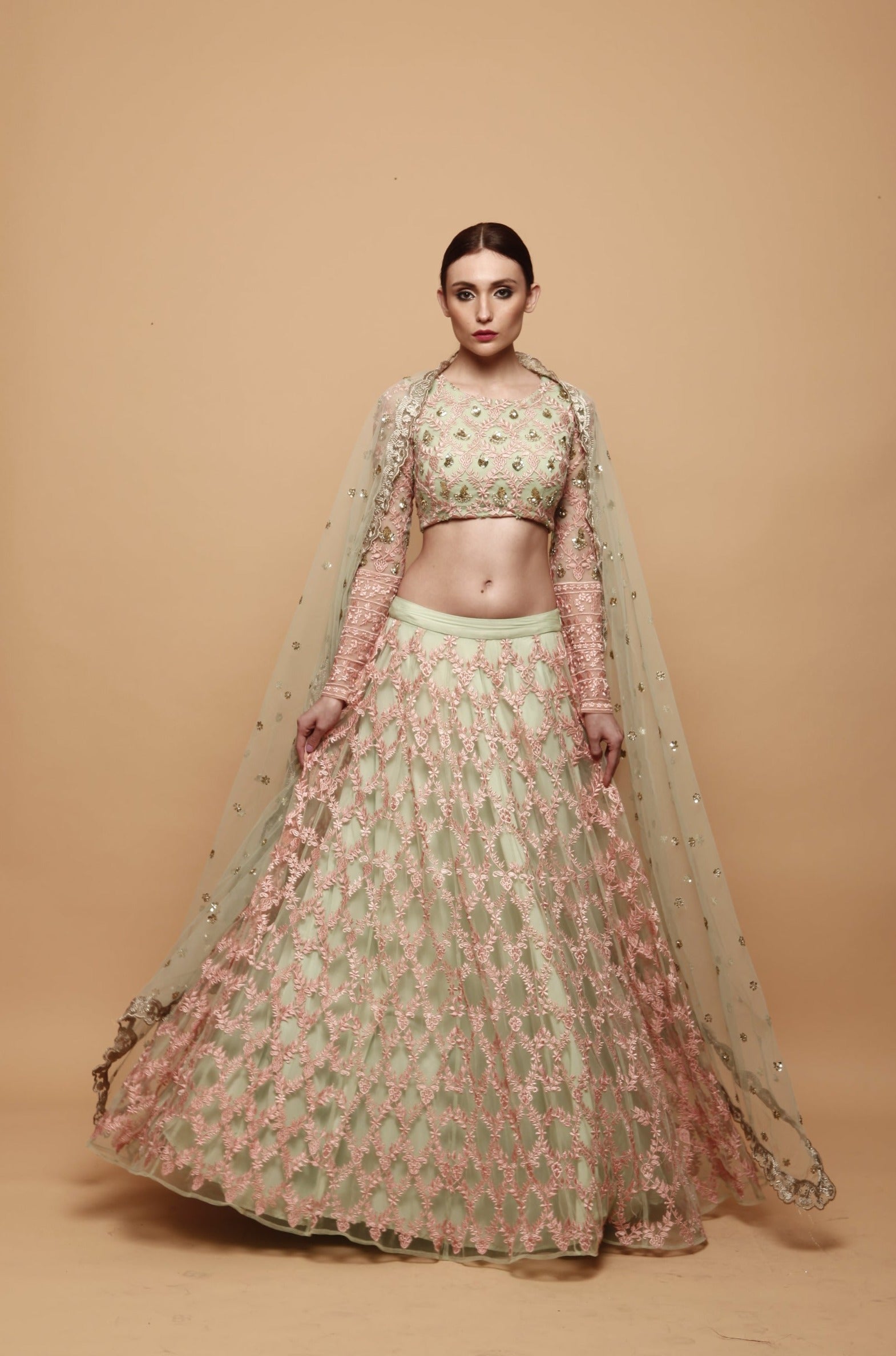 Featuring a GREEN LEHENGA WITH PINK THREADWORK IN NET.