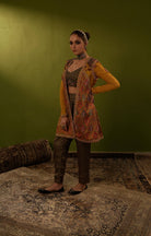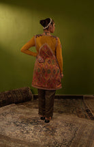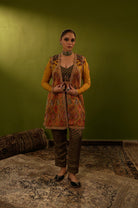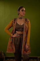 This Green Satin Georgette Pant set, features a matching crop top and a mustard yellow woven jamawar jacket accessorized with our iconic haathi belts. Adorned with delicate aari and zardozi work using sequins, pearls, and tassels, this ensemble exudes elegance and artistry in every detail.