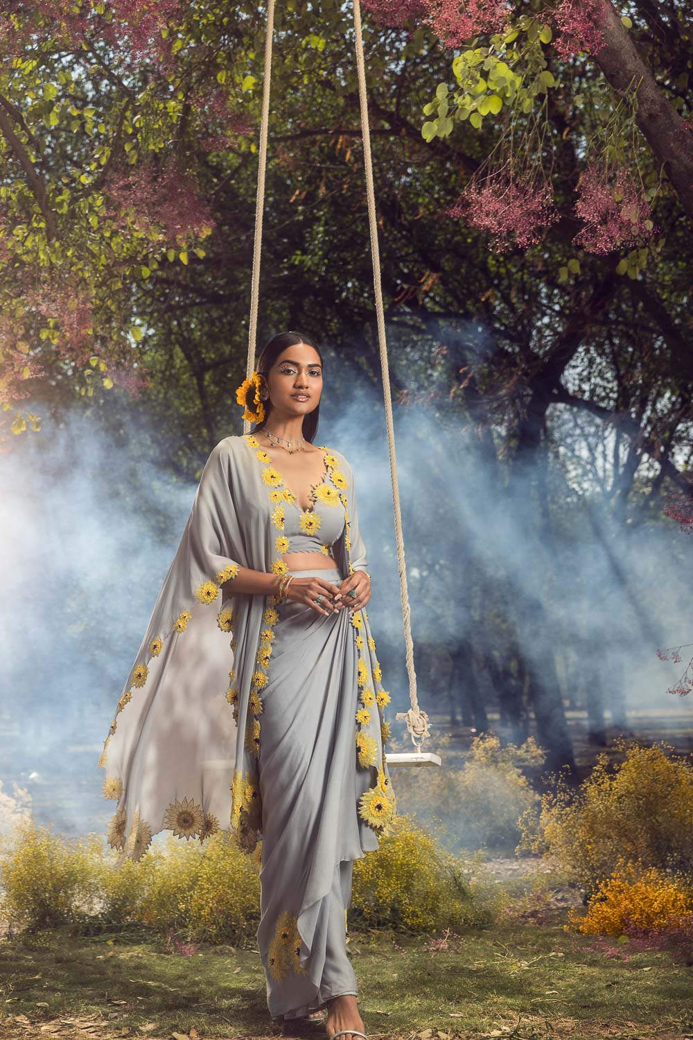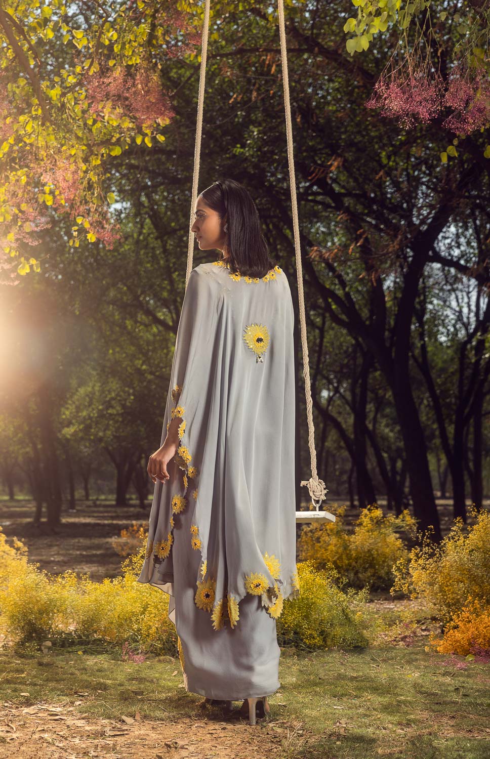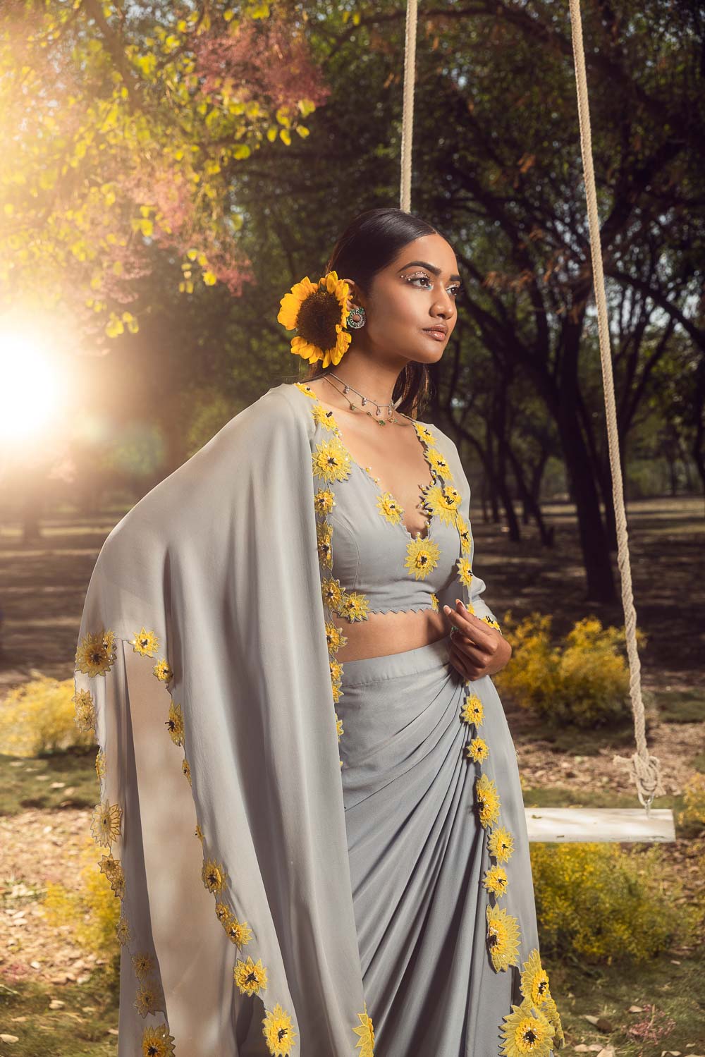 Grey draped georgette skirt paired with a blouse and open jacket embroidered with 3-d appliqued sunflower motifs highlighted with resham, beads and crystals