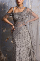 Grey Georgette draped saree with a net blouse and pallu embroidered in gunmetal and silver dori, beads, and crystals.