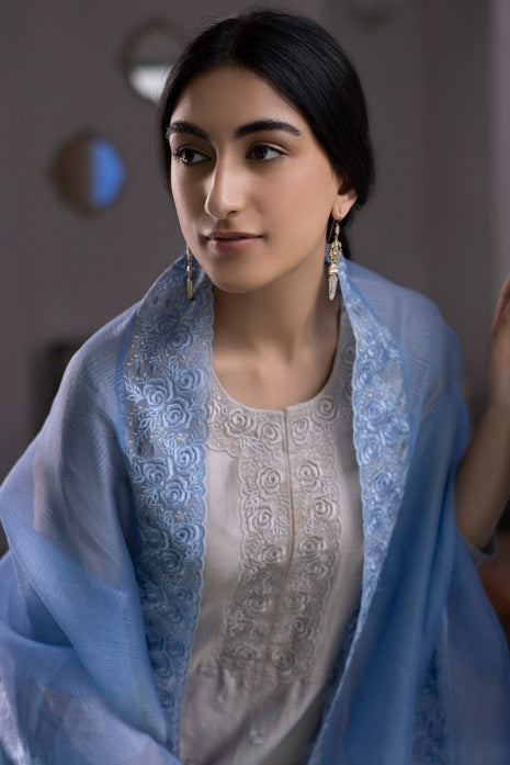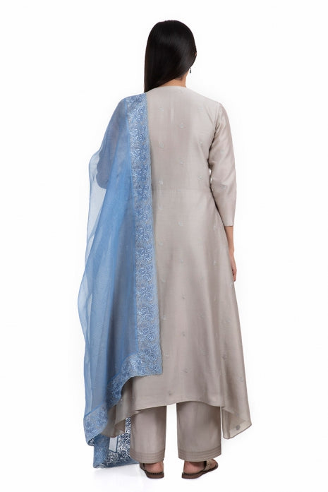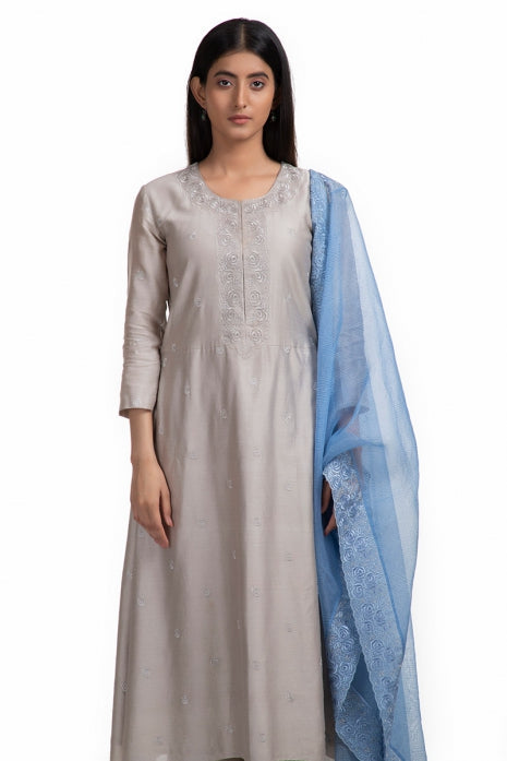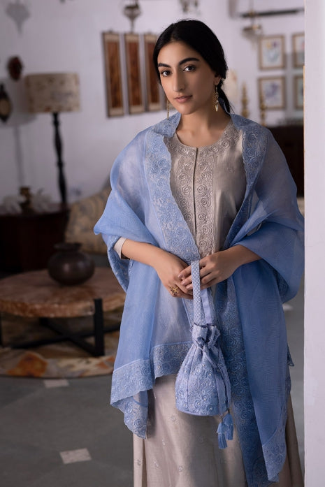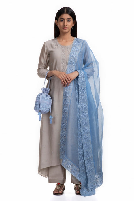 A Grey Handwoven Chanderi kurta paired with Grey Cotton Pants and an Ice Blue Block Printed Silk Organza dupatta, embellished with Silk thread embroidery, creating an understated chic look.