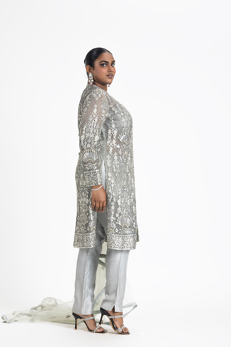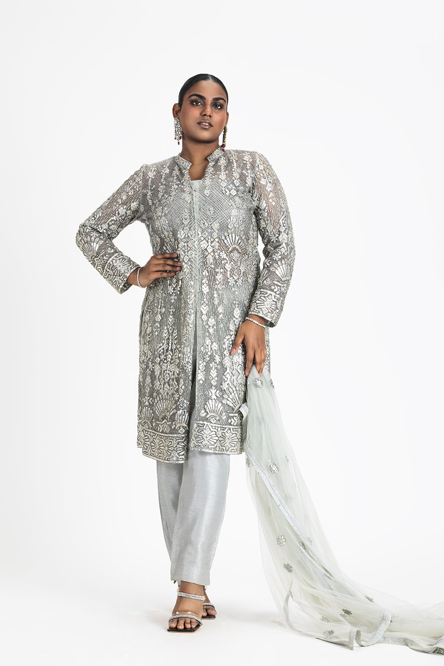 Grey Net Jacket And Dupatta, Embroidered In Silver Leather Appliqu? Highlighted With Silver Beads, Sequins, And Crystals, Accompanied By A Raw Silk Bustier And Trousers.