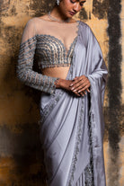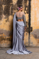 Steel Grey Satin and Lace draped saree with a trail with a nude net blouse embroidered in grey dori with gunmetal sequins, crystals, and beadwork.