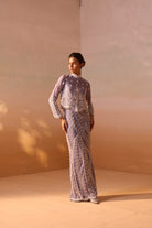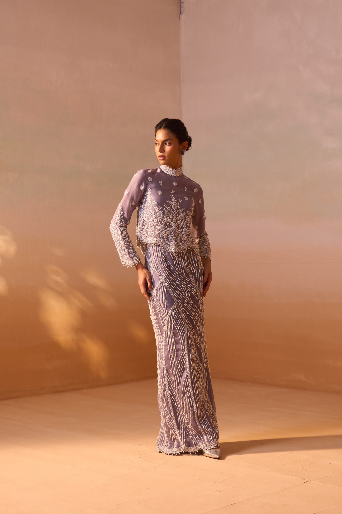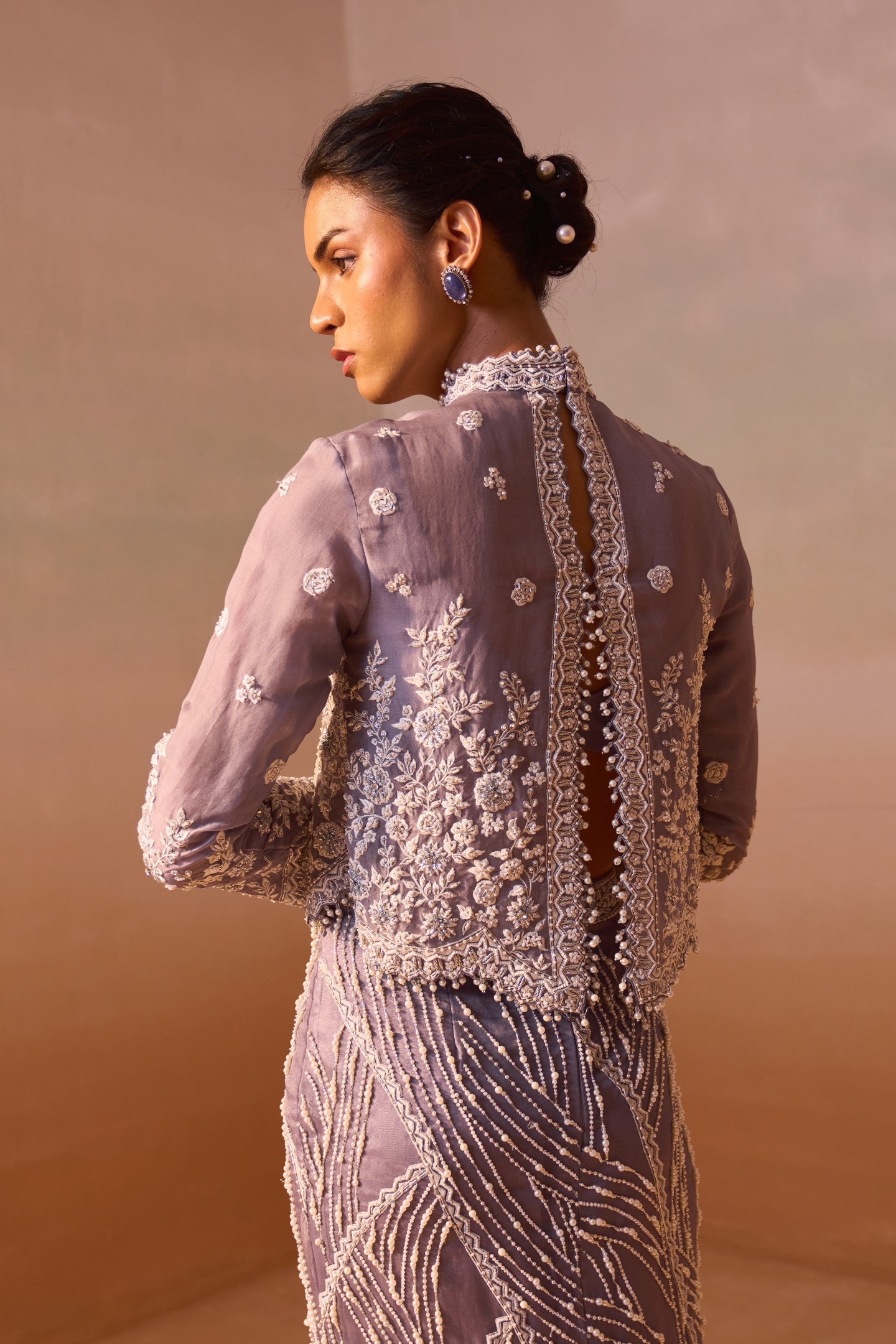 Grey lilac organza short cape with a slit skirt embellished with ivorythread work touched up with pearls, sequins, and crystals, accompanied with a bustier.