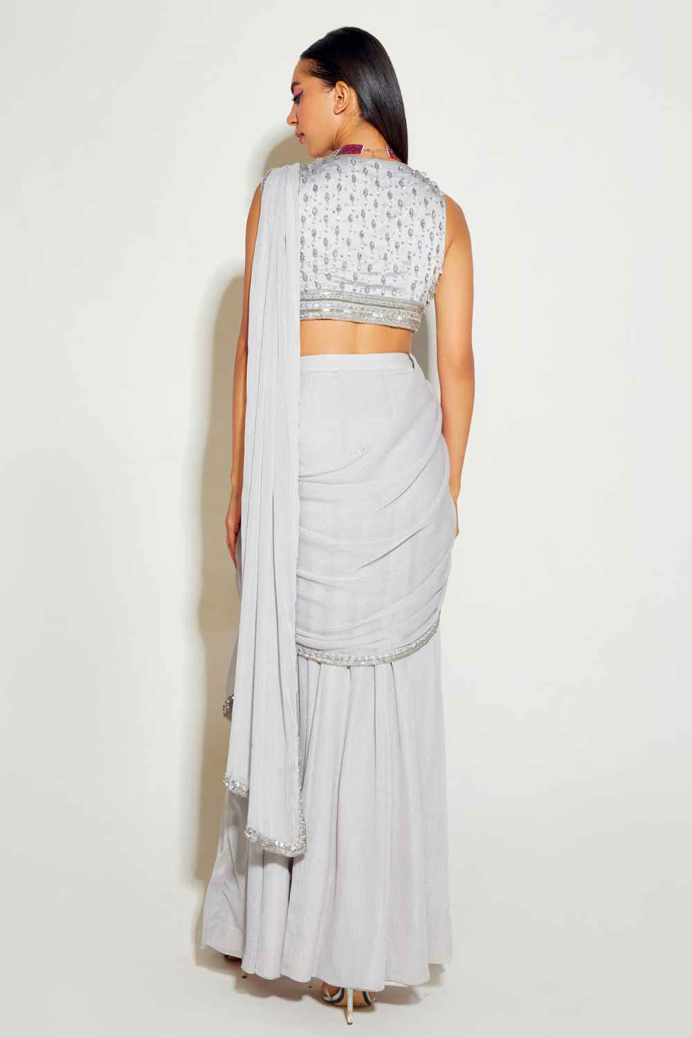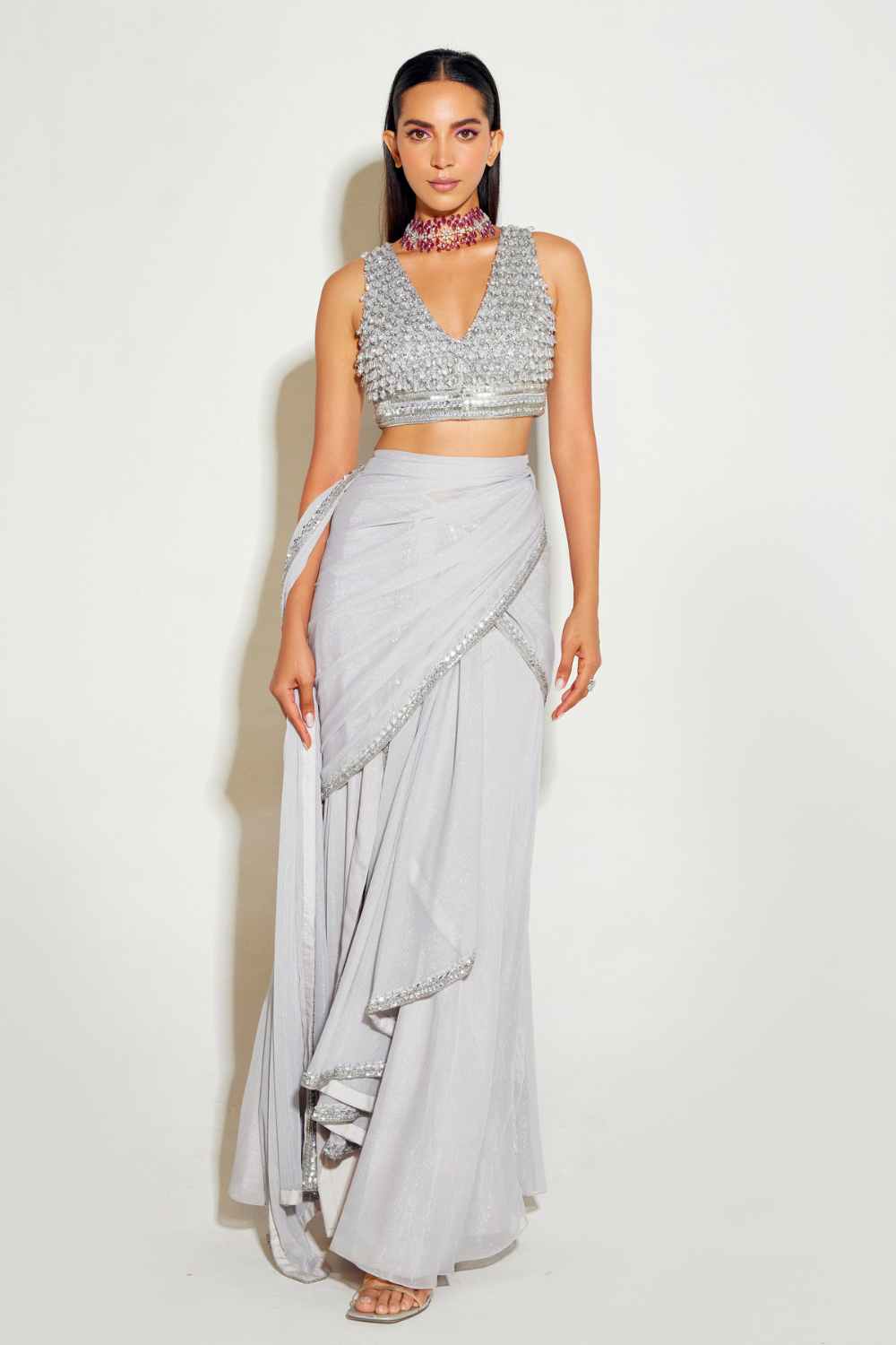 Grey hand embroidered blouse with glass beads drops all over the blouse, It is paired with a metallic georgette pre-draped slit saree. The saree has embroidered biased layers, an embroidered palla and hand embroidered 3 D flower brooch with cascading drops.